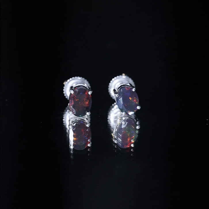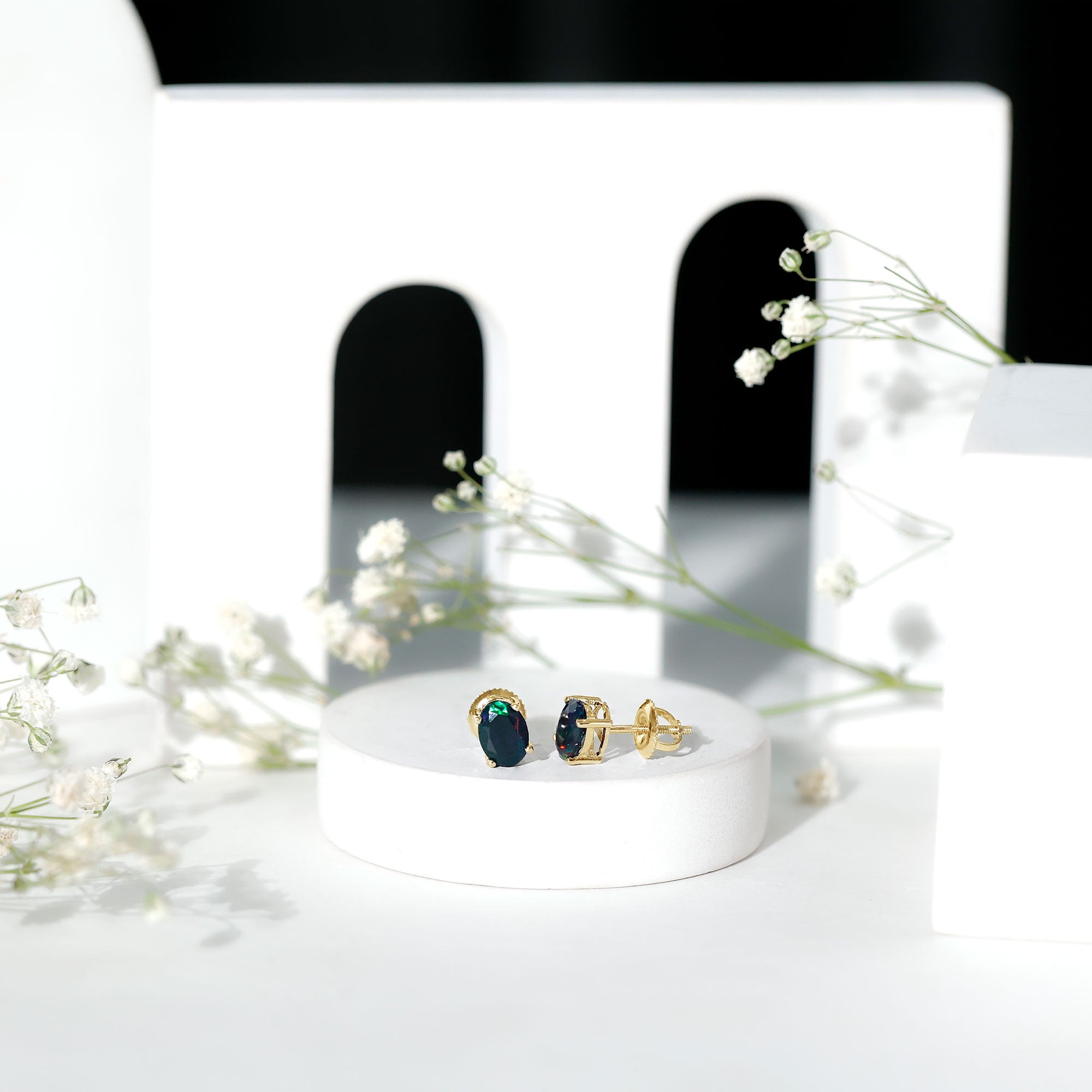 Enhance your style with a hint of elegance and sophistication using these Black Opal Stud Earrings. Each earring showcases a 5X7 MM oval cut black opal, securely set in 4-prong setting. The Solitaire Earrings come with screw back closures, ensuring they remain comfortably in place all day long. They are lightweight and easy to wear, making them ideal for daily wear as well as special events. The sleek design ensures comfort, allowing you to wear them for hours without any irritation. Black opal carries significant meaning, often linked to strength, creativity, and protection. Thus, these October Birthstone Earrings serve not only as a lovely accessory but also as a meaningful symbol. They make a perfect gift for birthdays, anniversaries, or simply to express your affection. These Oval Stud Earrings blend timeless elegance with a contemporary touch, adding a splash of color and sophistication to any outfit, whether it is casual or formal.