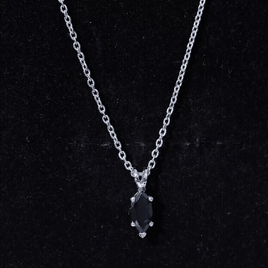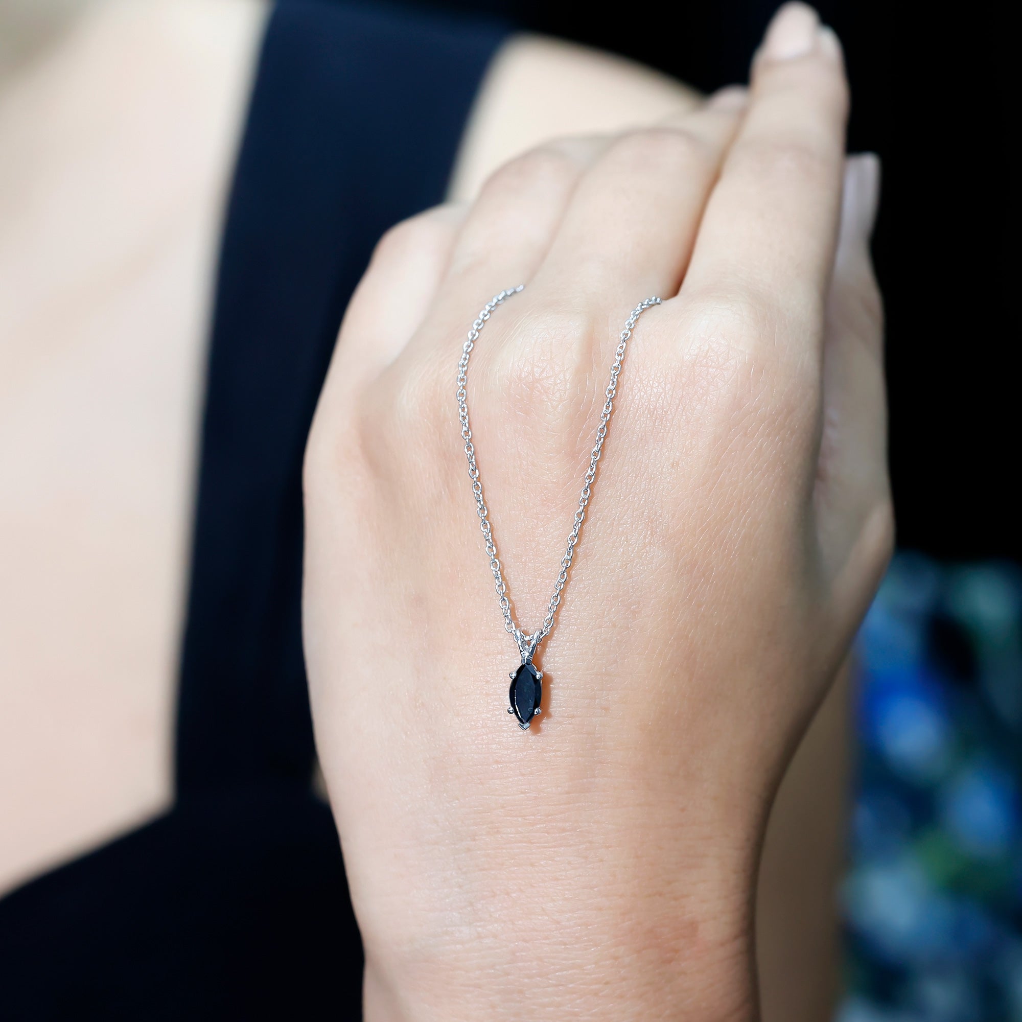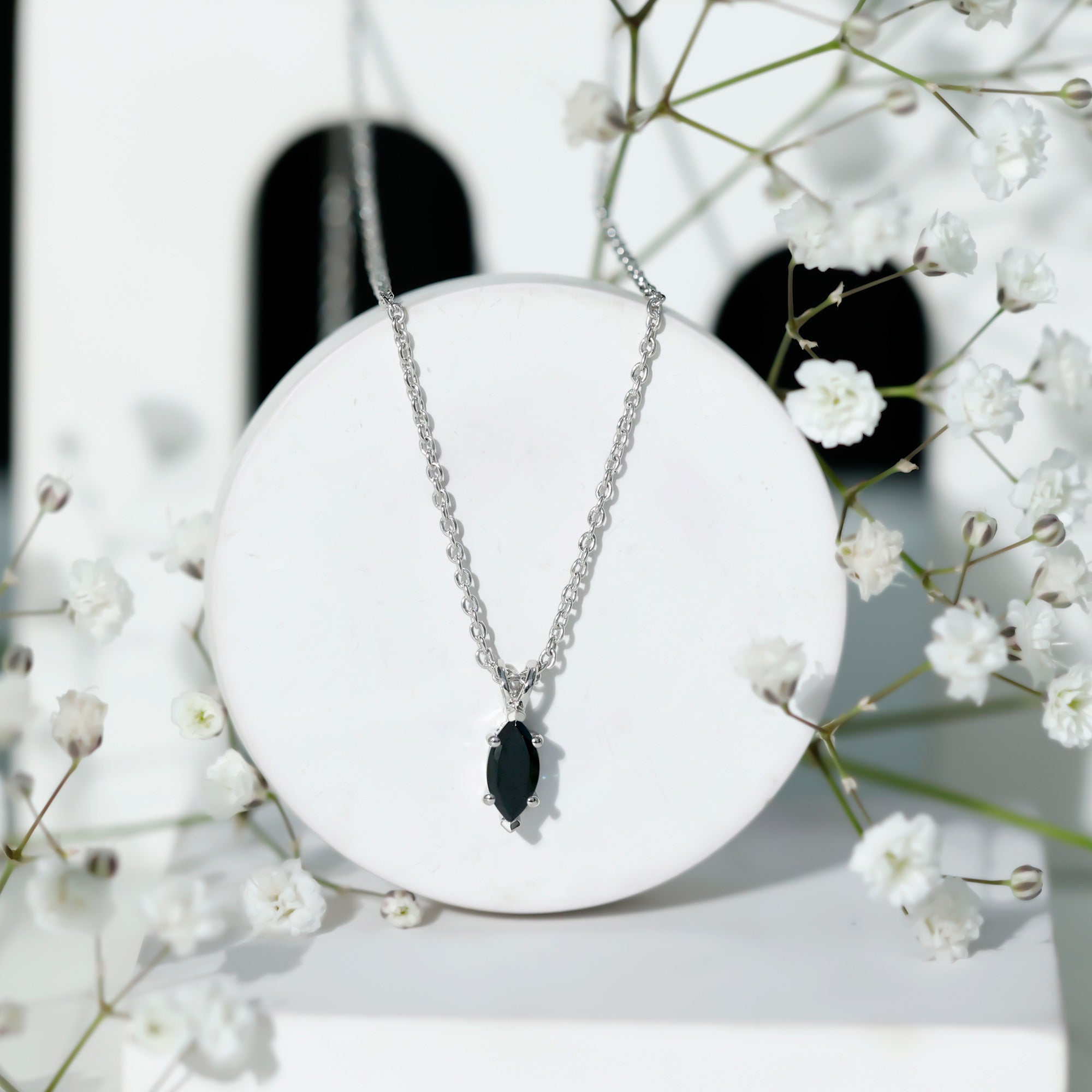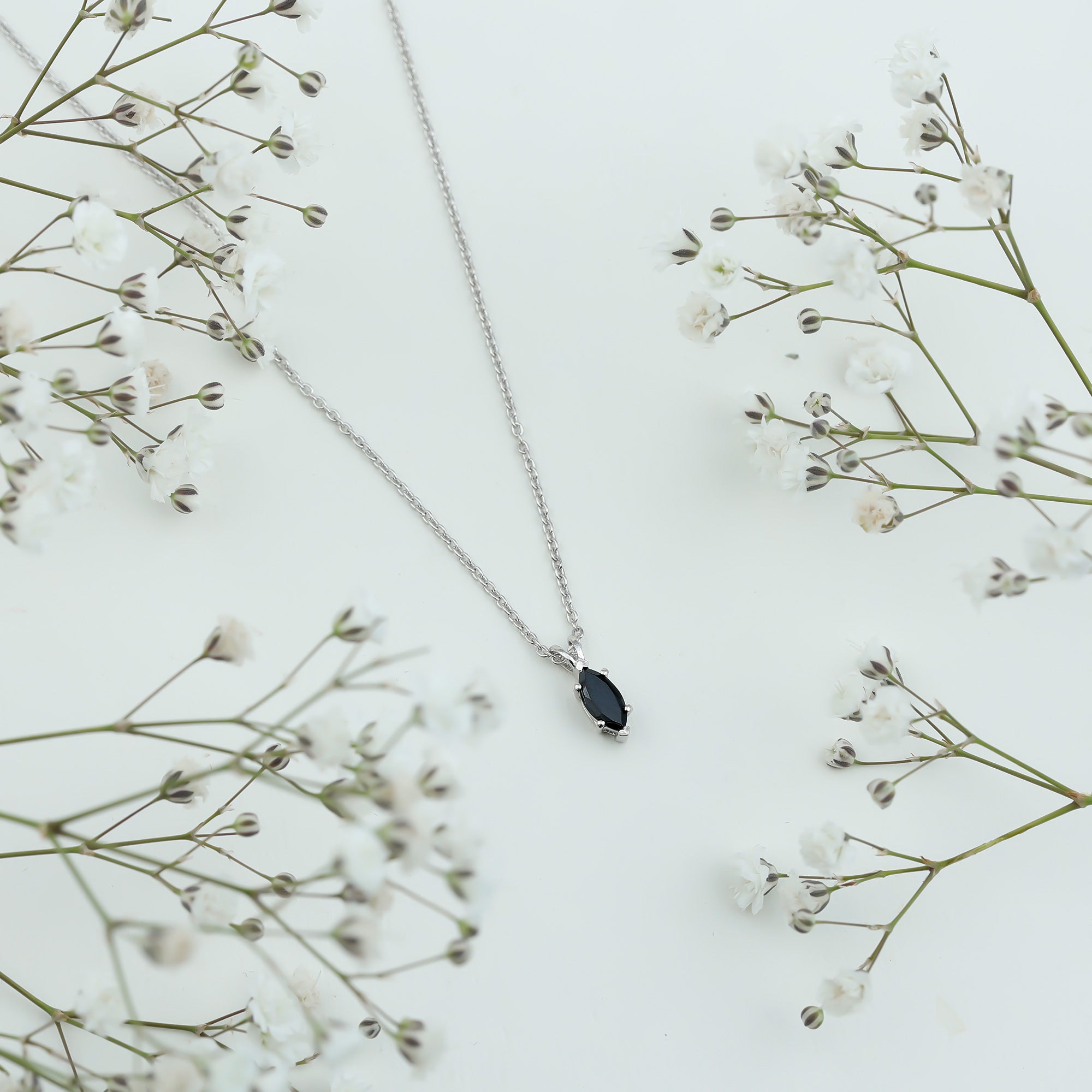 This Black Spinel Pendant beholds an intense hue that decorates the neckline, precisely crafted with 14K White Gold Plated Silver. The pendant features a 4X8 MM Marquise Shape Black Spinel securely placed in Prong Setting. This Solitaire Pendant dazzles with AAA quality Black Spinel and dangles with a sturdy cable chain that allows you to adjust it as per your style. The healing properties of Black Spinel make this pendant a thoughtful gift for your lady that will strengthen her immune system, improves the sleep and detox her body. This single stone pendant can be styled either solely or can be layered with other necklaces to achieve a statement look. This Marquise Necklace will be sent to you in a velvet pouch with the certificate of authenticity.