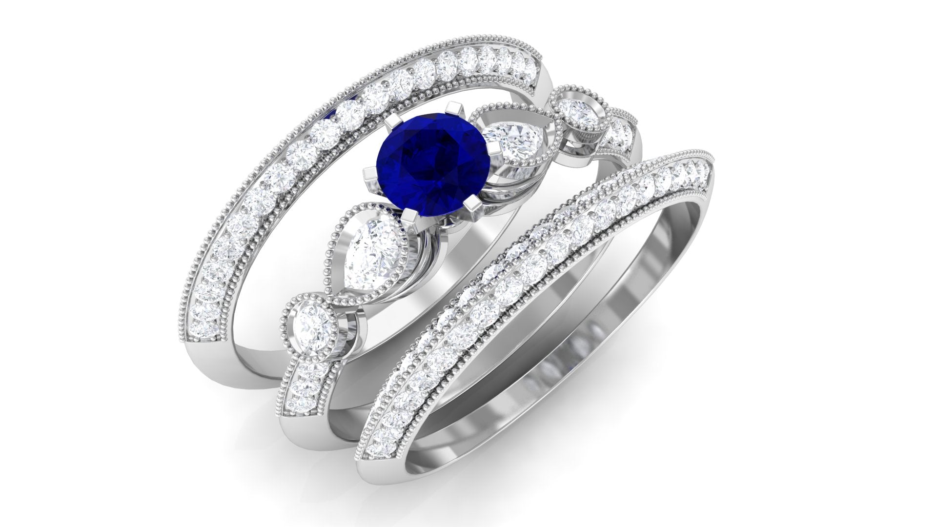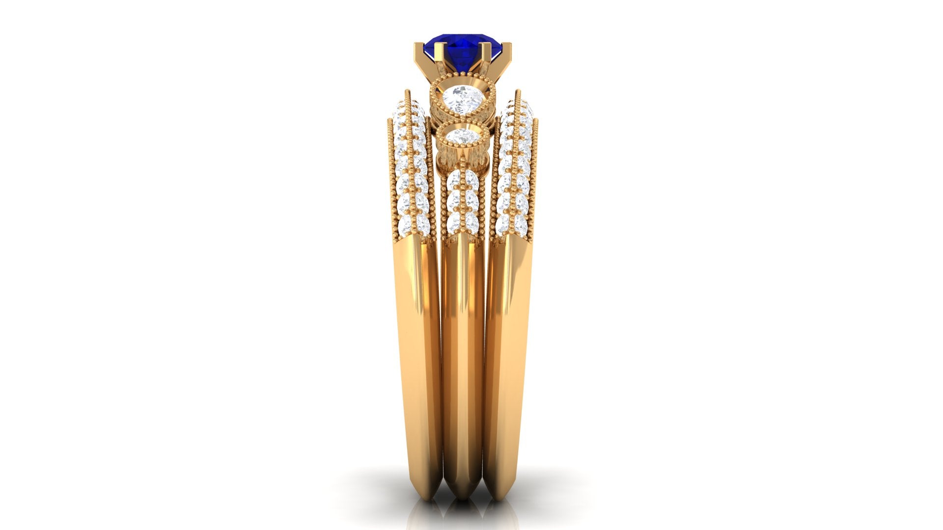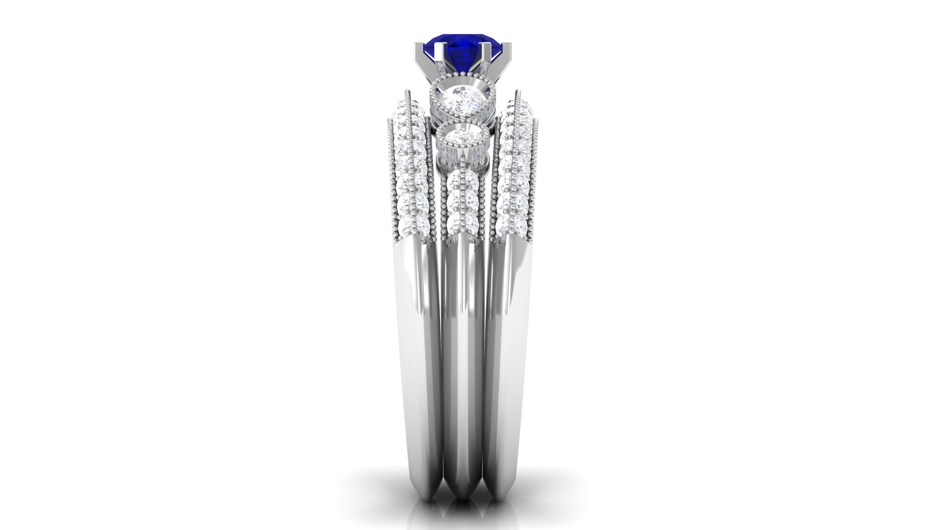 This beautiful Bridal Ring Set is adorned with Blue Sapphire and Diamond to make for a gorgeous choice for special occasions. Milgrain beaded details on the Band give a vintage appeal to this Wedding Ring Set.