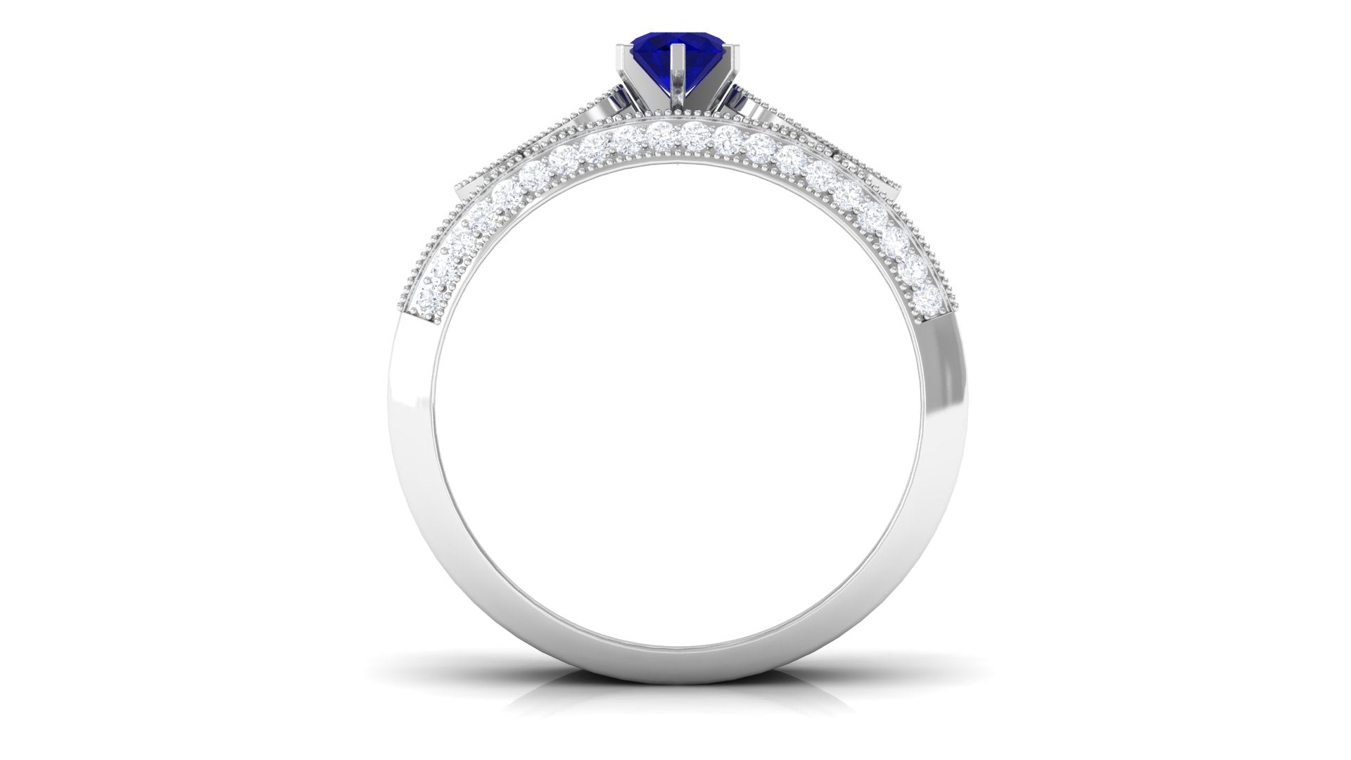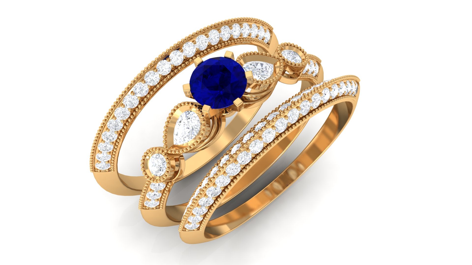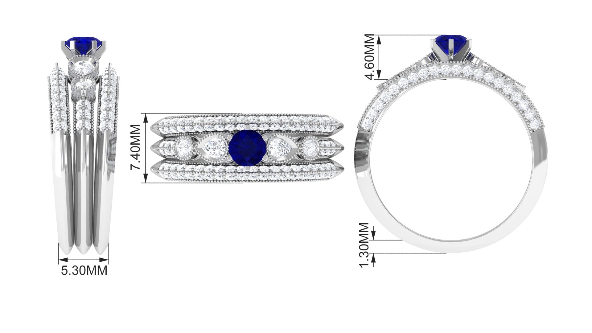 This beautiful Bridal Ring Set is adorned with Blue Sapphire and Diamond to make for a gorgeous choice for special occasions. Milgrain beaded details on the Band give a vintage appeal to this Wedding Ring Set.