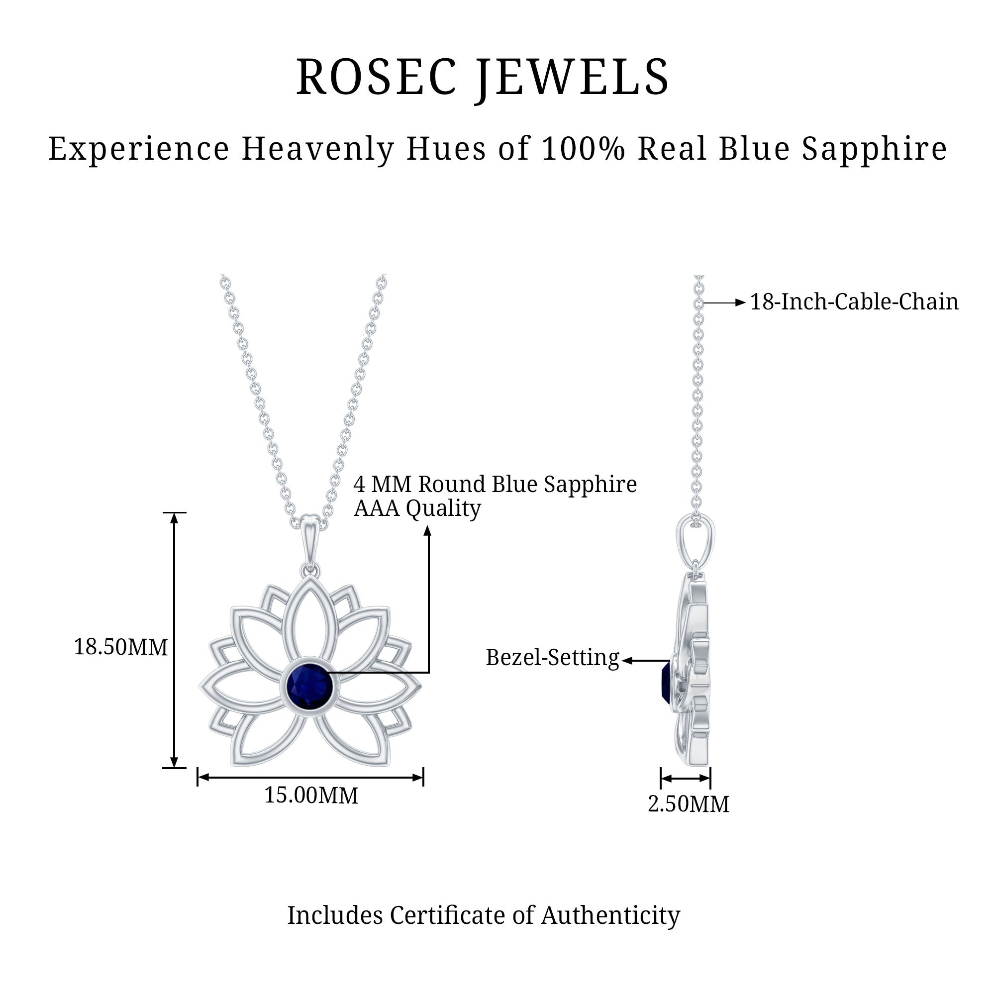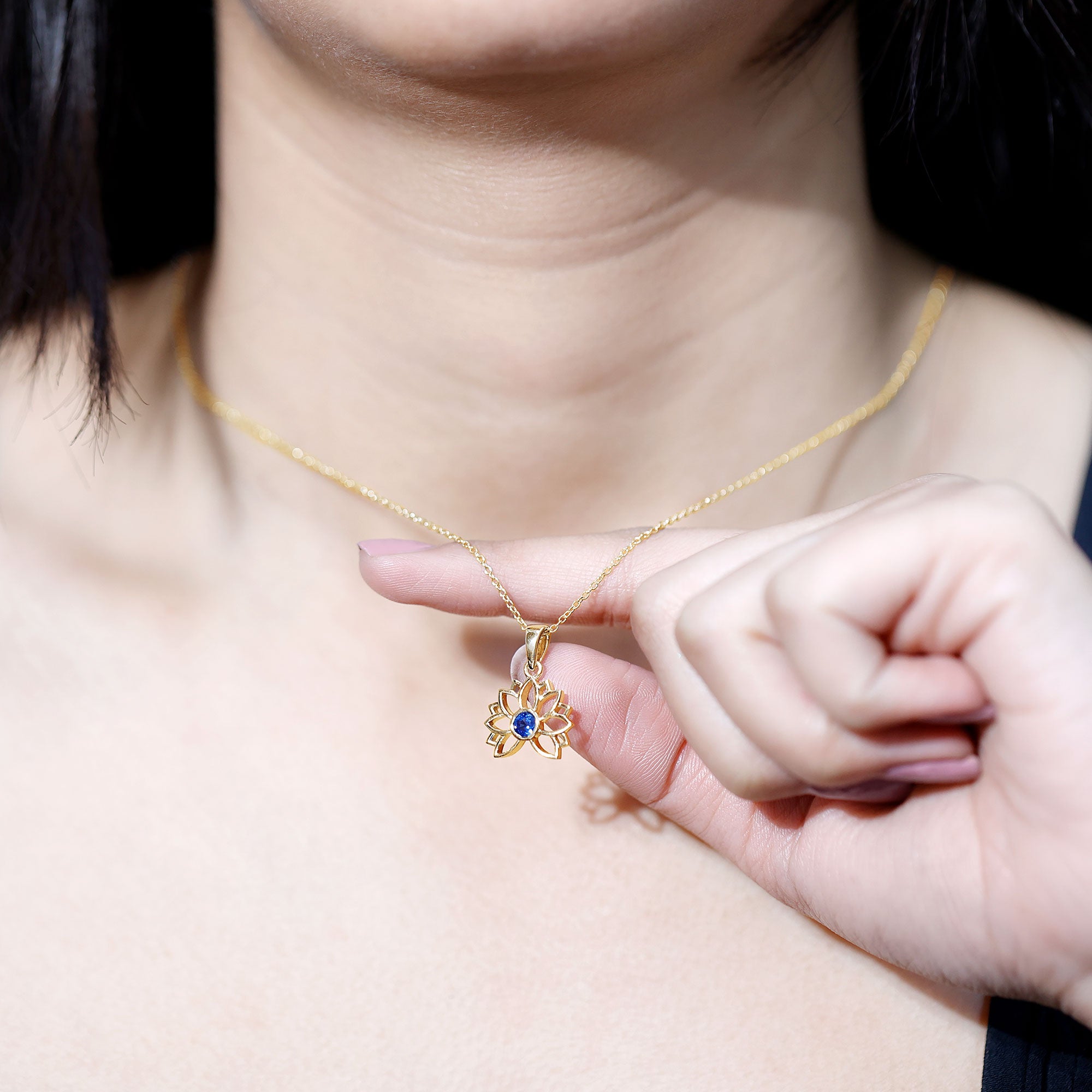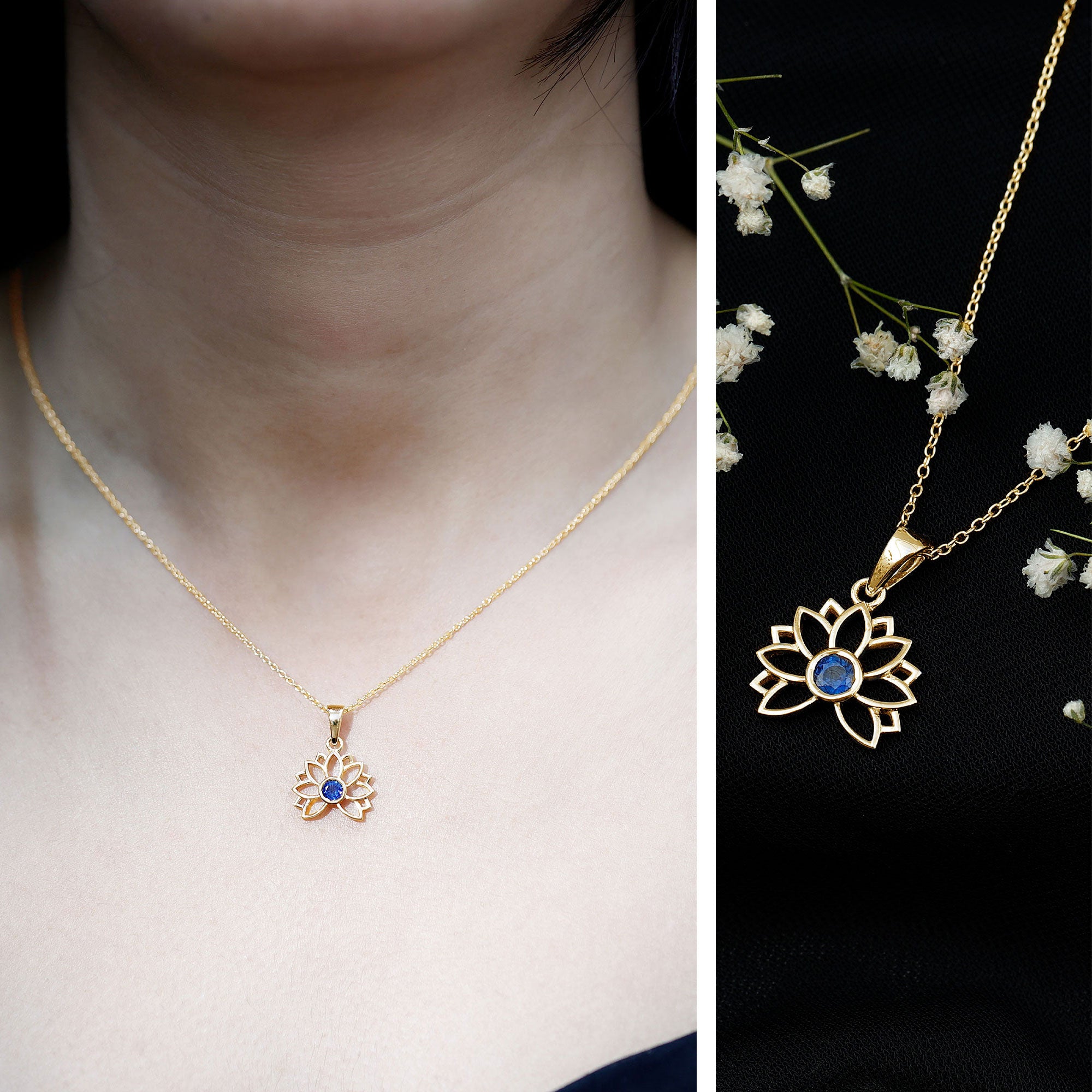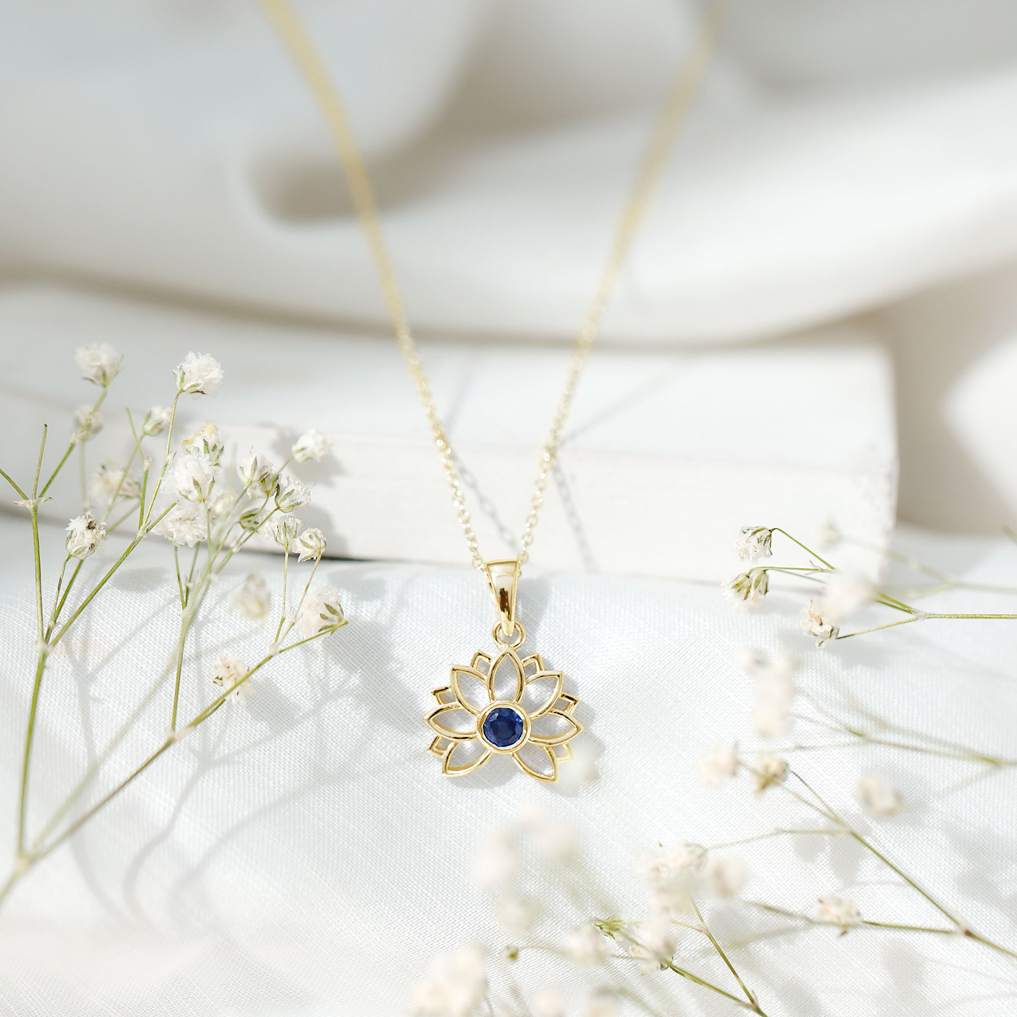 A lotus in full bloom carries a quiet strength, and this Blue Sapphire Necklace captures that beauty in the most graceful way. Inspired by the flower that rises from still waters, the Lotus Pendant Necklace symbolizes purity, renewal, and the journey toward inner peace. Curated with a round blue sapphire, securely set in bezel setting. Each petal of the lotus is shaped with gentle curves, creating a harmonious frame around the sapphire and giving the Sapphire Flower Necklace a peaceful and uplifting presence. Known as a gemstone of wisdom and clarity, the sapphire complements the lotus perfectly, making this piece both meaningful and visually captivating. Crafted with AAA quality blue sapphire, the necklace is designed with durability, brilliance, and careful attention to detail. Suspended from a comfortable matching chain, the September Birthstone Necklace sits beautifully along the neckline, making it easy to wear every day or on special occasions.
