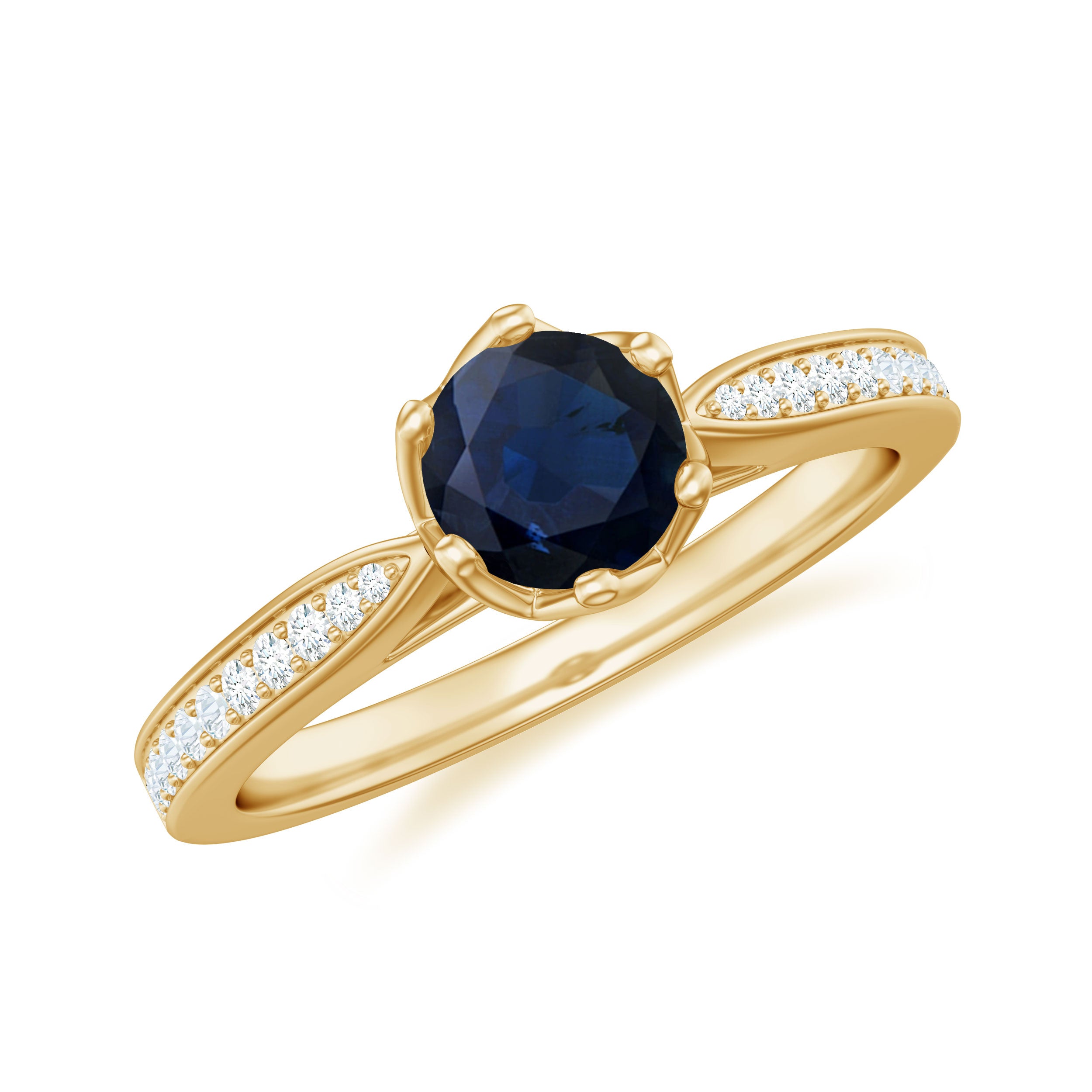 Surprise her with a mesmerizing and glamorous engagement ring. This floral ring features a stunning Round Shape blue sapphire at its center, set in a lotus basket setting and accented by sparkling Diamond side stones. It is a true work of art that shell treasure for a lifetime.