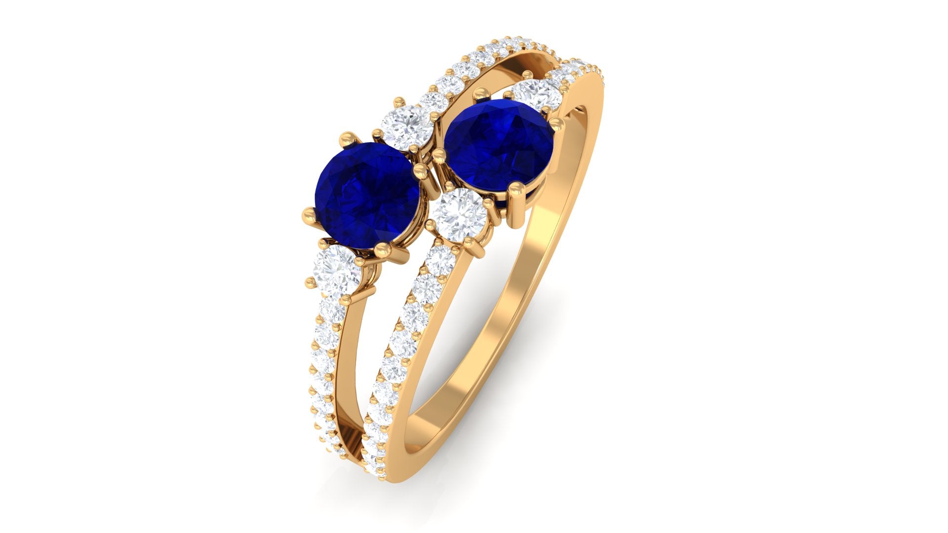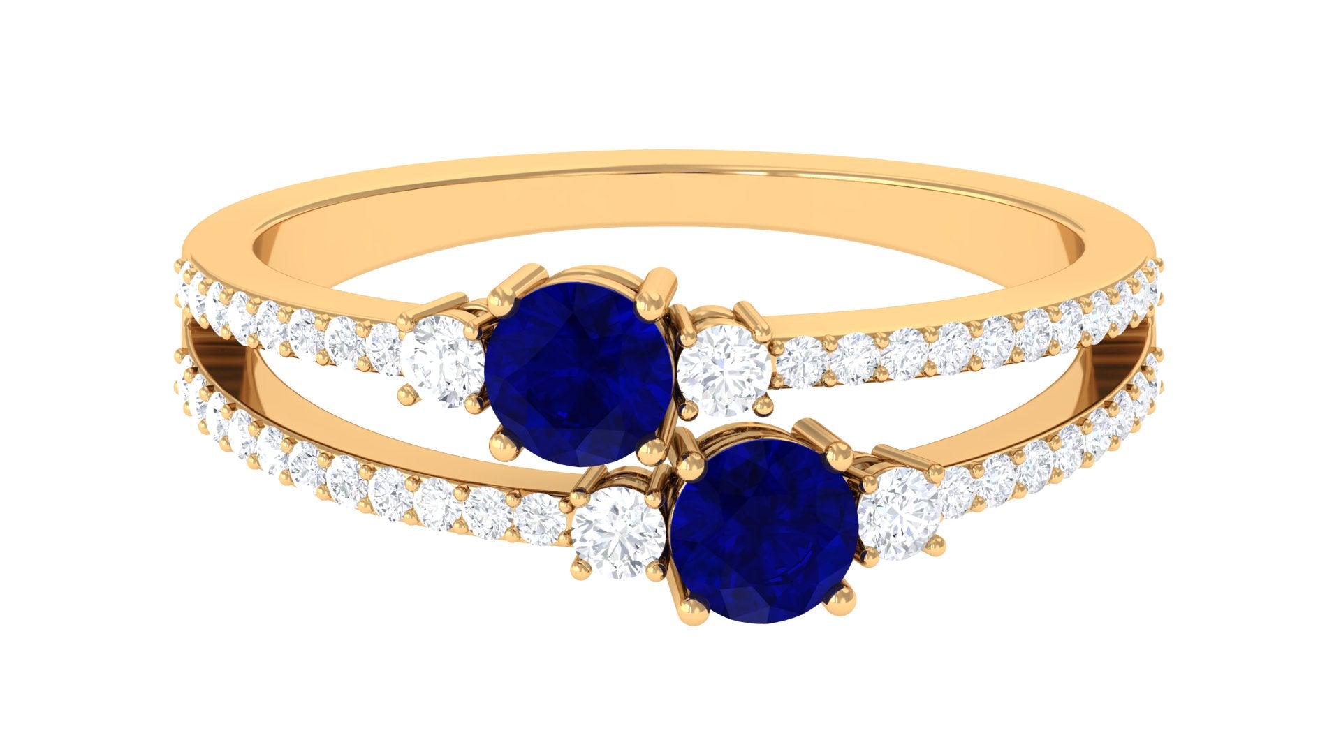 Royal with a twist of contemporary, this Blue Sapphire Anniversary Ring is all you need to sweep her off her feet. The Twin Stones of 4 MM Round Shape Blue Sapphire sit pretty at the center, effortlessly stealing all the limelight in Prong Setting. Sparkling in all its glory, it is adorned with the side stones of Round Shape Diamond half way through the Split Shank for added brilliance. Let this Two Stone Blue Sapphire Ring forever celebrate the coming together of two souls as one.