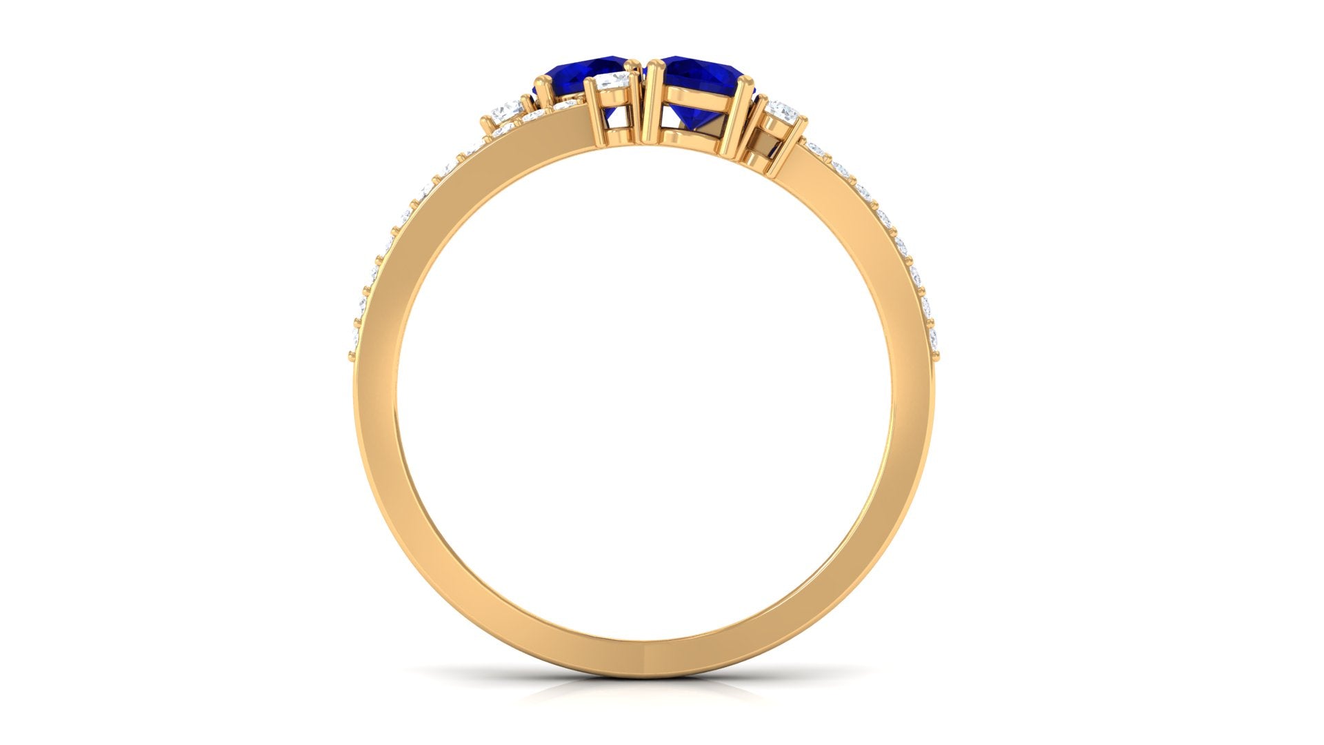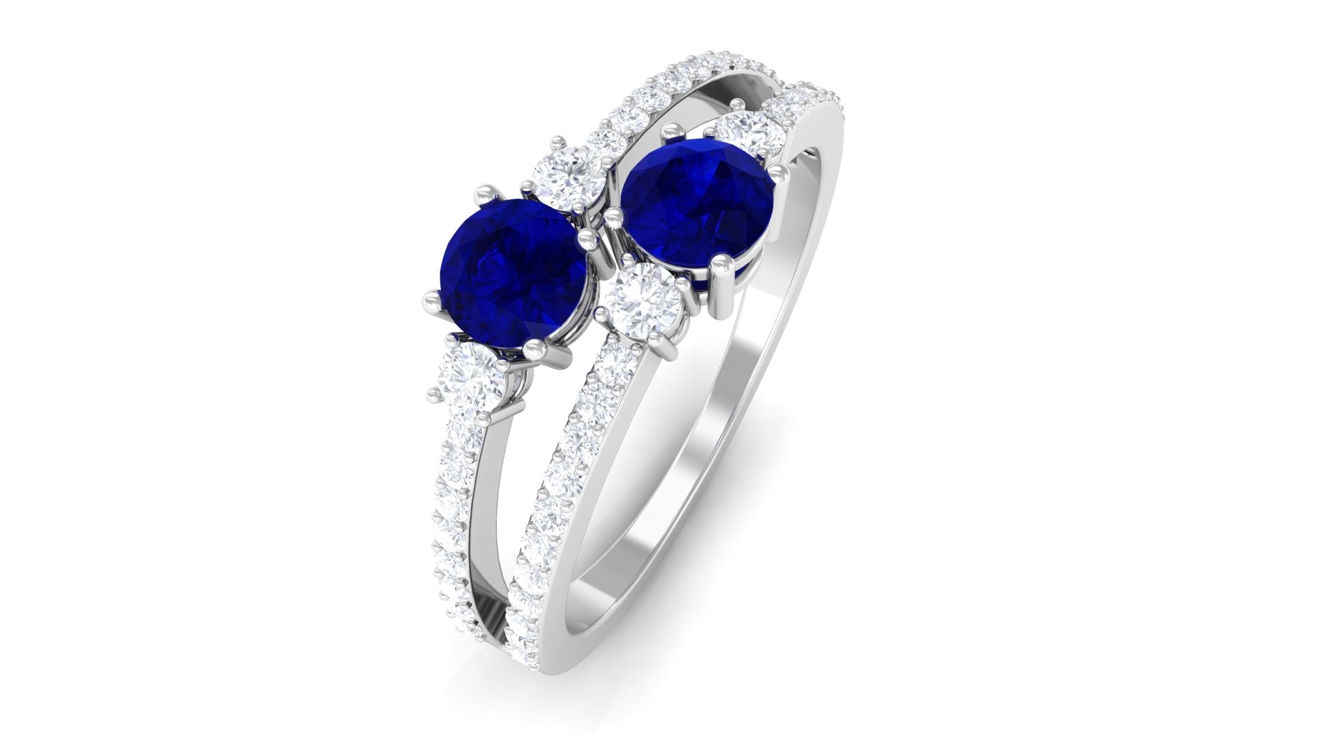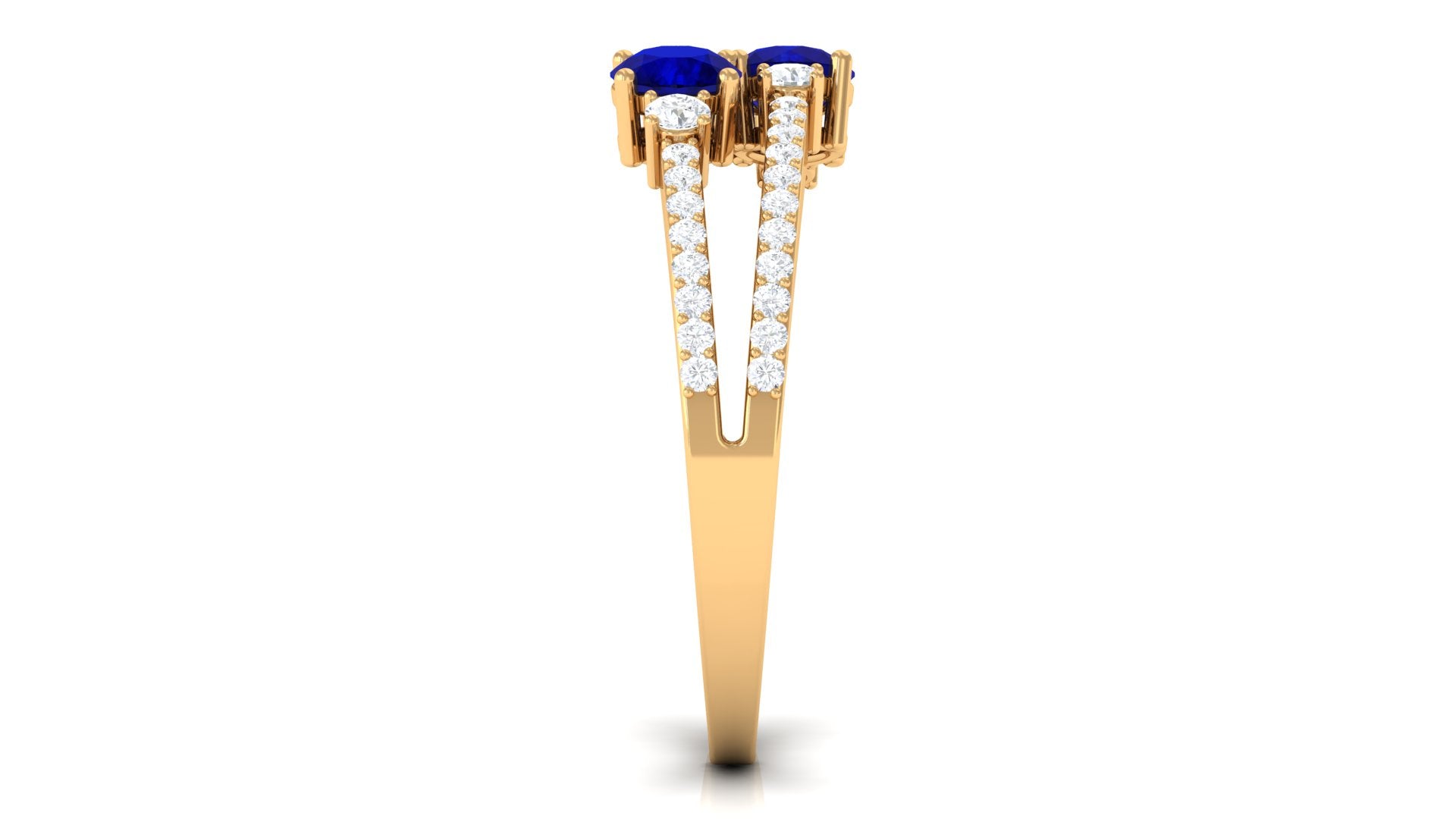 Royal with a twist of contemporary, this Blue Sapphire Anniversary Ring is all you need to sweep her off her feet. The Twin Stones of 4 MM Round Shape Blue Sapphire sit pretty at the center, effortlessly stealing all the limelight in Prong Setting. Sparkling in all its glory, it is adorned with the side stones of Round Shape Diamond half way through the Split Shank for added brilliance. Let this Two Stone Blue Sapphire Ring forever celebrate the coming together of two souls as one.
