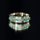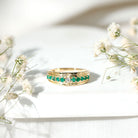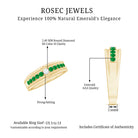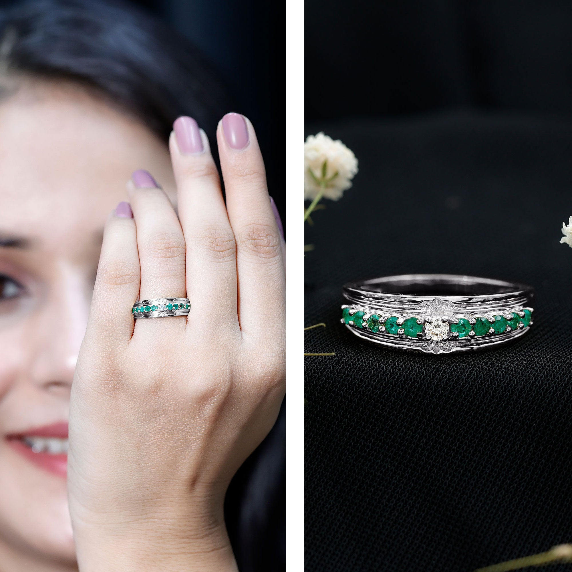 Mark a milestone with our Vintage Inspired Diamond Anniversary Ring, it is a stunning piece that combines classic charm with modern beauty. Embedded with a round cut diamond that shines brightly, flanked on both sides by rich green emeralds. Each stone is carefully prong set to capture light from every angle, creating a radiant sparkle that draws attention with every movement. The engraved design at the center and along the band adds a touch of vintage artistry, giving the Diamond and Emerald Ring character and a timeless appeal. The combination of brilliant HI-SI quality diamonds and vibrant AAA quality emeralds symbolizes love, prosperity, and lasting commitment, making it an ideal choice for weddings, anniversaries, or other special occasions. The wide band is designed for both style and comfort, fitting securely while making a bold statement. Every detail, from the polished finish to the secure setting of each gemstone, reflects the skill and care of expert craftsmanship. Whether worn alone or paired with other jewelry, the Vintage Anniversary Ring adds elegance to any outfit. Its blend of classic design and sparkling gemstones creates a piece that feels meaningful and special every time it is worn.