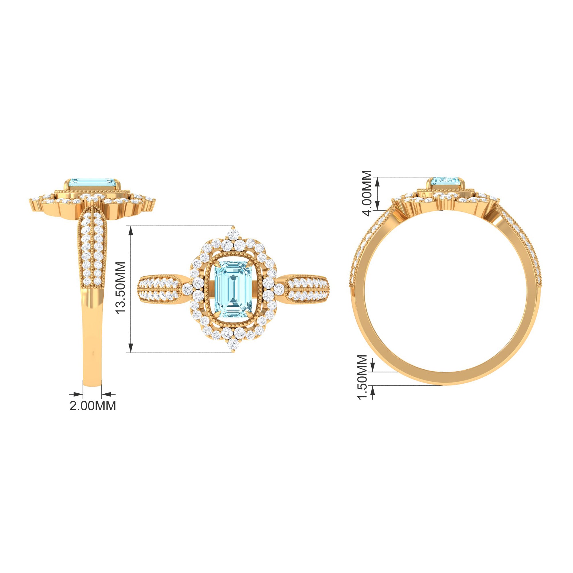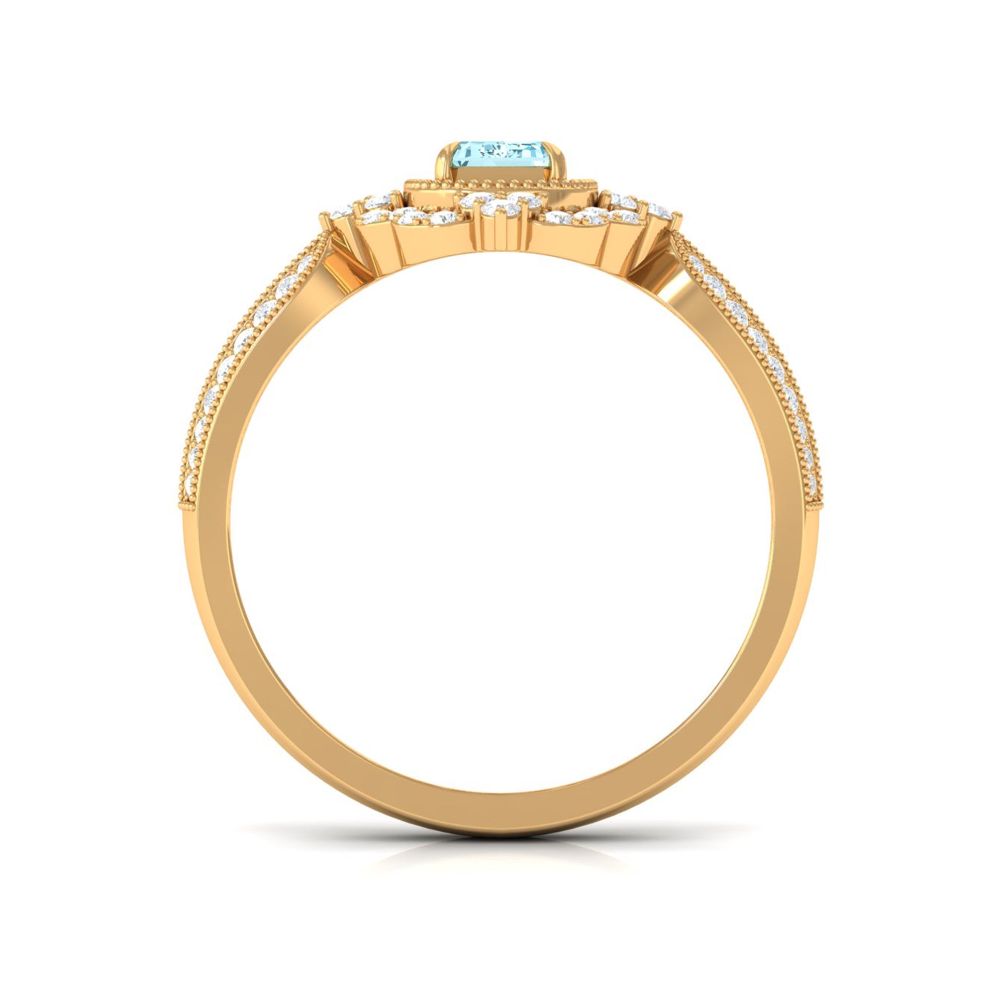 Give your beloved this enchanting Vintage Inspired Engagement Ring, a masterpiece that captures the essence of timeless romance. At its center lies a 4X6 mm Emerald Cut Aquamarine set in Claw Setting, its serene blue hue reflecting the calm and purity of true love. Surrounding the center stone is a delicate Diamond Halo embraced by intricate Beaded detailing, adding a touch of old-world charm that feels both regal and romantic. The band, adorned with Diamond accents and graceful beadwork, completes the look with sophistication and artistry. Every detail of this Emerald Cut Engagement Ring with Aquamarine is carefully crafted to evoke the beauty of antique design while celebrating the modern elegance of enduring devotion. Perfect for the woman who adores both history and sparkle, this Aquamarine Diamond Engagement Ring is a radiant reminder that love grows more beautiful with time. Presented in a signature jewelry box and available in various ring sizes, this Aquamarine Engagement Ring is ready to mark the beginning of your forever. Elegant, graceful and deeply symbolic, this ring is a timeless promise wrapped in the gentle glow of vintage romance.