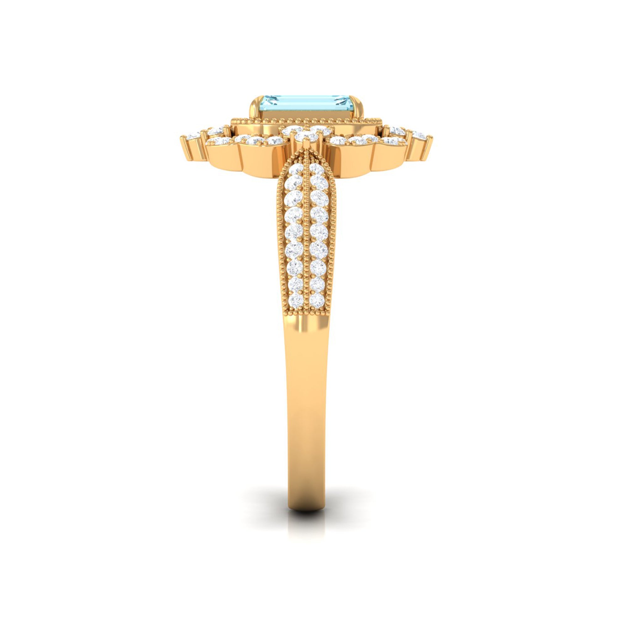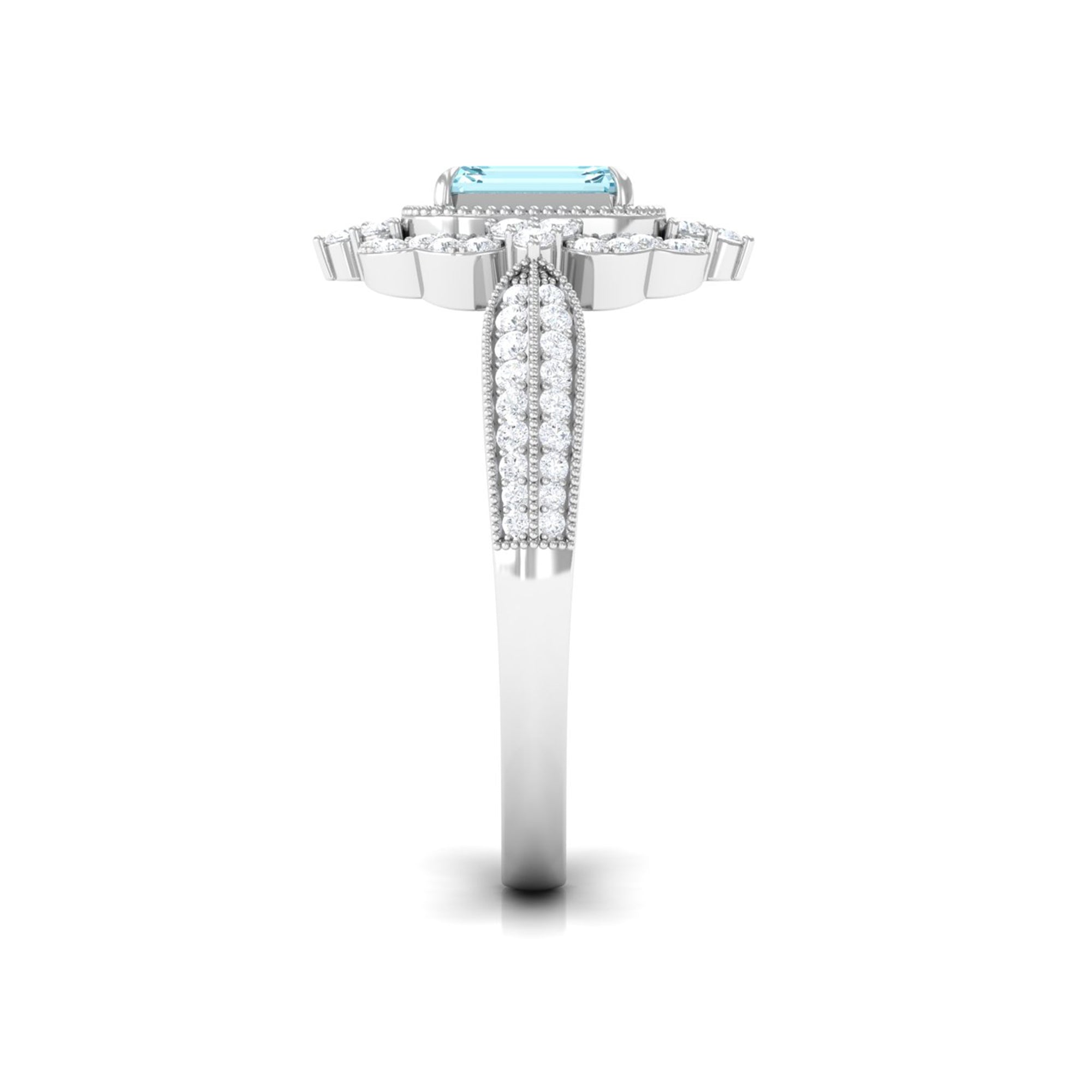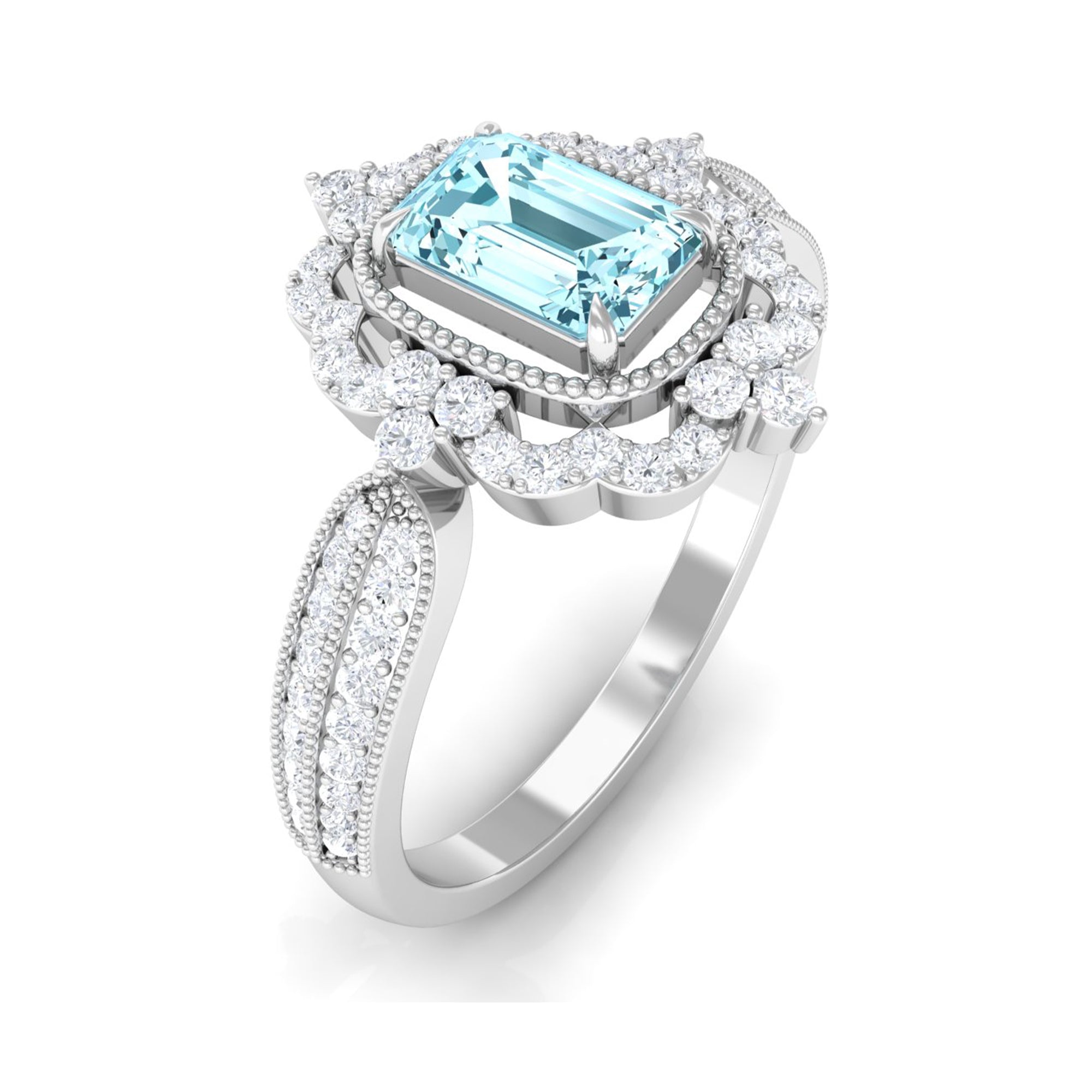 Real Emerald Cut Aquamarine Vintage Looking Engagement Ring with Diamond