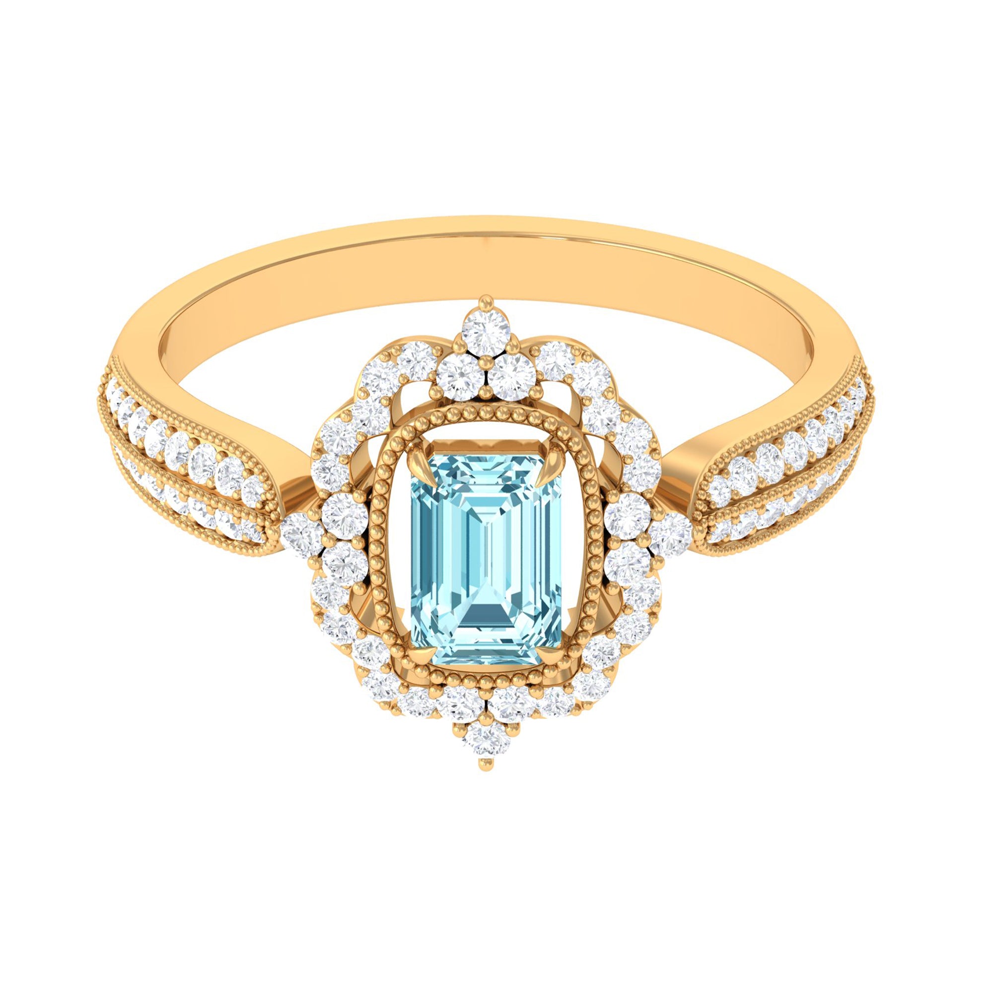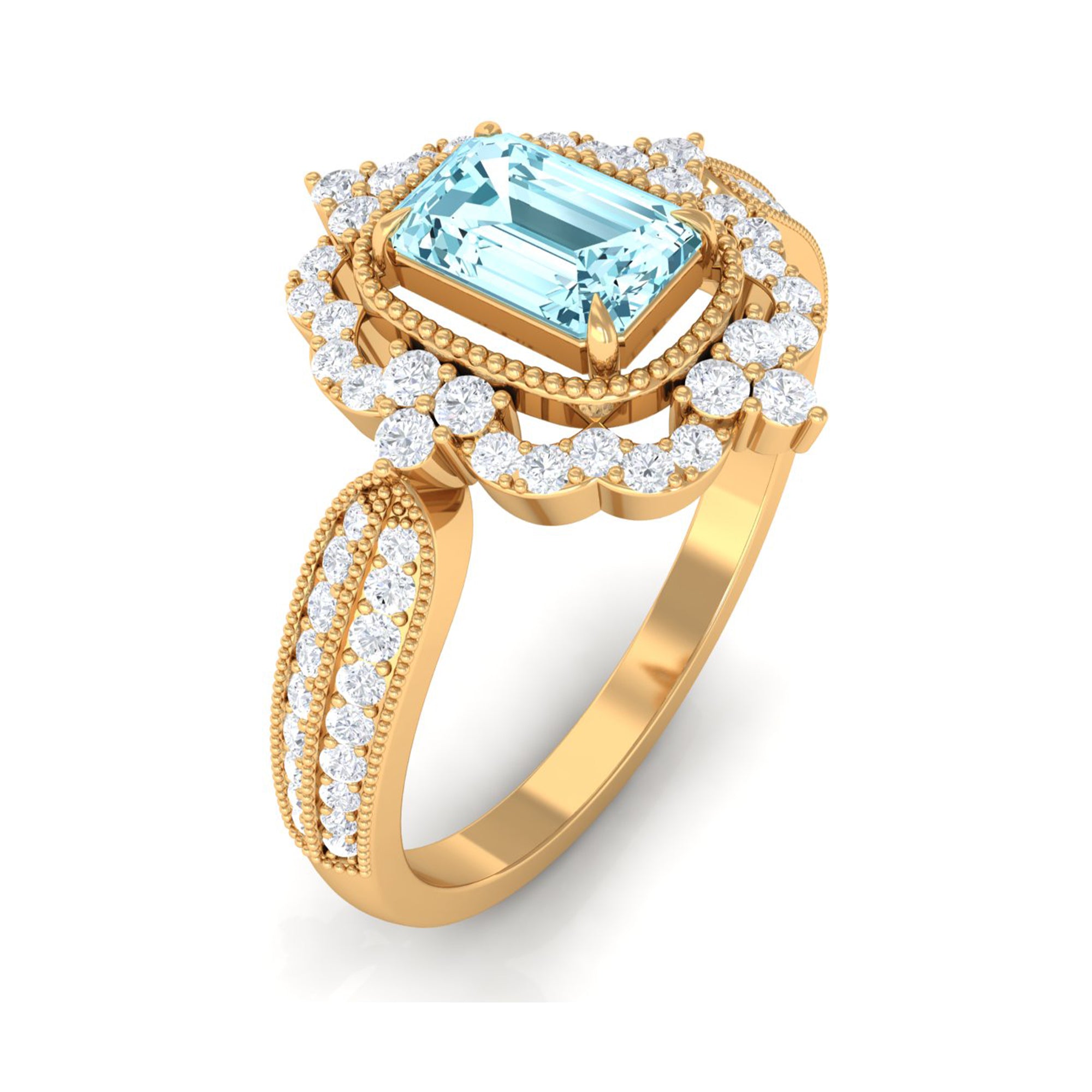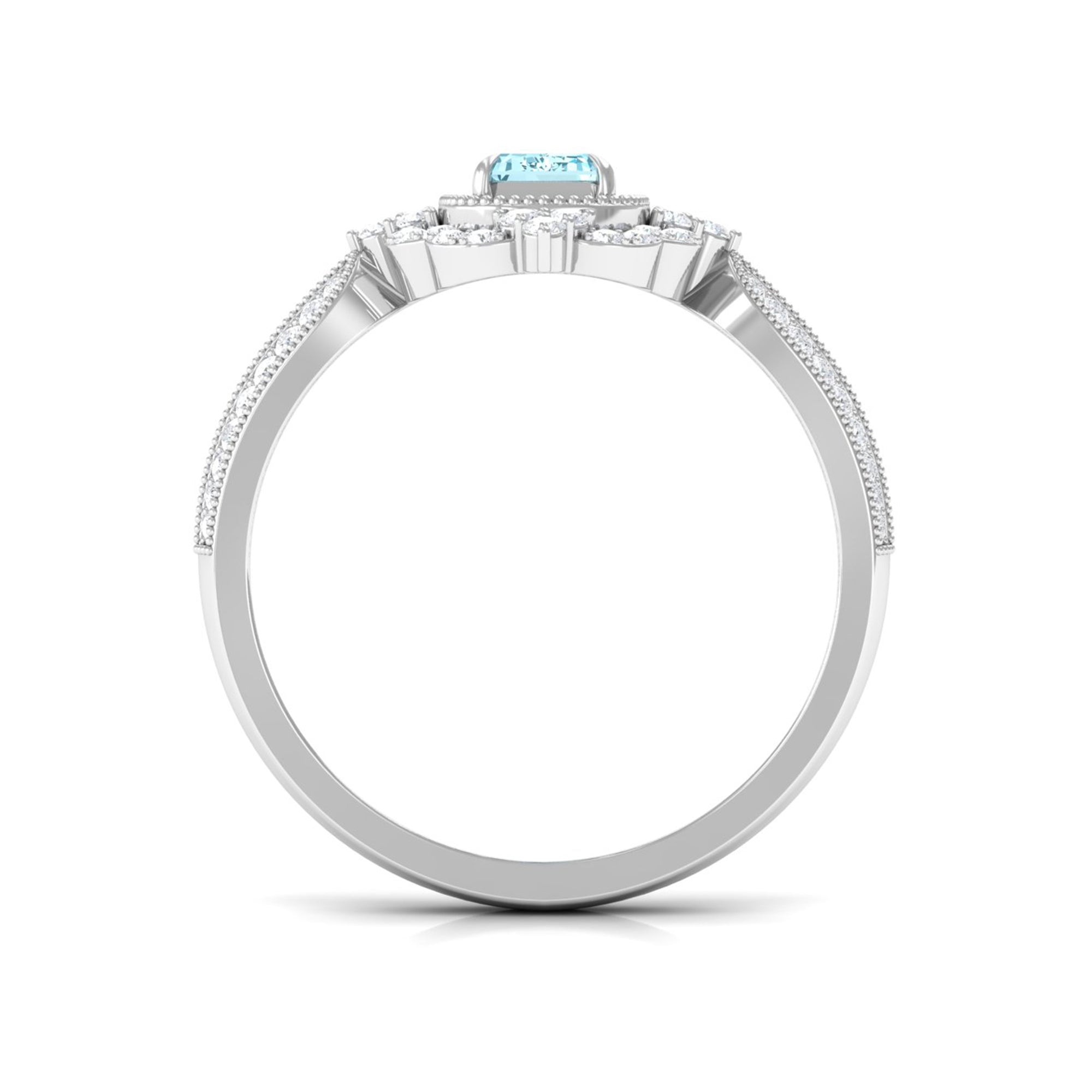 Real Emerald Cut Aquamarine Vintage Looking Engagement Ring with Diamond