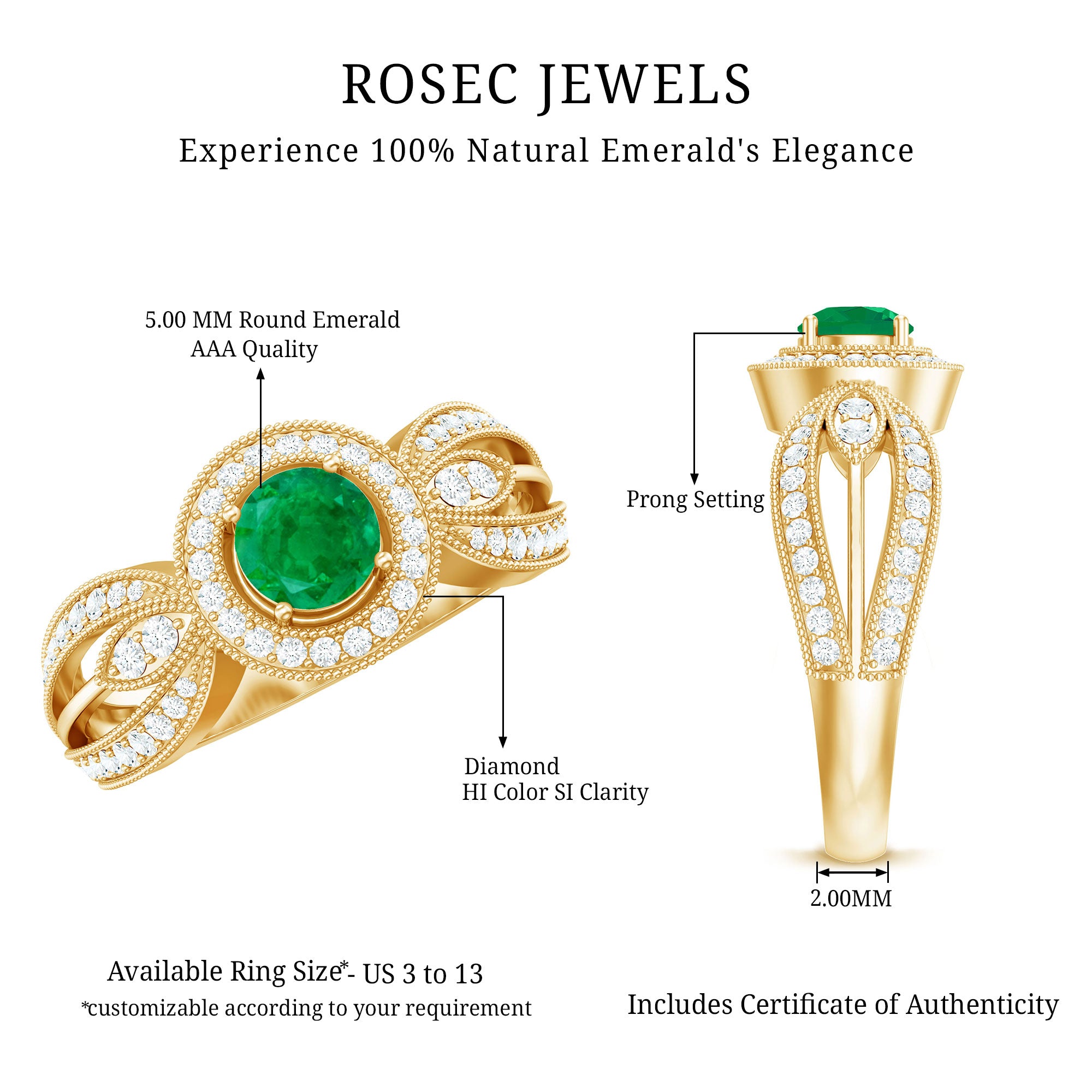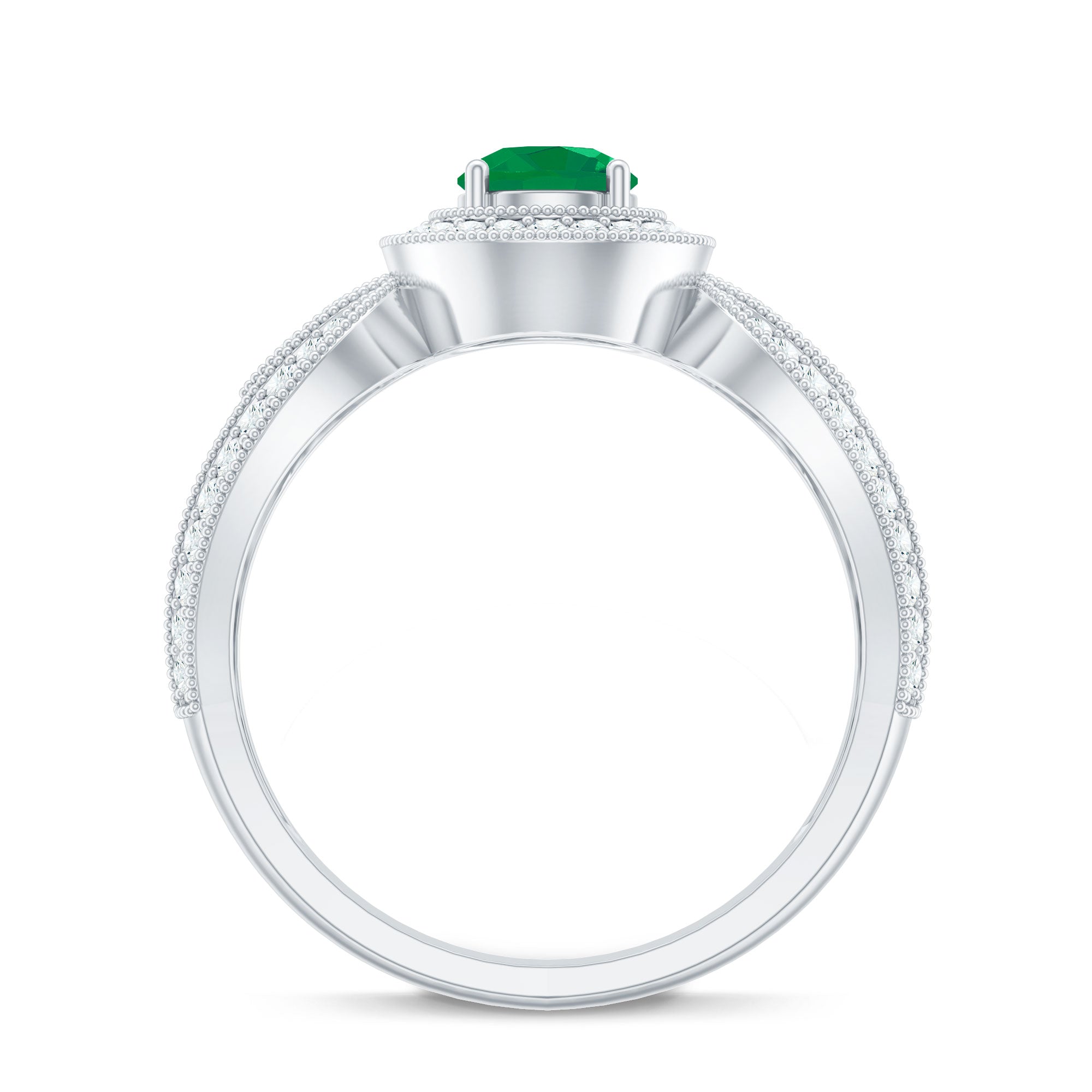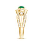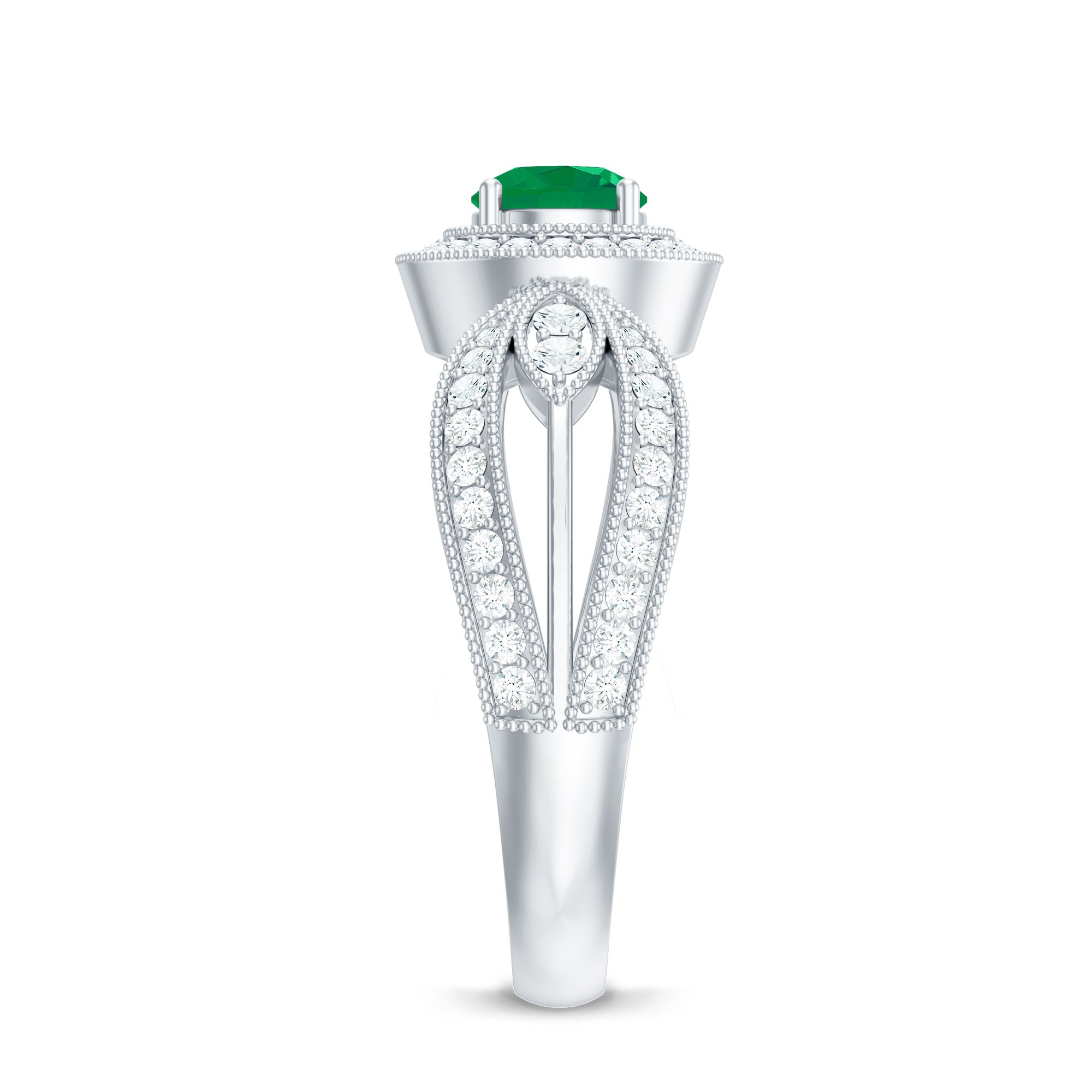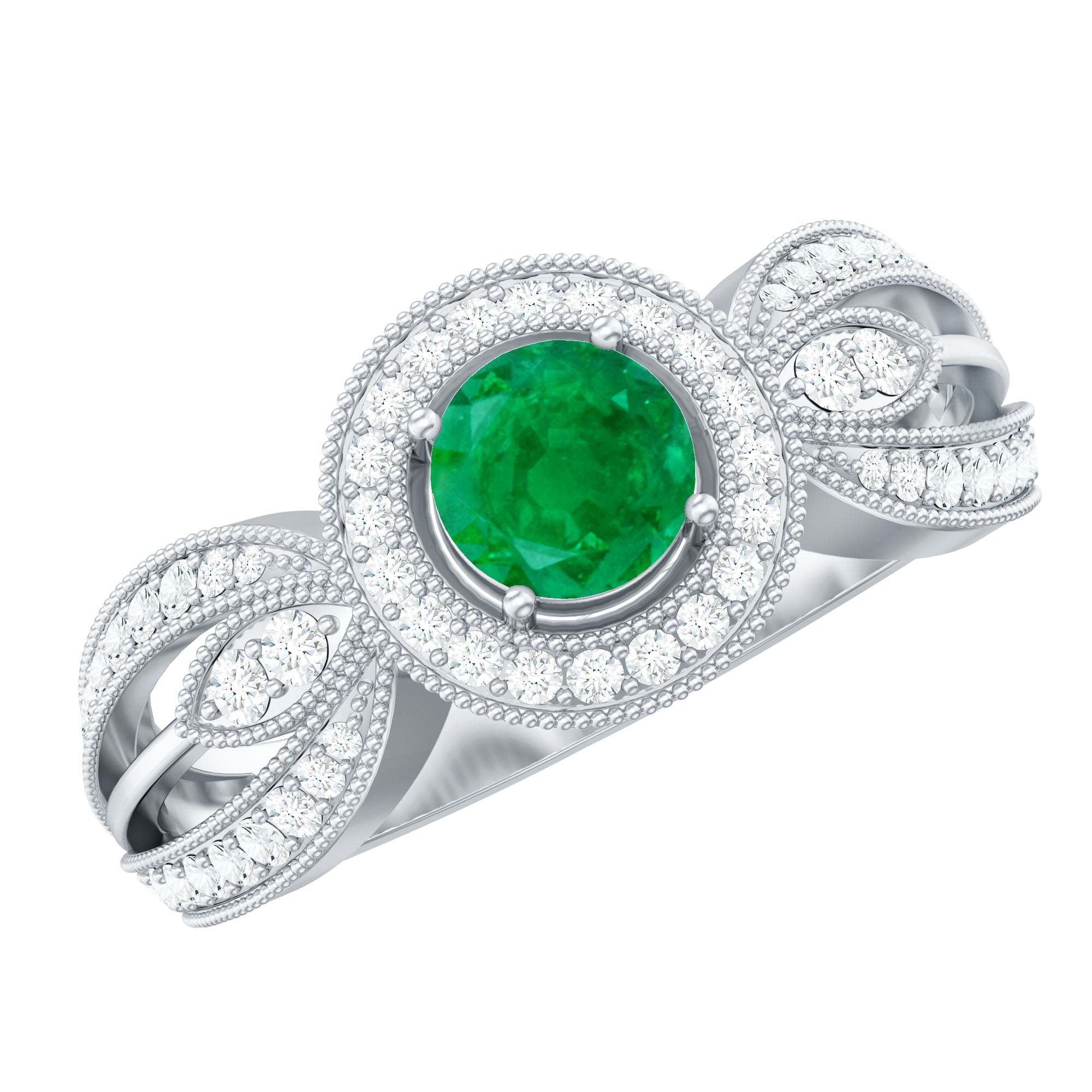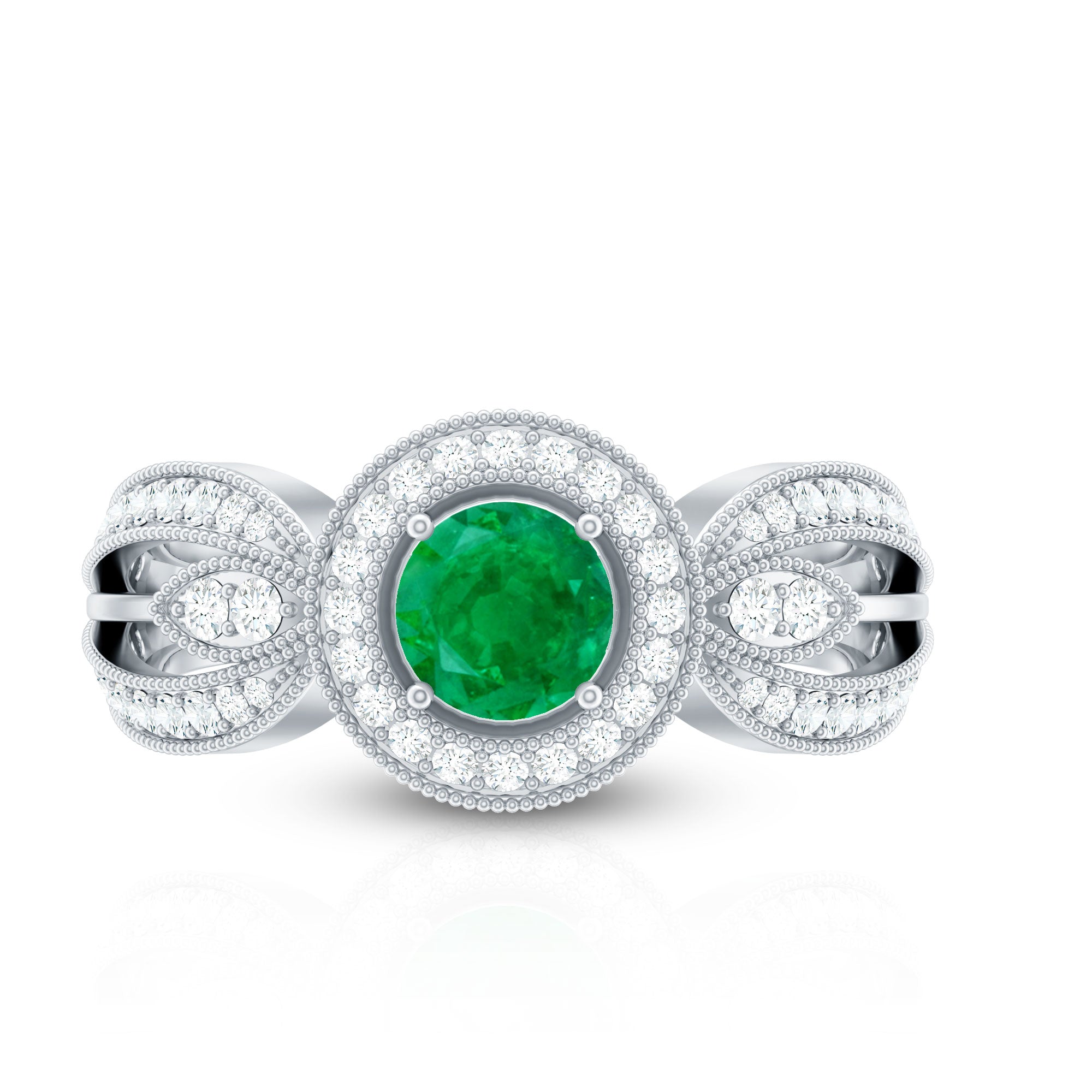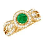 Experience the allure of timeless romance with this Vintage Looking Engagement Ring, a piece that effortlessly blends classic charm with contemporary elegance. At its center, a captivating 5 mm Round Shape Emerald glows with a rich green hue. Encircling the AAA Quality Emerald, a halo of sparkling Diamond stones intensifies its brilliance, while the Diamond studded Split Shank design, accented with intricate Beaded Detailing, adds sophistication and a touch of vintage glamour. Perfect for engagements, anniversaries or as a meaningful gift to celebrate a love that transcends time, this Emerald Diamond Engagement Ring transforms every moment into a cherished memory. Presented in an elegant jewelry box and available in a variety of sizes, this Split Shank Engagement Ring is designed to be worn daily yet treasured for a lifetime. This Halo Engagement Ring with Emerald is a declaration of devotion, a symbol of passion and a radiant promise that true love endures, shining brighter with every passing day.