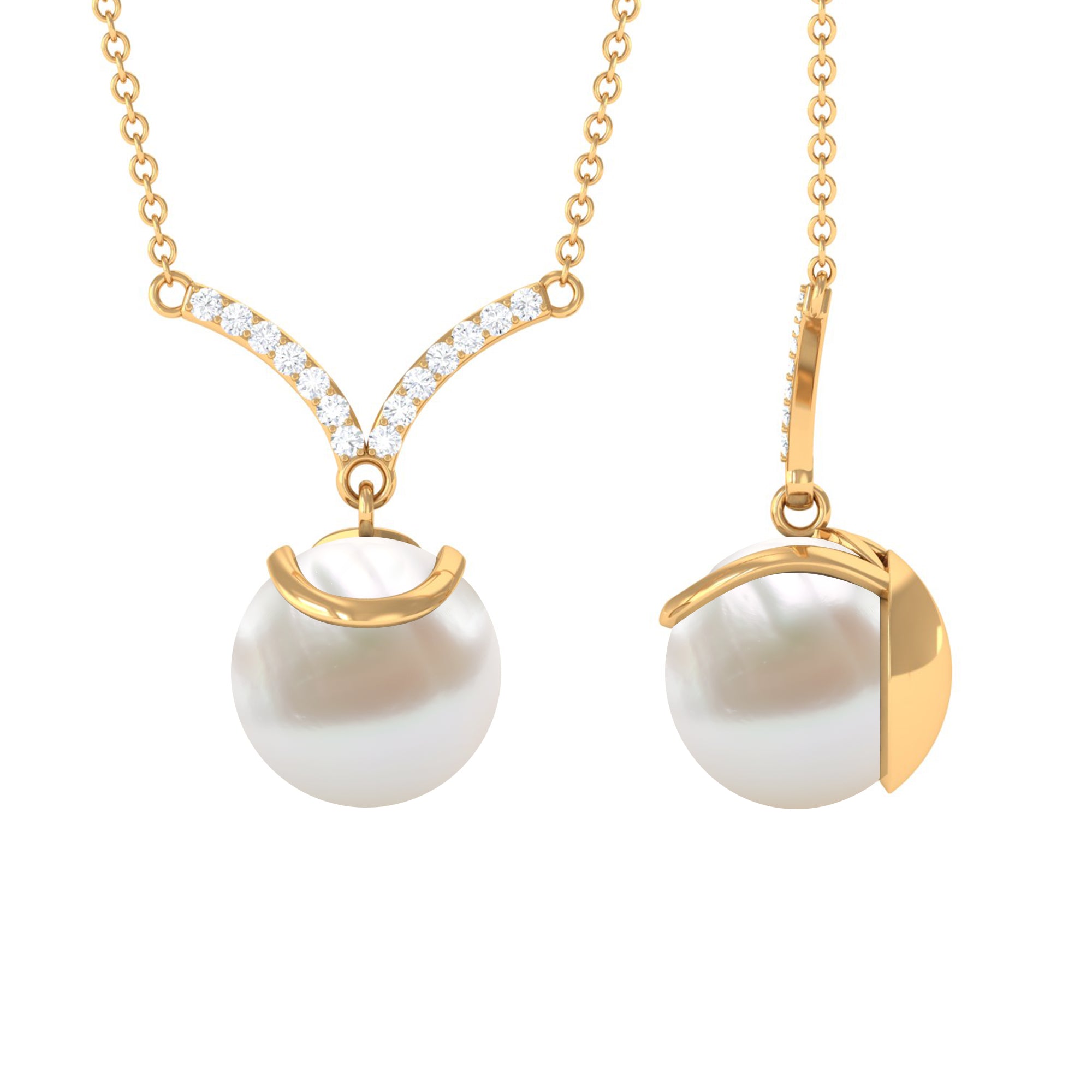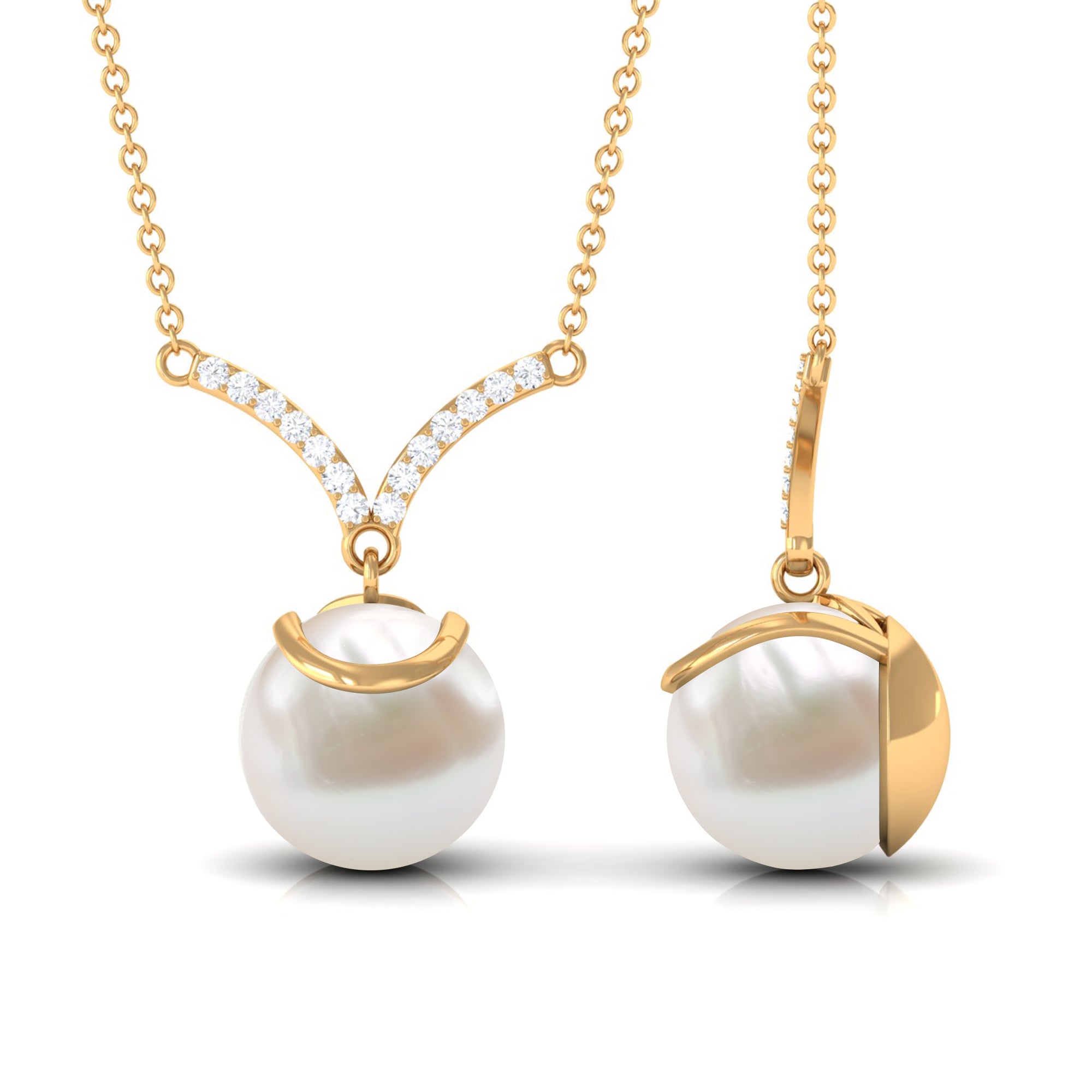 This elegant Drop Necklace is embellished with Round Shape Freshwater Pearl and dainty Round Diamonds studded on a V shape design, composed of Hallmarked Metal. Grab this unique Pearl Pendant Necklace for your special ones as a Birthday Gift, Graduation Gift, Anniversary Gift, or Bridesmaid Gift.