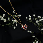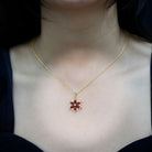 Reconnect with nature, with the unique and mesmerizing Garnet Necklace. Experience the chill and at the same time the blooming of flowers, with this mesmerizing pendant necklace which is crafted from Yellow Gold Plated Silver. Embellished with Marquise Shape Garnet in Prong Setting that mimics the pattern of a flower and the calming of a snowflake design. Along with it is the Round brilliant cut Moissanite that truly scintillates the Pendant. Dangling through a chain, this Floral Necklace achieves a unique statement design that offers beauty with the overall aesthetics. The Real connection between the flower and the snowflake often plays on the contrast and harmony between these two natural forms. The individuality of the snowflake, combined with the love or beauty of the flower, is often a deliberate artistic choice to merge the distinct yet complementary aesthetics and symbolic richness of two fundamental natural elements. This Garnet Necklace for Women has AAA Quality Garnet and D-VS1 Quality Moissanite, emitting the brilliance of the gemstone.