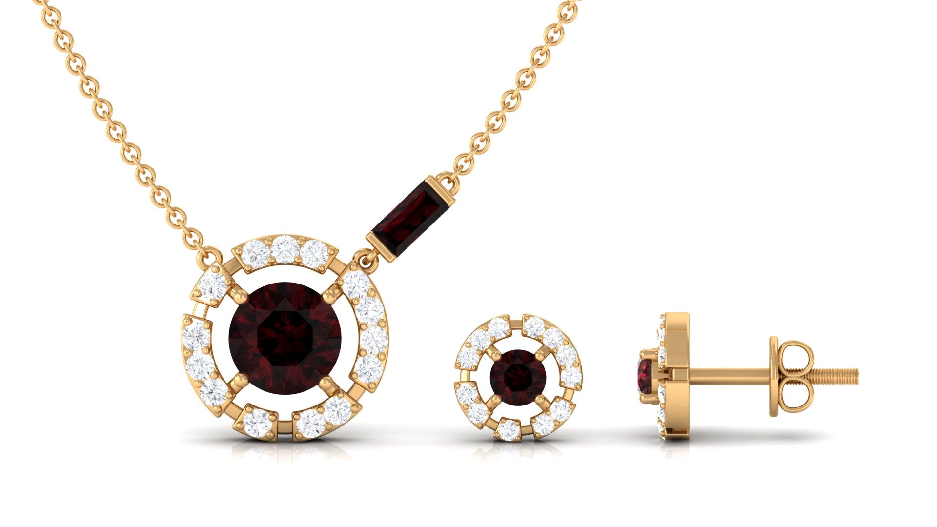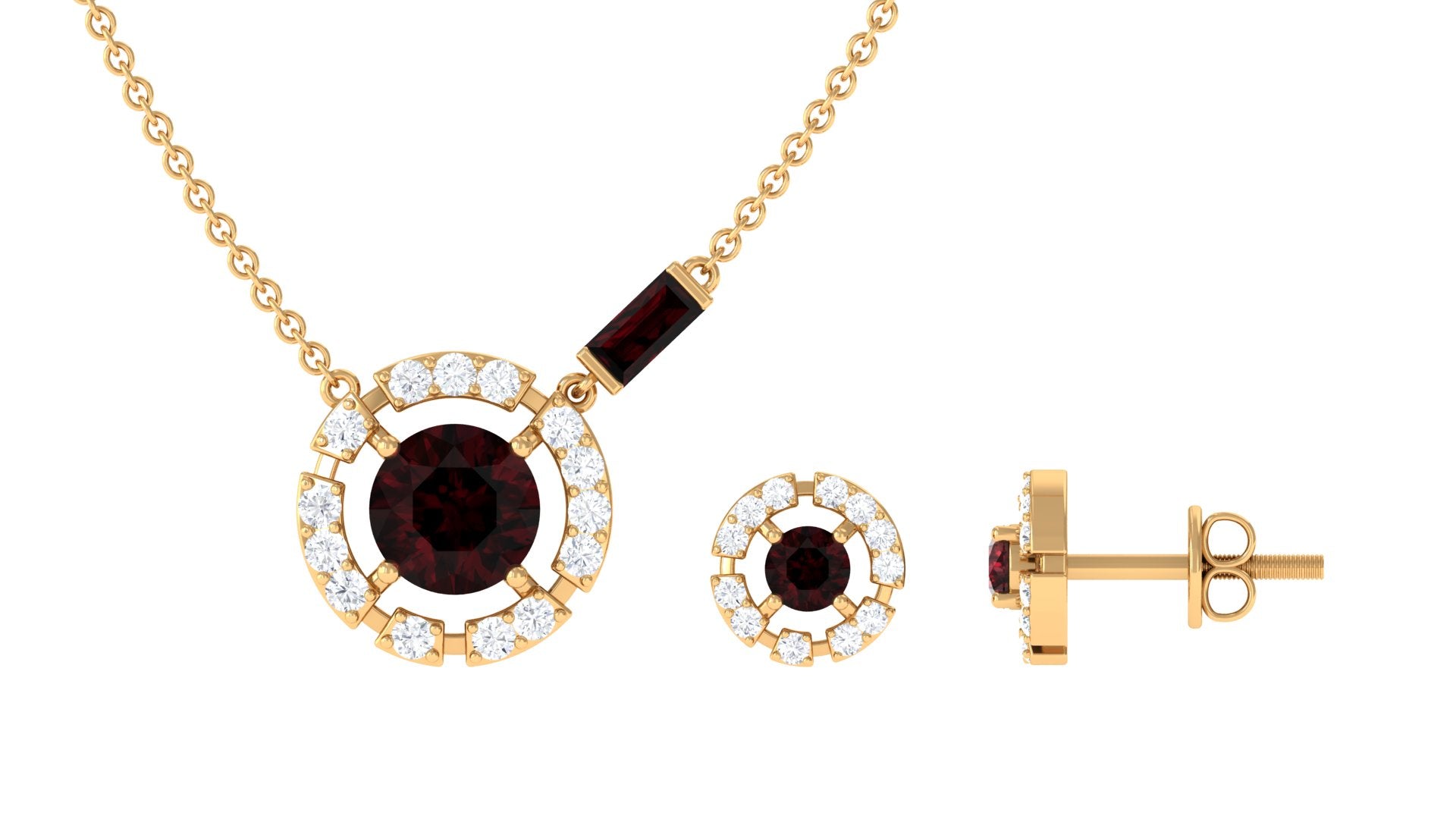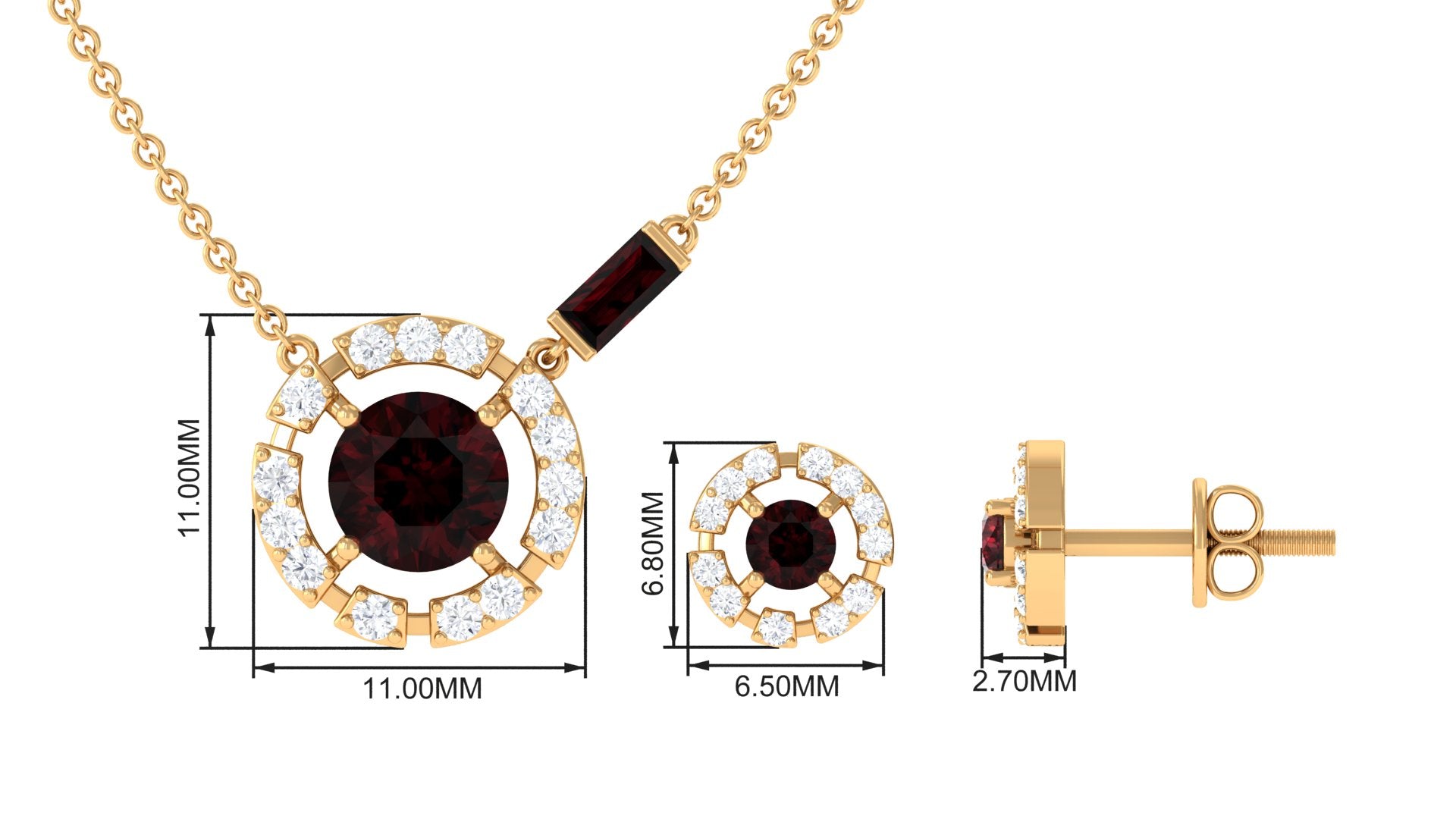 This exquisite jewelry set includes stud earrings set and a necklace. Embellished with Round Garnet prong set in the center surrounded by a halo of Diamonds. This Halo Necklace comes with a high-quality chain that is adorned with a baguette cut garnet adds a mesmerizing effect to the design. Make her day unforgettable by giving her this elegant jewelry piece, radiating with brilliance.