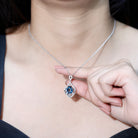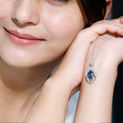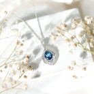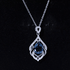 Turn heads with this captivating Designer Necklace featuring a stunning 8X10 MM pear shaped London Blue Topaz at its center. Expertly handcrafted in 14K white gold plated silver, this elegant piece showcases the rich, deep blue hue of the topaz, radiating calm and confidence. Surrounded by delicate swirls and curves, the gemstone is framed by shimmering round cut lab grown diamonds that add a soft, graceful sparkle from every angle. The intricately designed bail, also adorned with lab-created diamonds, adds a decorative touch and seamlessly blends with the overall aesthetic of the London Blue Topaz Necklace. The teardrop-inspired structure, paired with the elegant diamond-studded outline, creates a luxurious look that balances vintage charm with modern artistry. Perfect for elevating evening looks or adding a sophisticated touch to everyday wear, this Blue Topaz Teardrop Necklace is a standout piece that reflects fine craftsmanship and timeless elegance. Whether it is for your wedding day or simply to indulge in something beautiful, this Wedding Necklace for Bride is designed to leave a lasting impression. A delicate chain completes the look, making it ready to wear or gift straight out of the box.