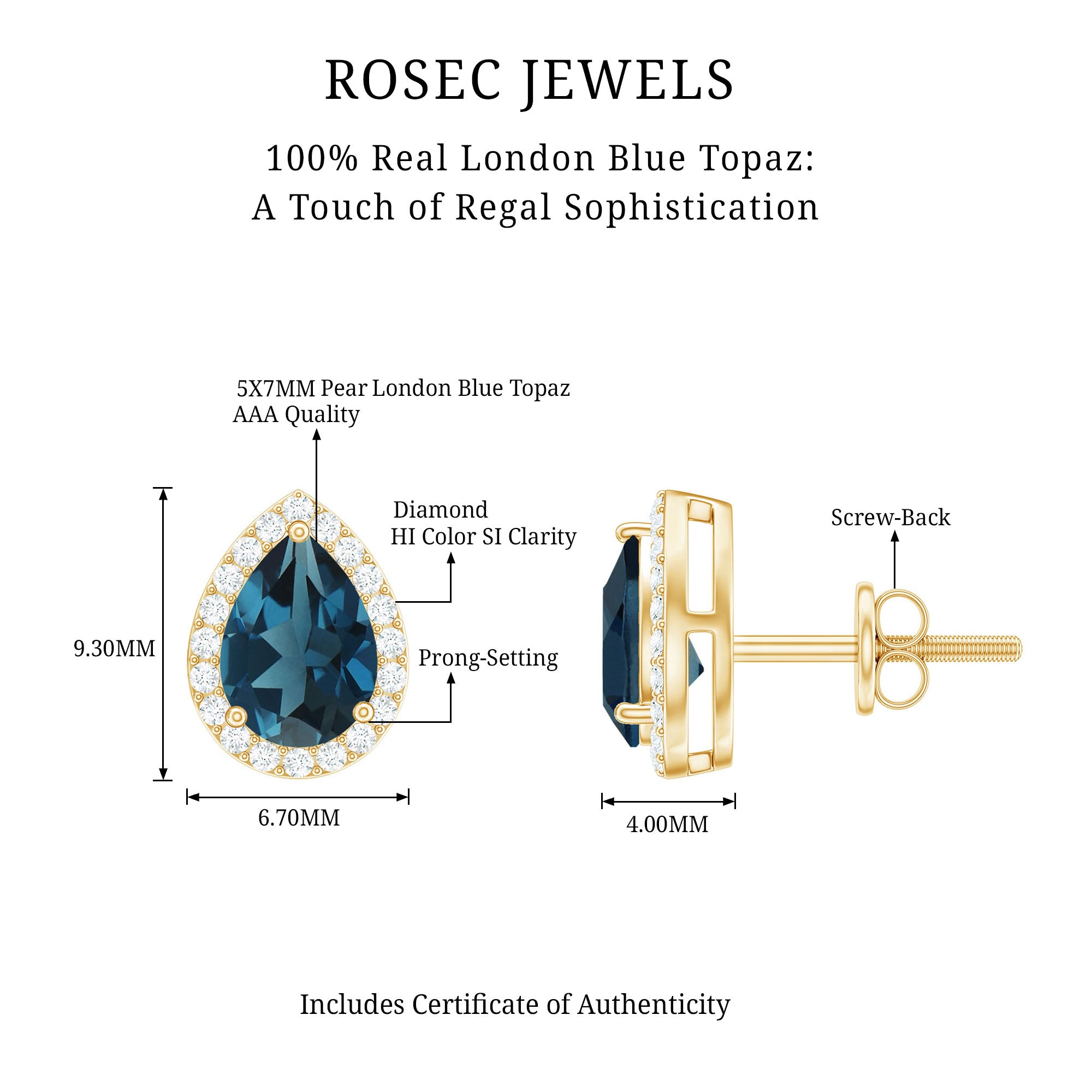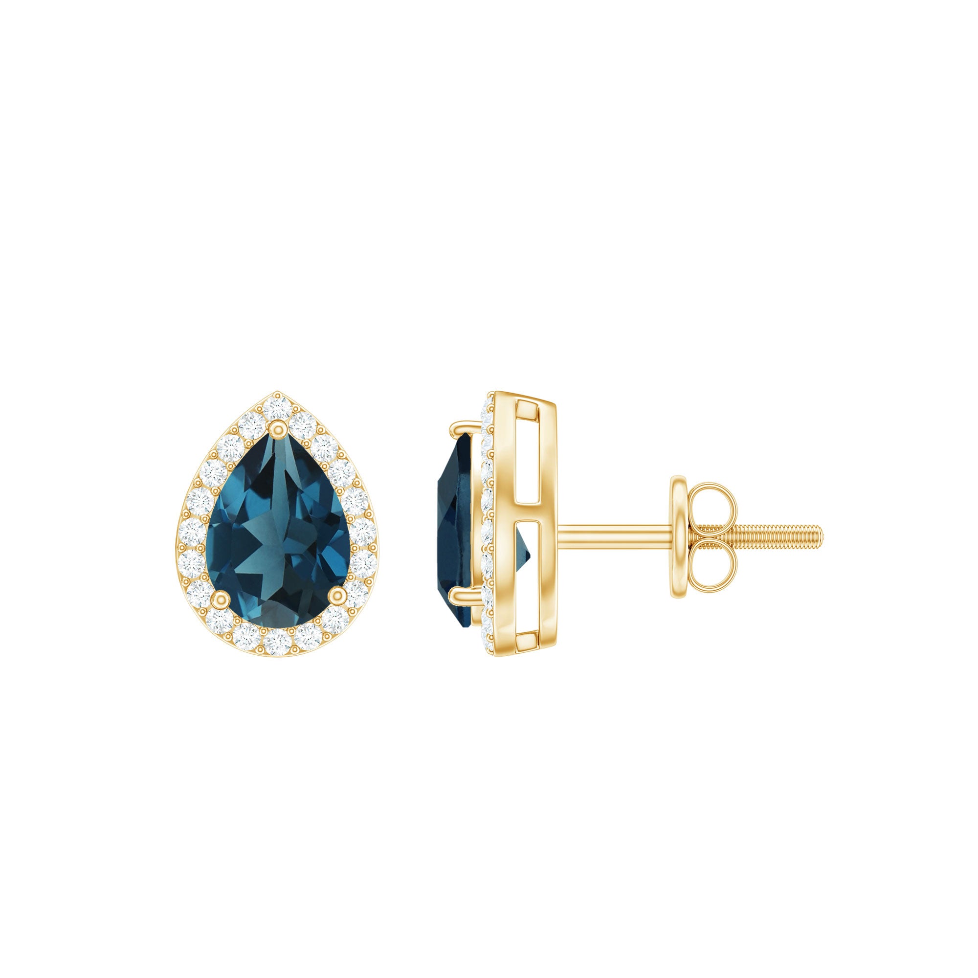 Every detail in these London Blue Topaz Earrings is crafted to create a timeless piece that is versatile, elegant, and easy to wear for any occasion. The design features a 5X7 MM pear shaped London Blue Topaz, held securely in a 3-prong setting. Around the center stone, a fine halo of round cut diamonds adds a sparkle, giving the design brilliance. Designed with AAA quality london blue topaz and HI-SI quality diamonds, each stone is carefully selected to ensure lasting beauty and brightness. The teardrop shape gives the Pear Stud Earrings a classic charm, while the halo adds a touch of modern detail, making them perfect for both everyday wear and special occasions. Secure screw back closures keep them comfortable and safe, allowing you to enjoy their shine from morning to night. These Halo Stud Earrings blend simplicity and sophistication effortlessly. Their timeless style pairs beautifully with any outfit, from casual to elegant. Crafted with attention to detail, they capture the essence of refined beauty and enduring style. Whether gifted to mark a special moment or chosen as a personal keepsake, these London Blue Topaz and Diamond Earrings carry quiet elegance and lasting meaning.