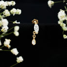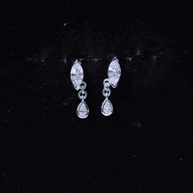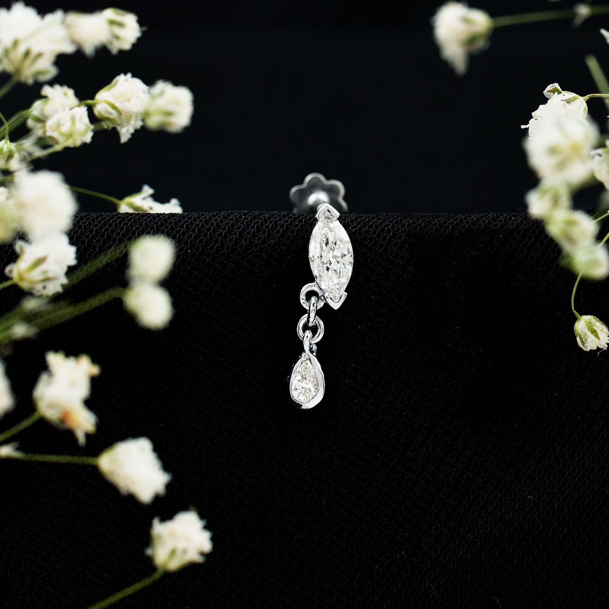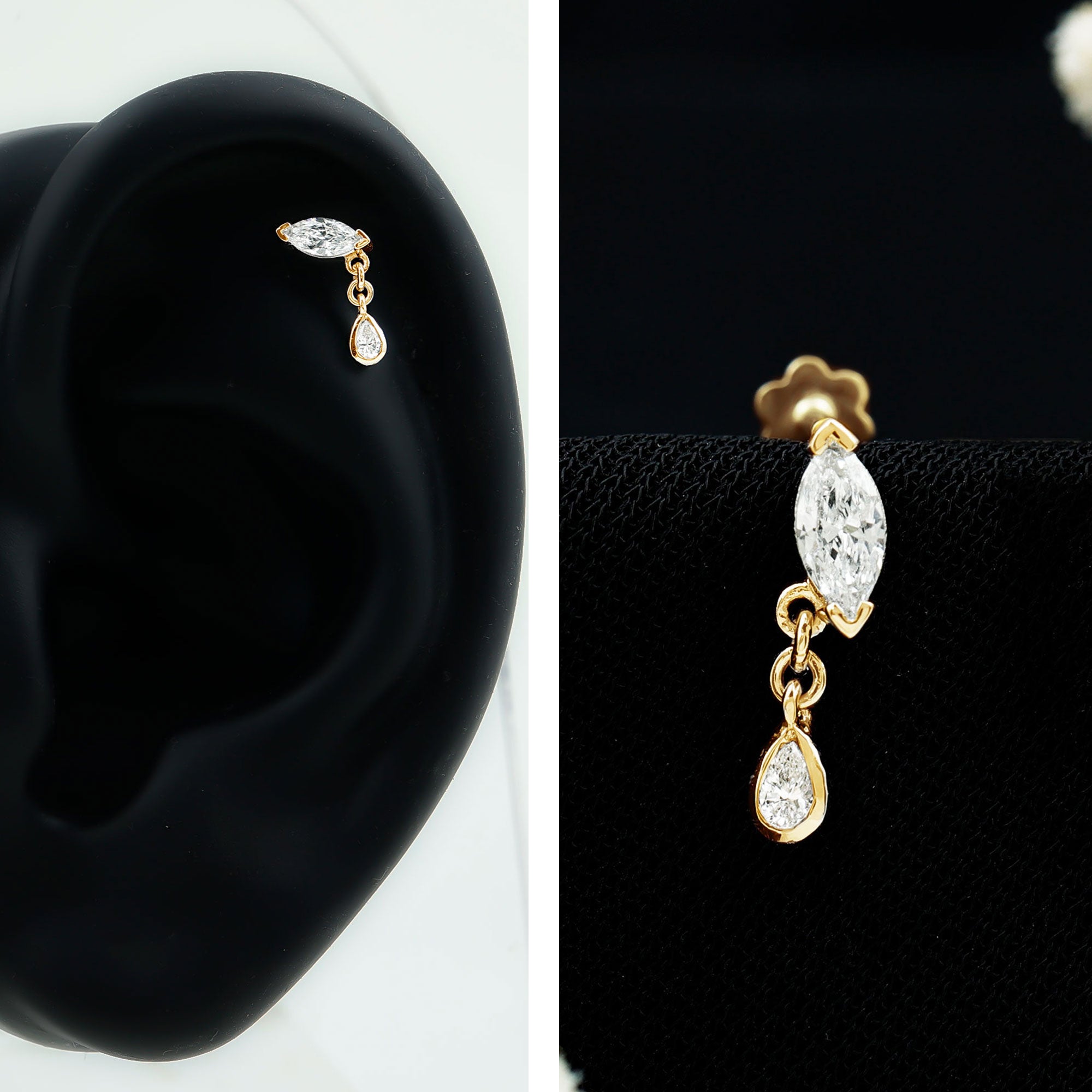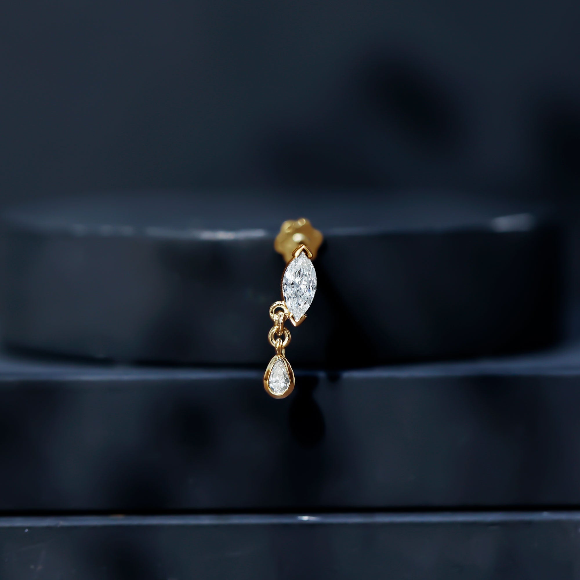 Elegance takes center stage in this stunning cartilage drop earring, featuring a magnificent marquise-cut diamond set in v prong setting. With a floating teardrop diamond, which seems to float effortlessly from the corner of the marquise stone.