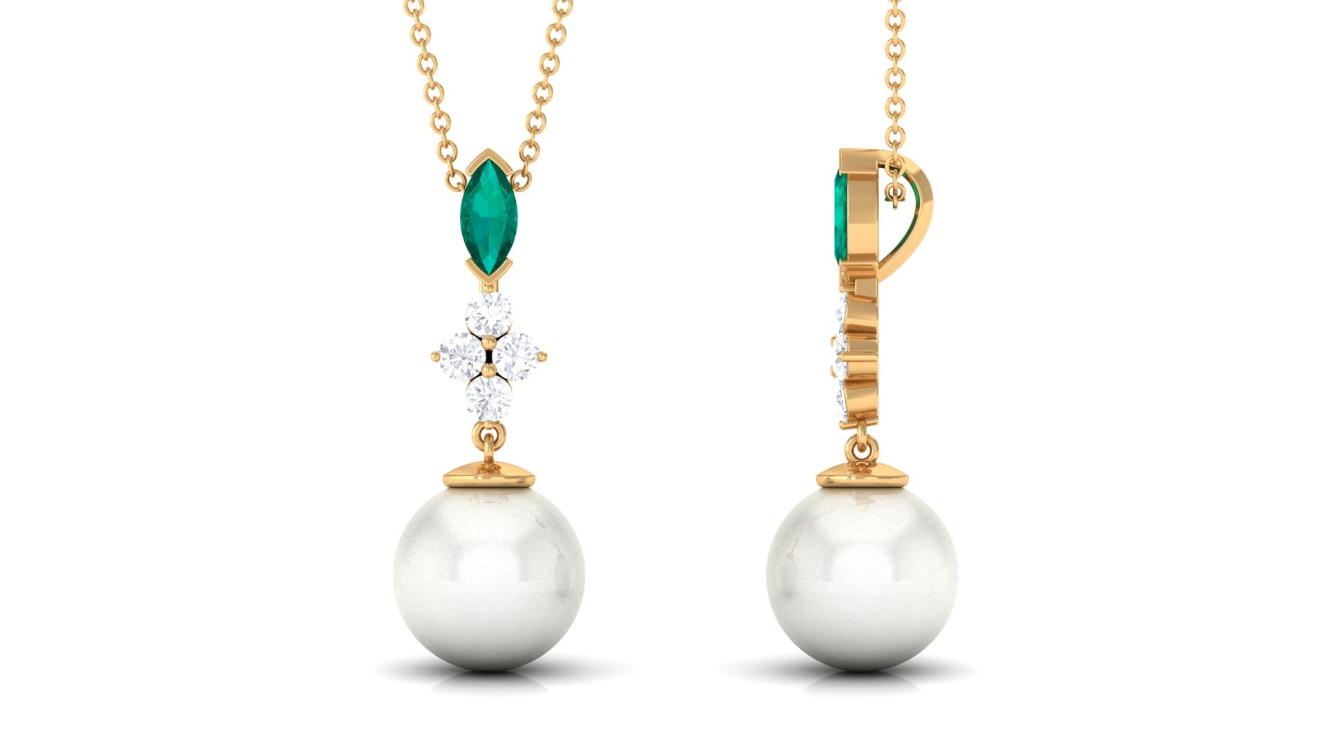 Achieve a simple yet sophisticated look with this elegant Freshwater Pearl Vintage Pendant. This pendant features a 10 MM Freshwater Pearl, with Round Shape petite Moissanite, and a stunning 4X8 MM Marquise Shape Emerald. This pendant necklace is the perfect gift for a Gemini woman who appreciates timeless and elegant jewelry. This pendant is sure to become a treasured piece in any jewelry collection. This Pearl Dangle Necklace exudes a classic shine of AAA quality pearl making it perfect for embracing the special look. The pendant will be delivered to you in a jewelry box with the certificate of authenticity.