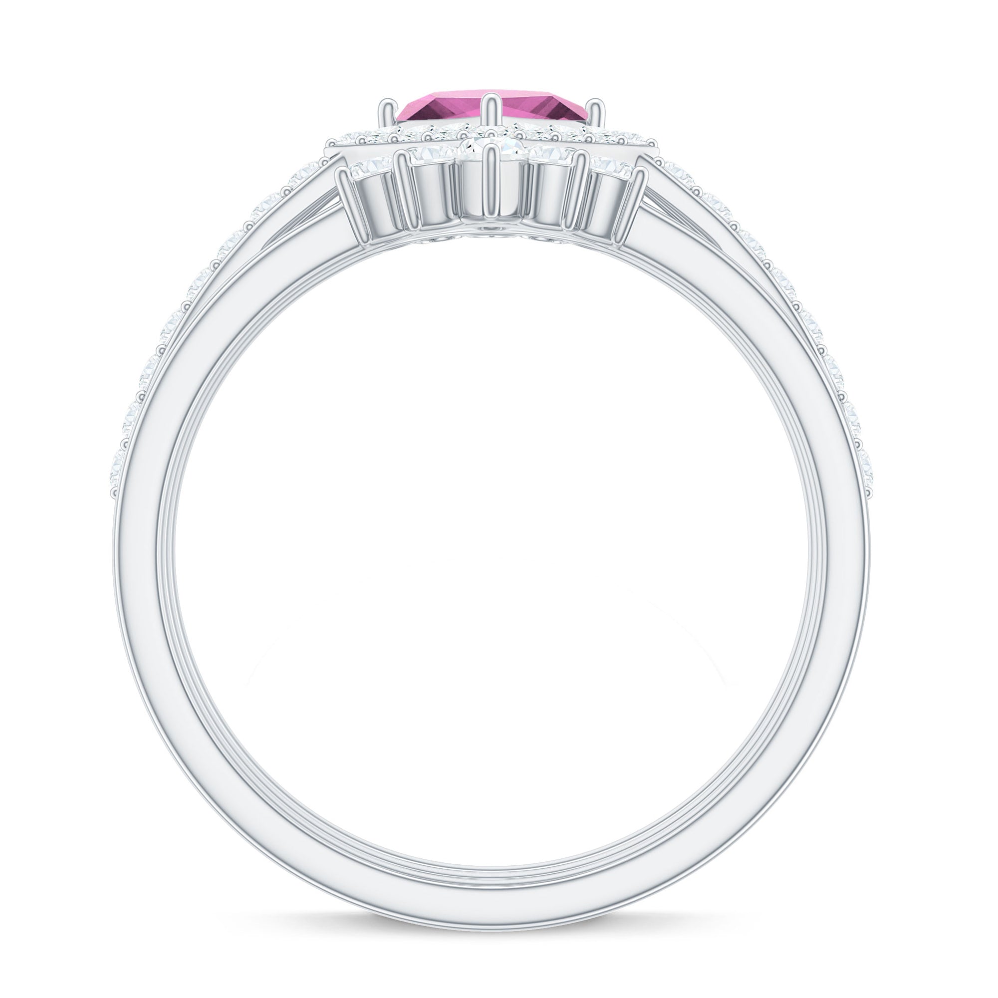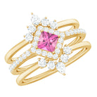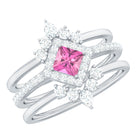 This stunning Wedding Ring Set is embellished with Princess Cut Pink tourmaline secured in Prong Setting, while Round Moissanites studded on the matching bands.• The Pink tourmaline Ring Set will complement her daily or special outfits. So dont wait, get this Unique Ring Set as an anniversary gift for her.