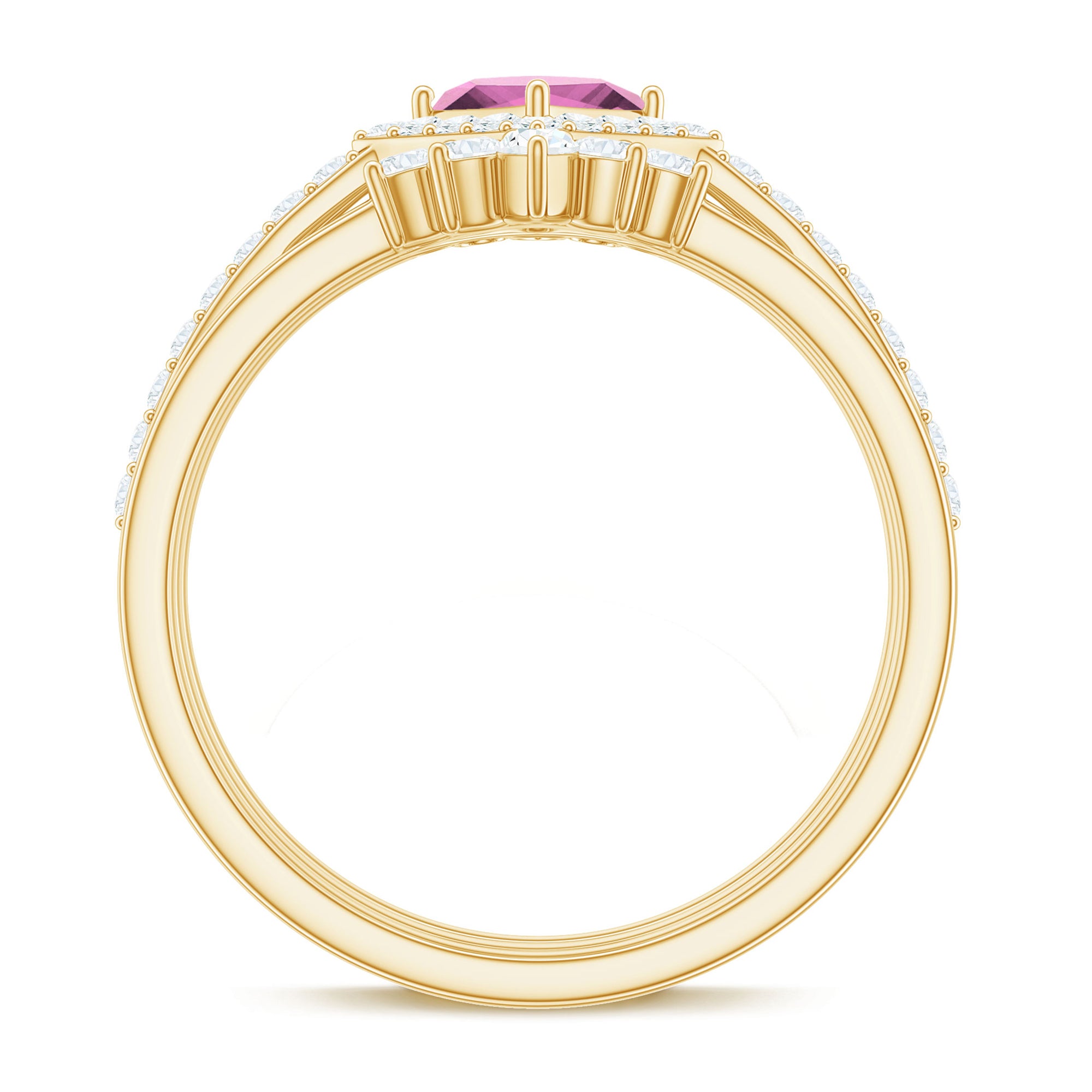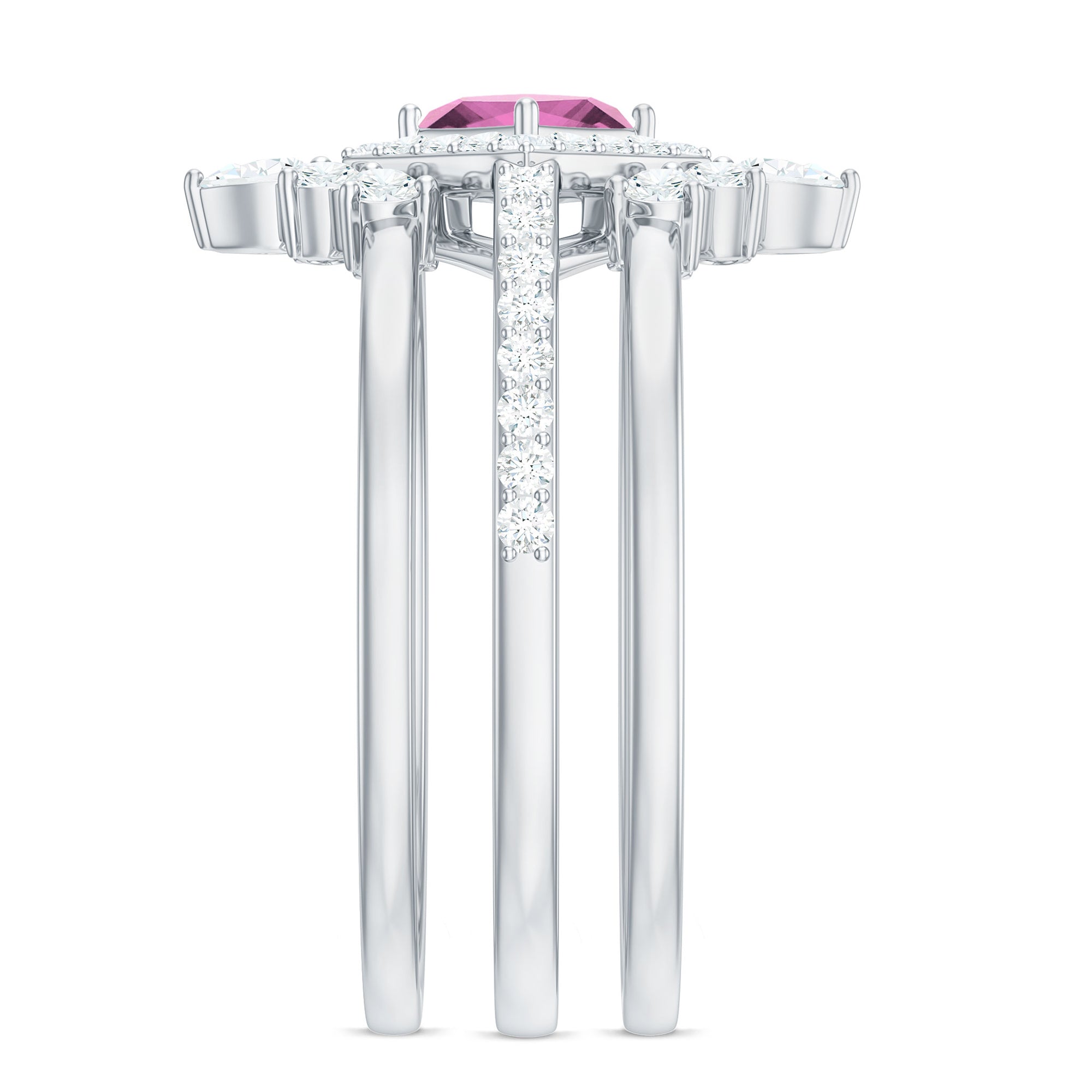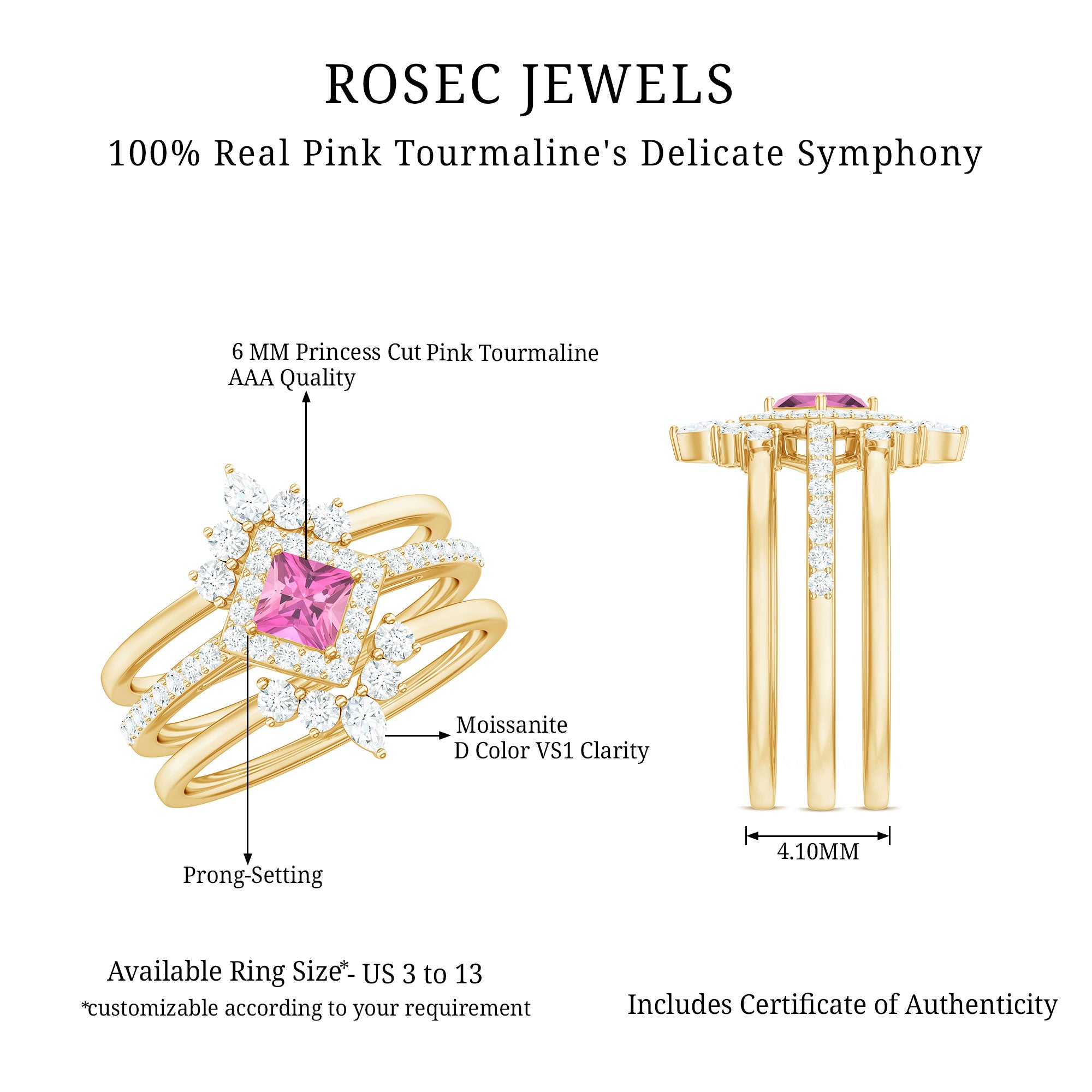 This stunning Wedding Ring Set is embellished with Princess Cut Pink tourmaline secured in Prong Setting, while Round Moissanites studded on the matching bands.• The Pink tourmaline Ring Set will complement her daily or special outfits. So dont wait, get this Unique Ring Set as an anniversary gift for her.