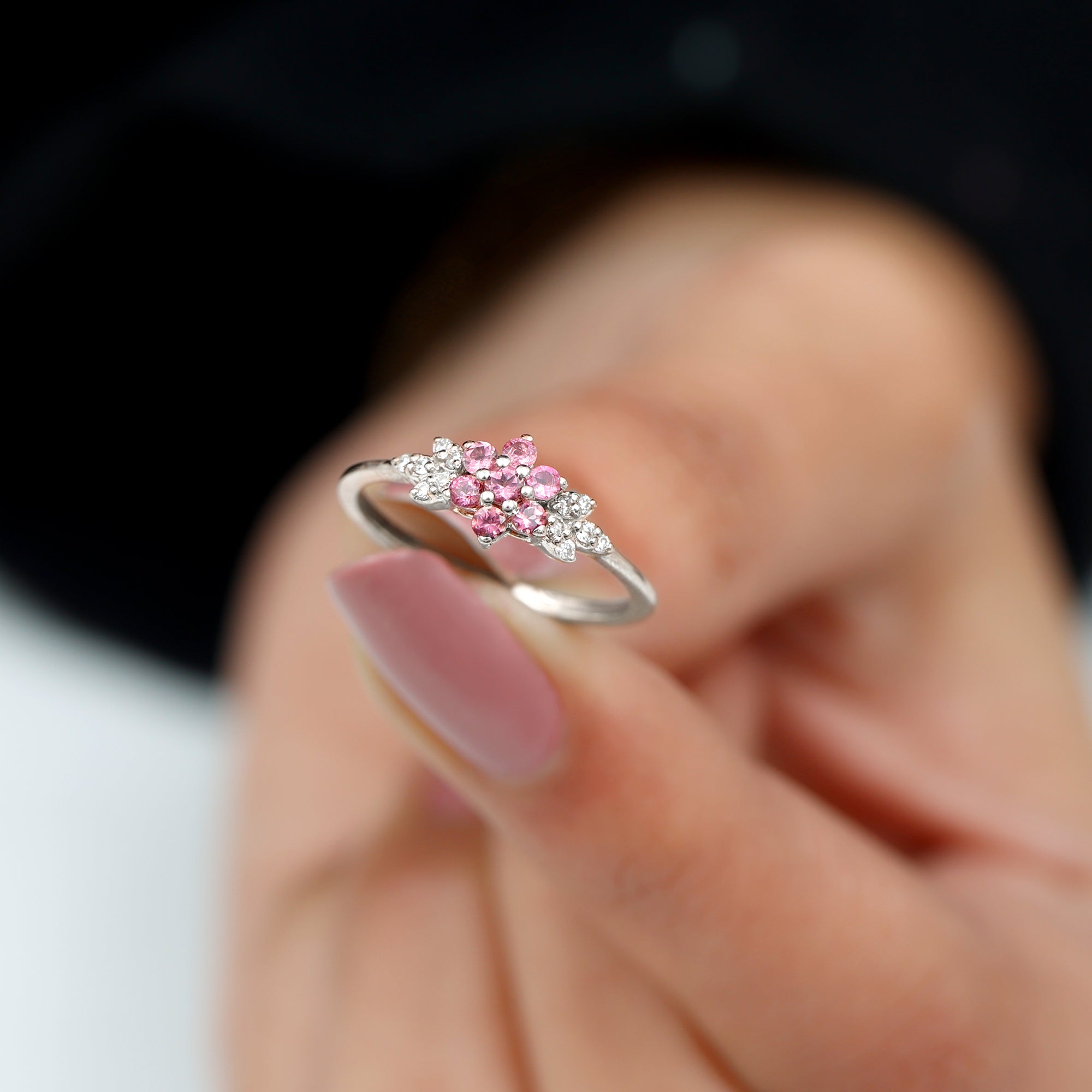 Real Pink Tourmaline Flower Cluster Ring with Diamond