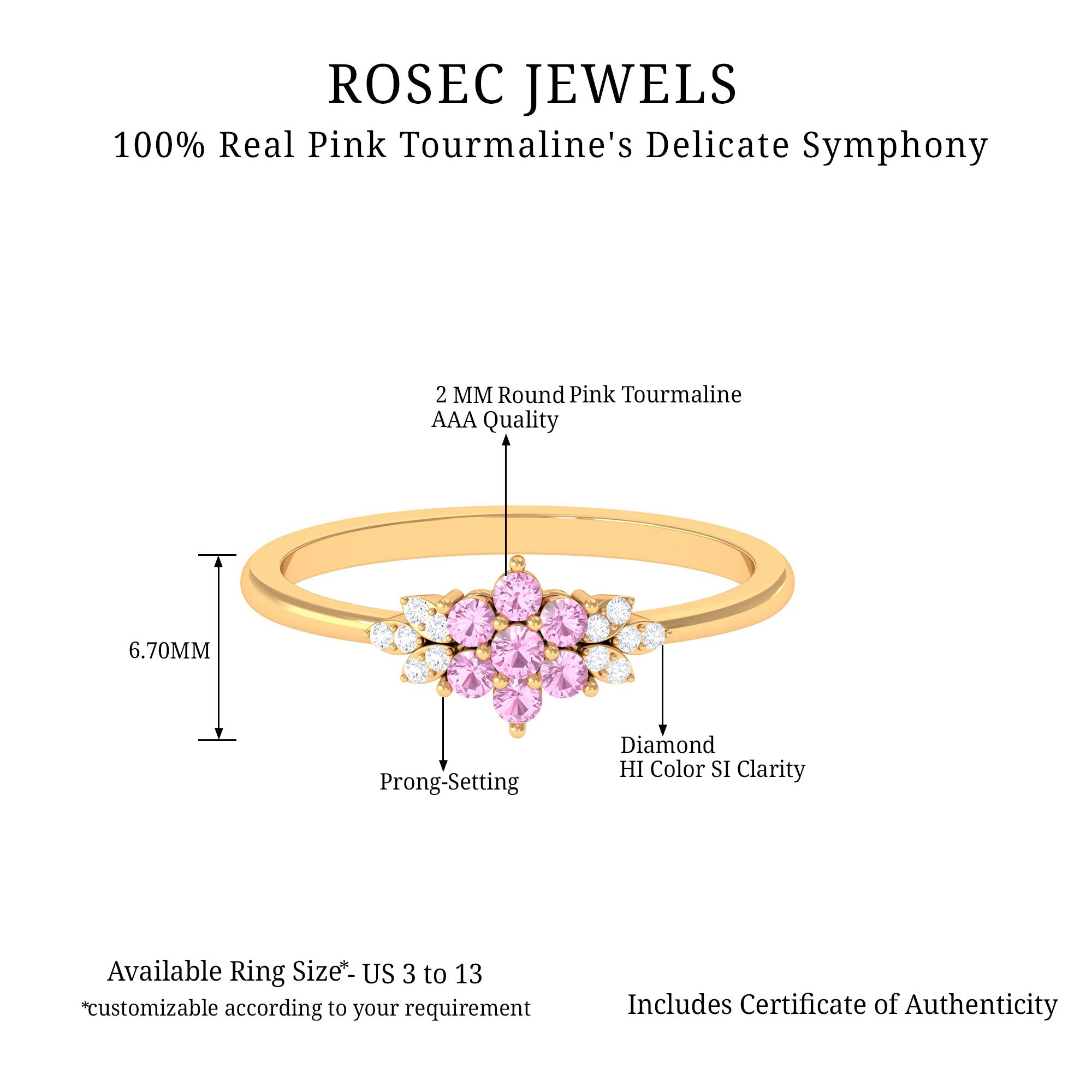 Behold the ideal of floral elegance in our Flower Cluster Ring, featuring captivating round Real Pink Tourmaline stones at its heart, artfully resembling a blooming flower. Adorning the sides are exquisite white round Diamonds, skillfully set in a delicate leaf motif. This tourmaline ring is a harmonious fusion of natures beauty and timeless craftsmanship, making it the perfect symbol of love and admiration.