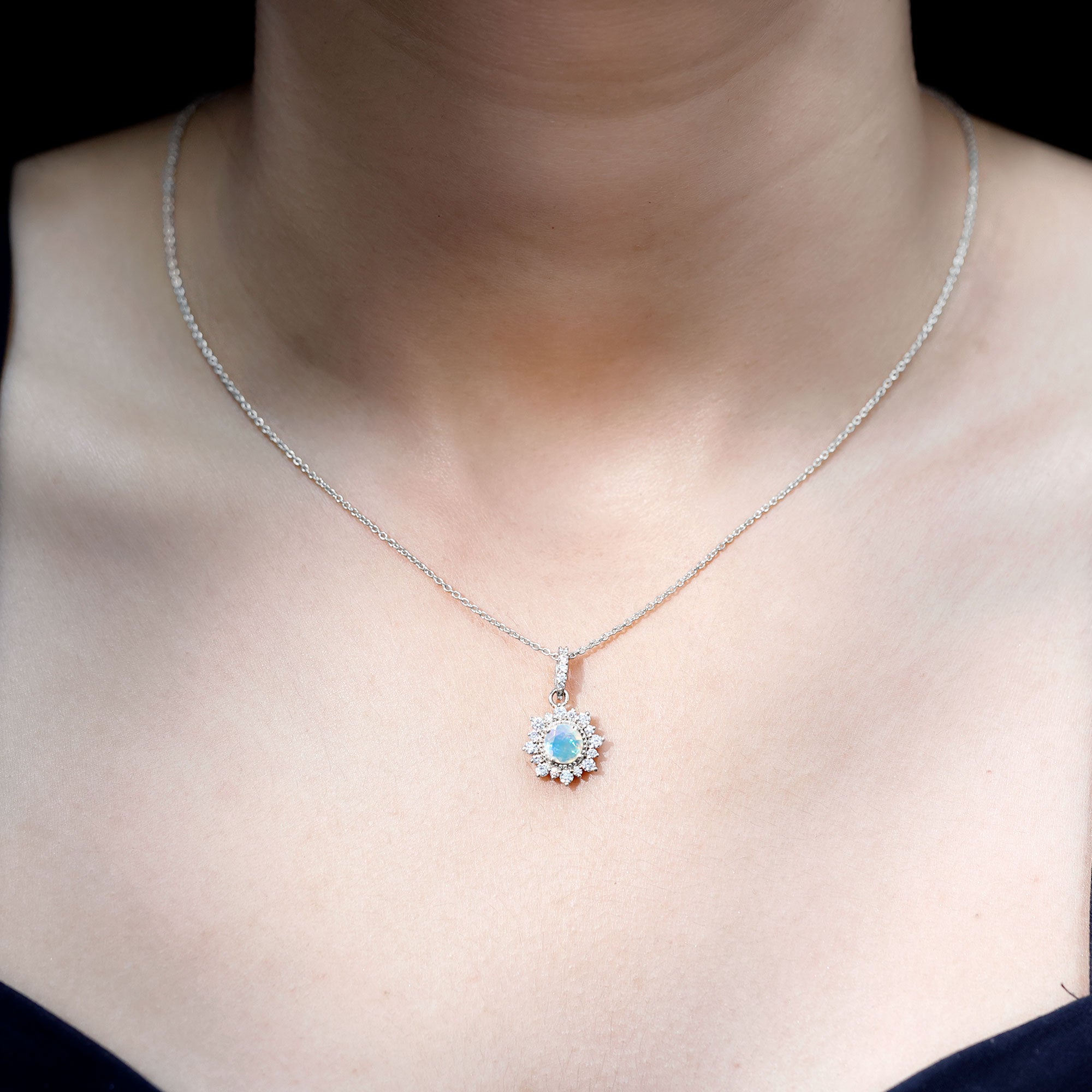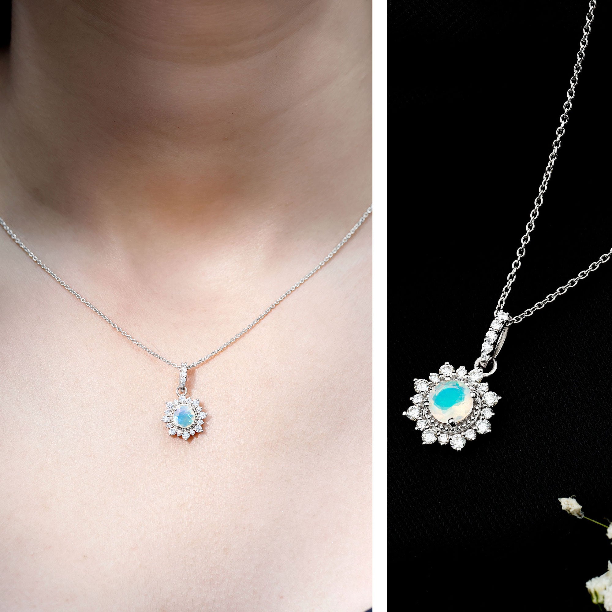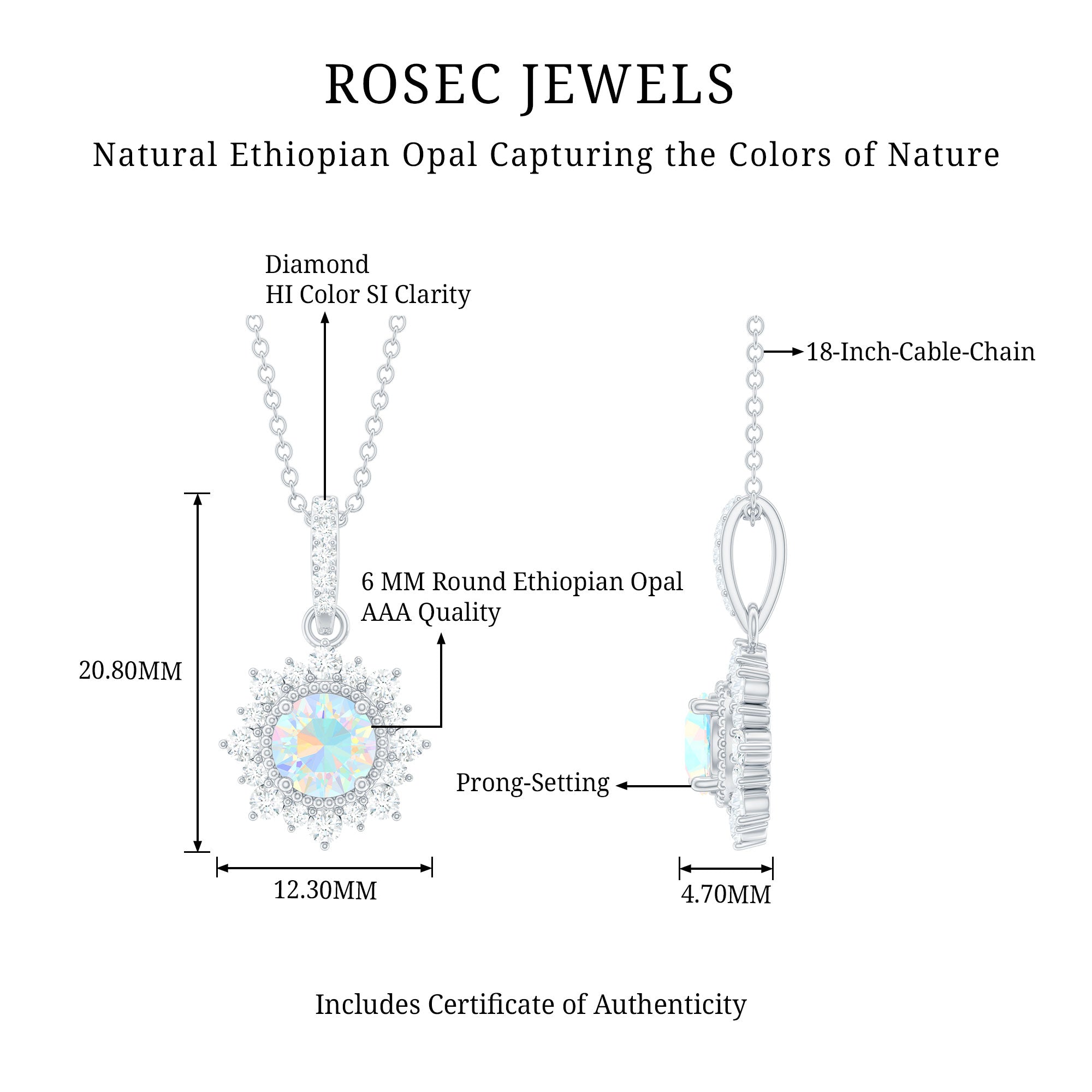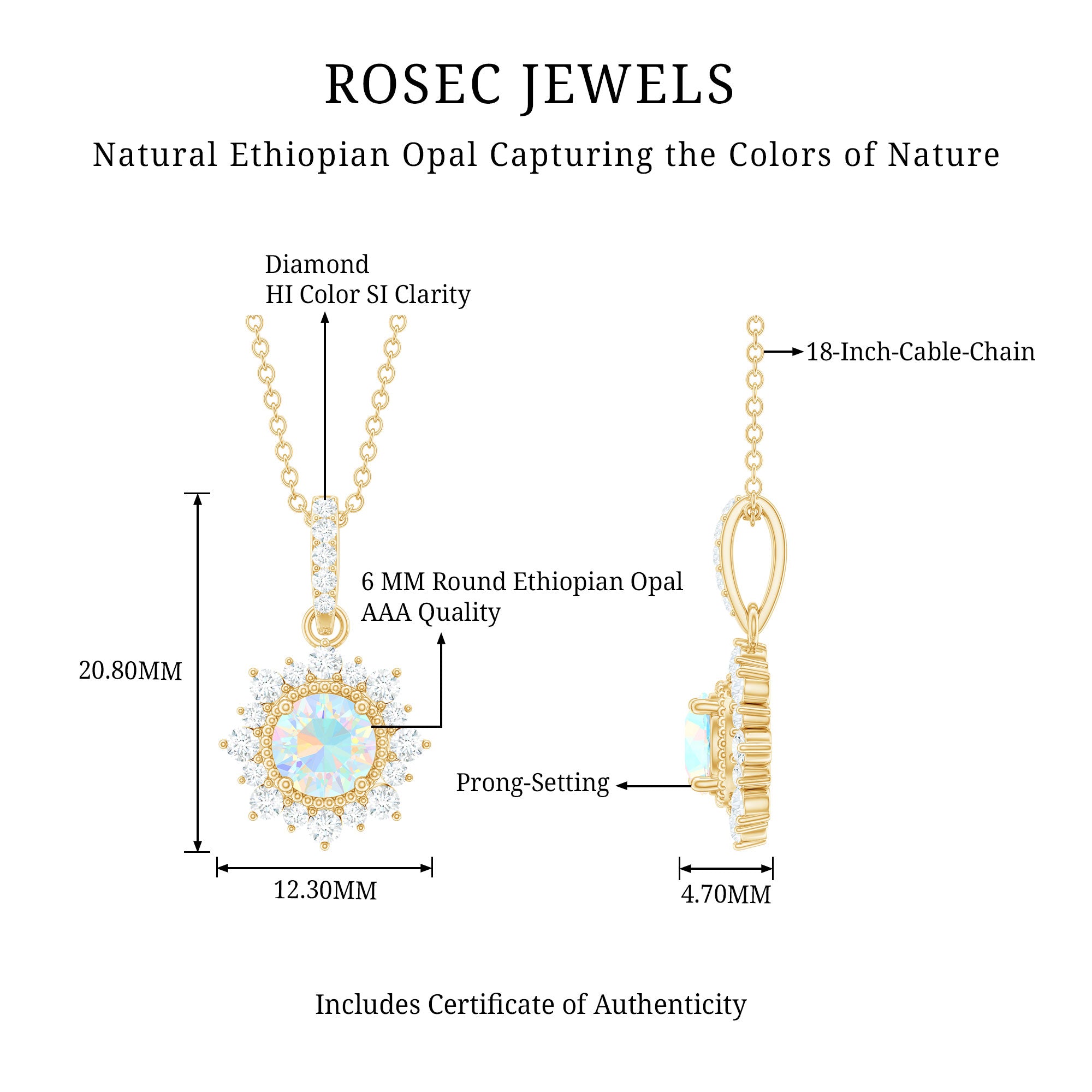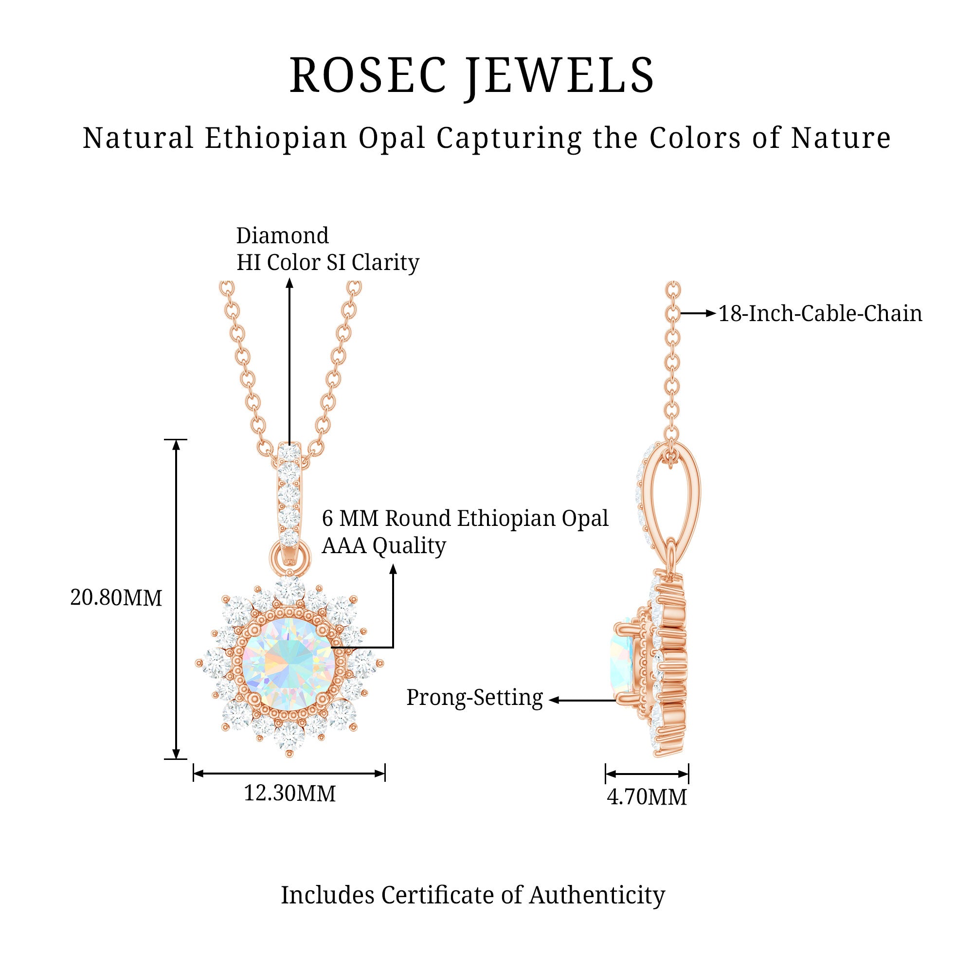 This Ethiopian Opal Pendant exudes an astonishing shine that will grab all the attention of you. It features a 6 MM Ethiopian Opal encircled with smaller diamonds along with beaded detailing creating an enchanting allure. The center stone is securely placed in Prong Setting and dangles with a diamond studded bail. This Halo Necklace exudes the unmatchable shine of AAA Quality Ethiopian Opal and HI-SI Quality Diamonds that amplify the shine of pendant. This Solitaire Pendant will surprise your lady when you present it to her on a special day. The pendant will be delivered to you in a premium jewelry box with the certificate of authentication.