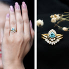 Say yes to bold beauty with this unique and modern Swiss Blue Topaz Bridal Ring Set, crafted to stand out while celebrating your forever. The engagement ring features a striking 5 MM trilliant cut Swiss Blue Topaz, bezel set for a sleek, secure, and contemporary look. Surrounding the topaz is a delicate half halo of sparkling round moissanite stones, adding extra shimmer and drawing the eye to the vibrant center. The matching curved wedding band is designed to perfectly hug the engagement ring, creating a seamless and elegant fit. It features a stunning mix of round and marquise cut moissanites, carefully prong set to showcase their exceptional fire and brilliance. This Engagement Ring with Wedding Band is curated in yellow gold plated silver, adding warmth and softness to the design. The blend of modern structure and romantic curves makes this Blue Topaz Wedding Set a beautiful symbol of your unique love story. Whether you are proposing or searching for a wedding set that feels truly personal, this designer duo offers the perfect mix of color, sparkle, and sophistication. It is made for someone who loves something a little different, but still incredibly elegant.