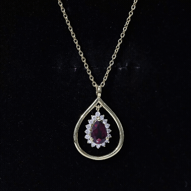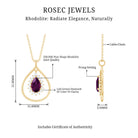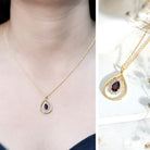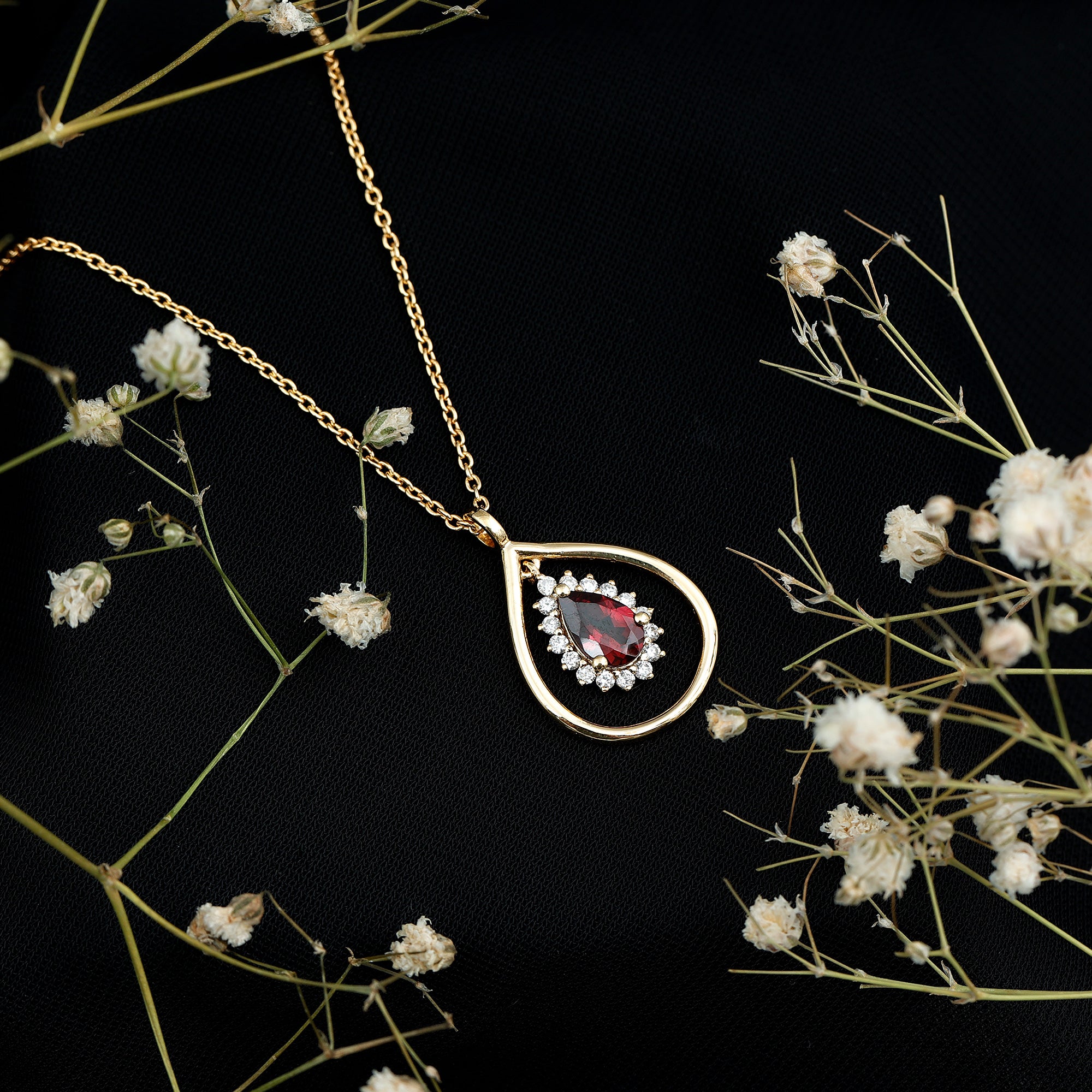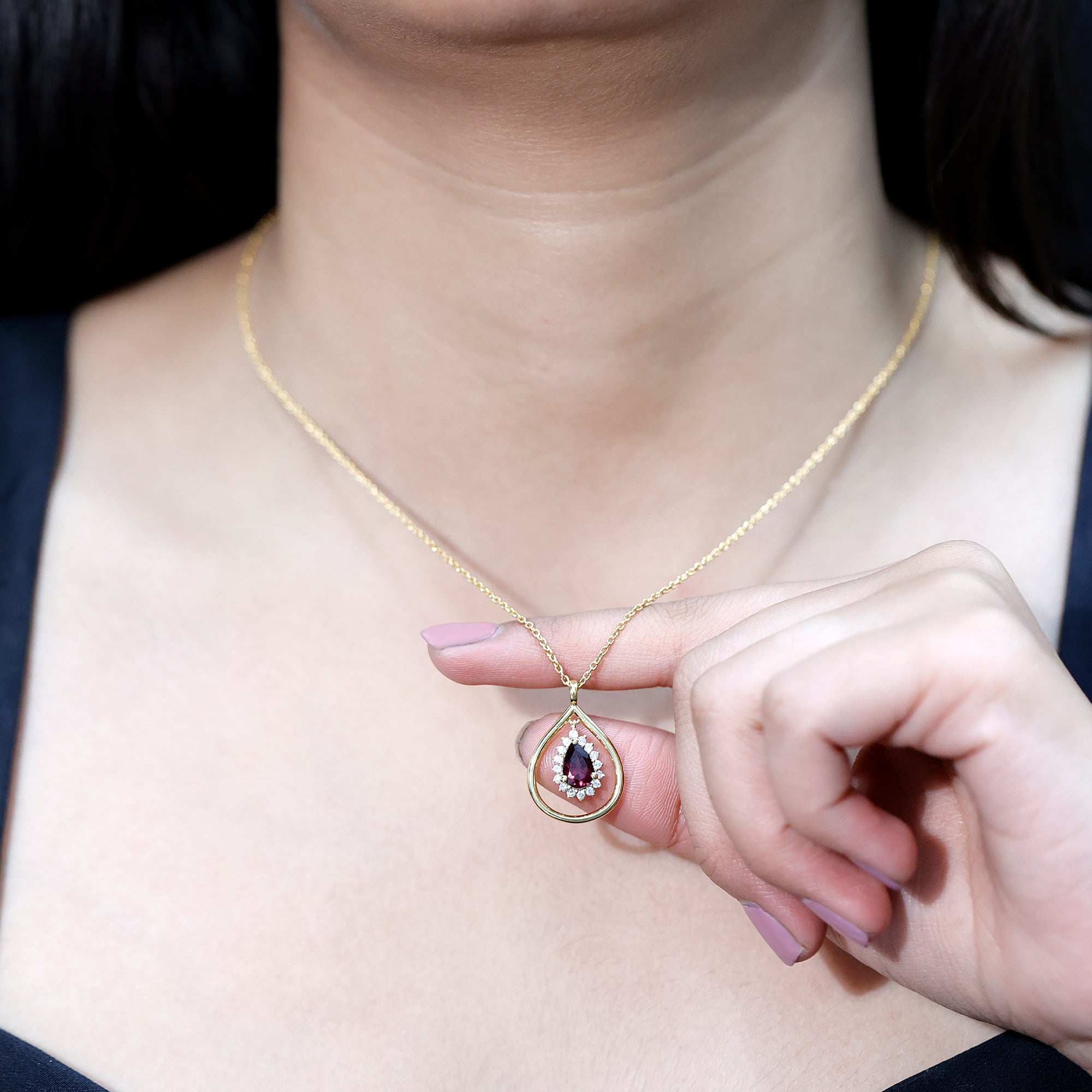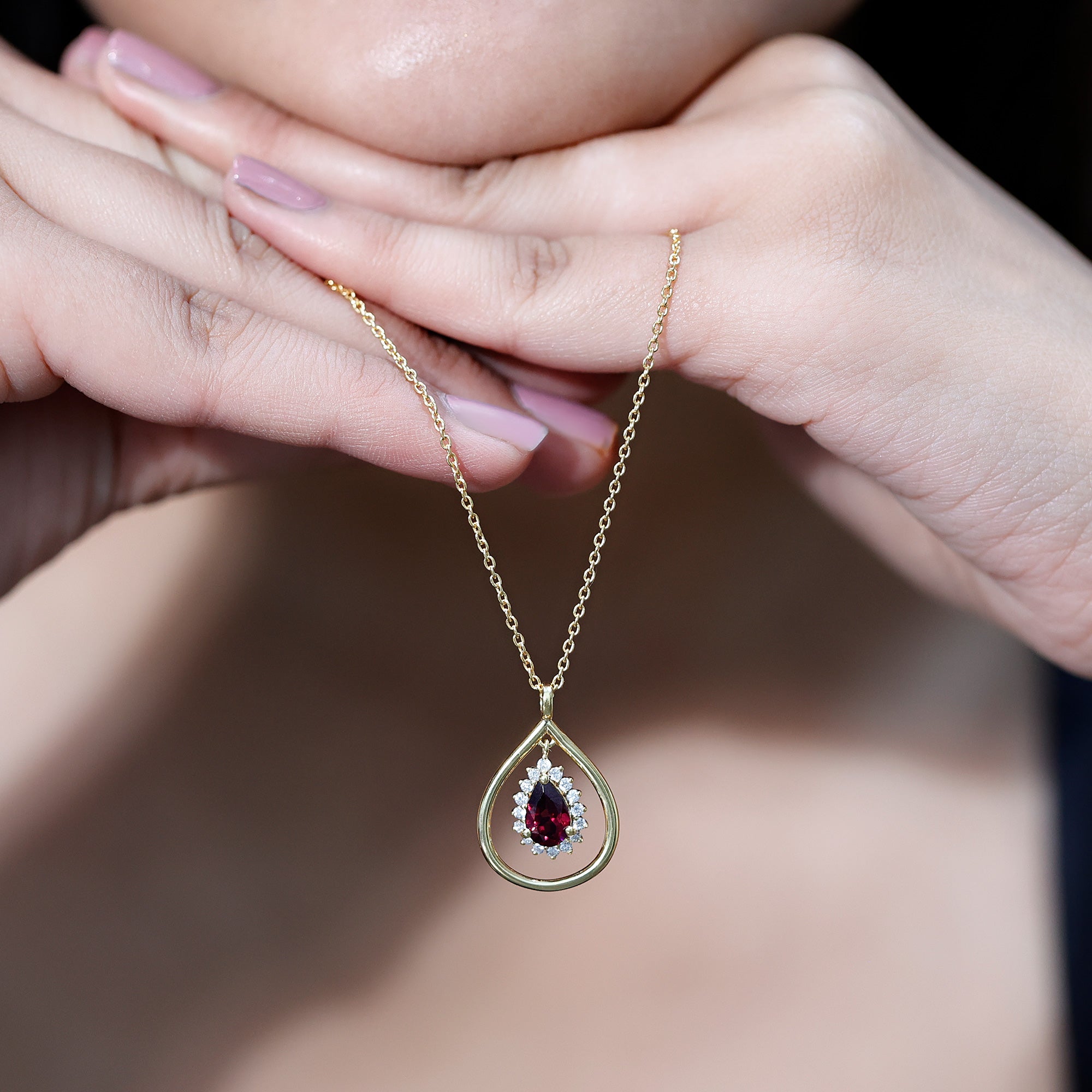 Romantic, elegant, and designed to capture attention, this Rhodolite Garnet Necklace is the kind of piece that feels meaningful from the moment you see it. Handcrafted in 14k yellow gold plated silver, it features a 5X8 MM pear shaped Rhodolite. Nestled in a secure prong setting, the center stone is surrounded by a halo of brilliant round lab grown diamonds, adding a soft sparkle that perfectly complements the center gems vivid hue. Both the AAA quality Rhodolite and the EF-VS quality lab grown diamonds are chosen for their exceptional beauty and shine, making this Teardrop Necklace a thoughtful blend of elegance and top-notch craftsmanship. The open teardrop frame gives the Halo Pendant a light, graceful feel, while the smooth cable chain adds simplicity and strength, making it ideal for both everyday wear and special moments. Whether you are dressing up for a night out or adding a pop of romance to your daily look, this Rhodolite and Diamond Necklace brings a touch of timeless beauty to every outfit. Perfect as a gift for a loved one or a meaningful treat for yourself, it is a beautiful way to mark life’s special moments like anniversaries, birthdays, or quiet milestones worth remembering.