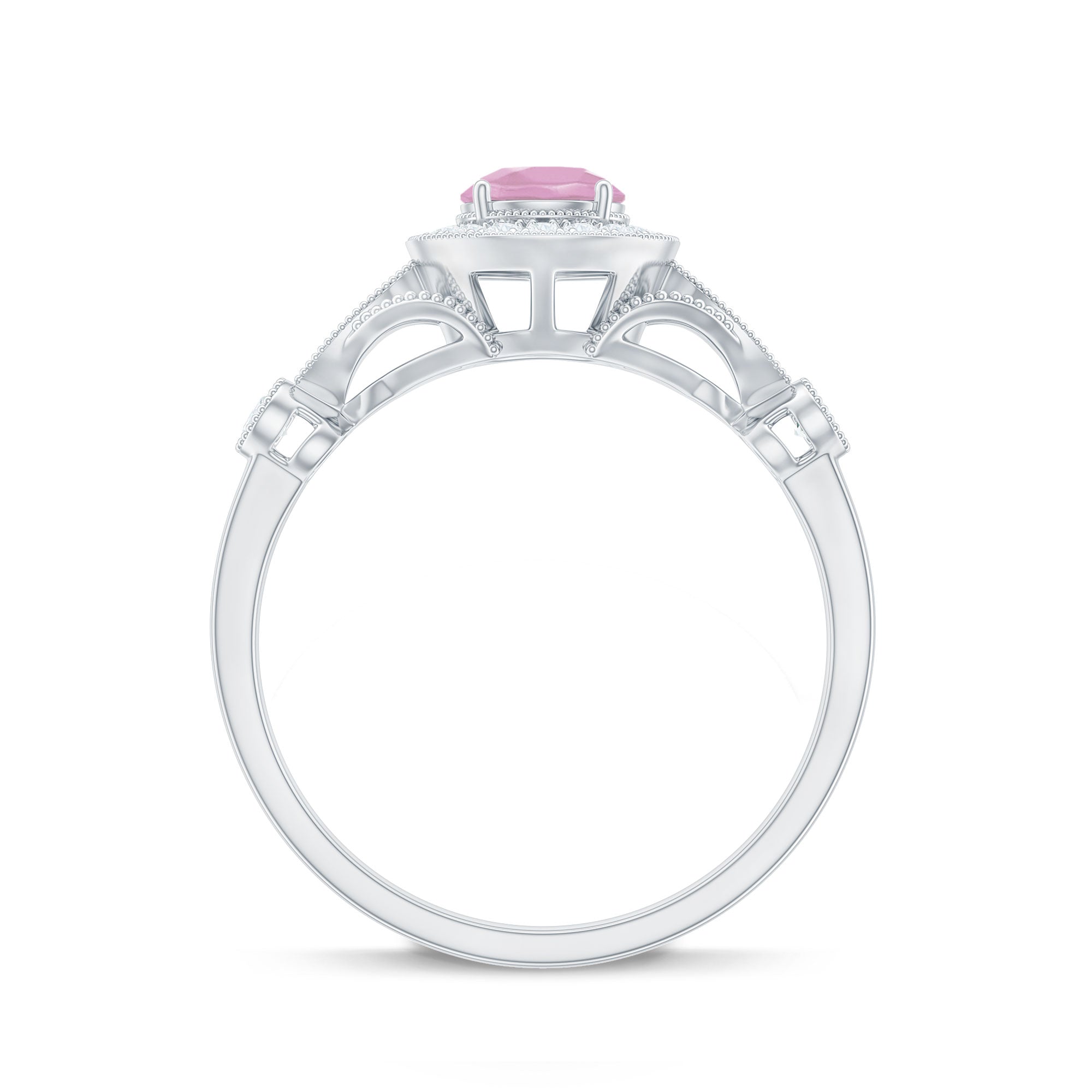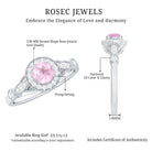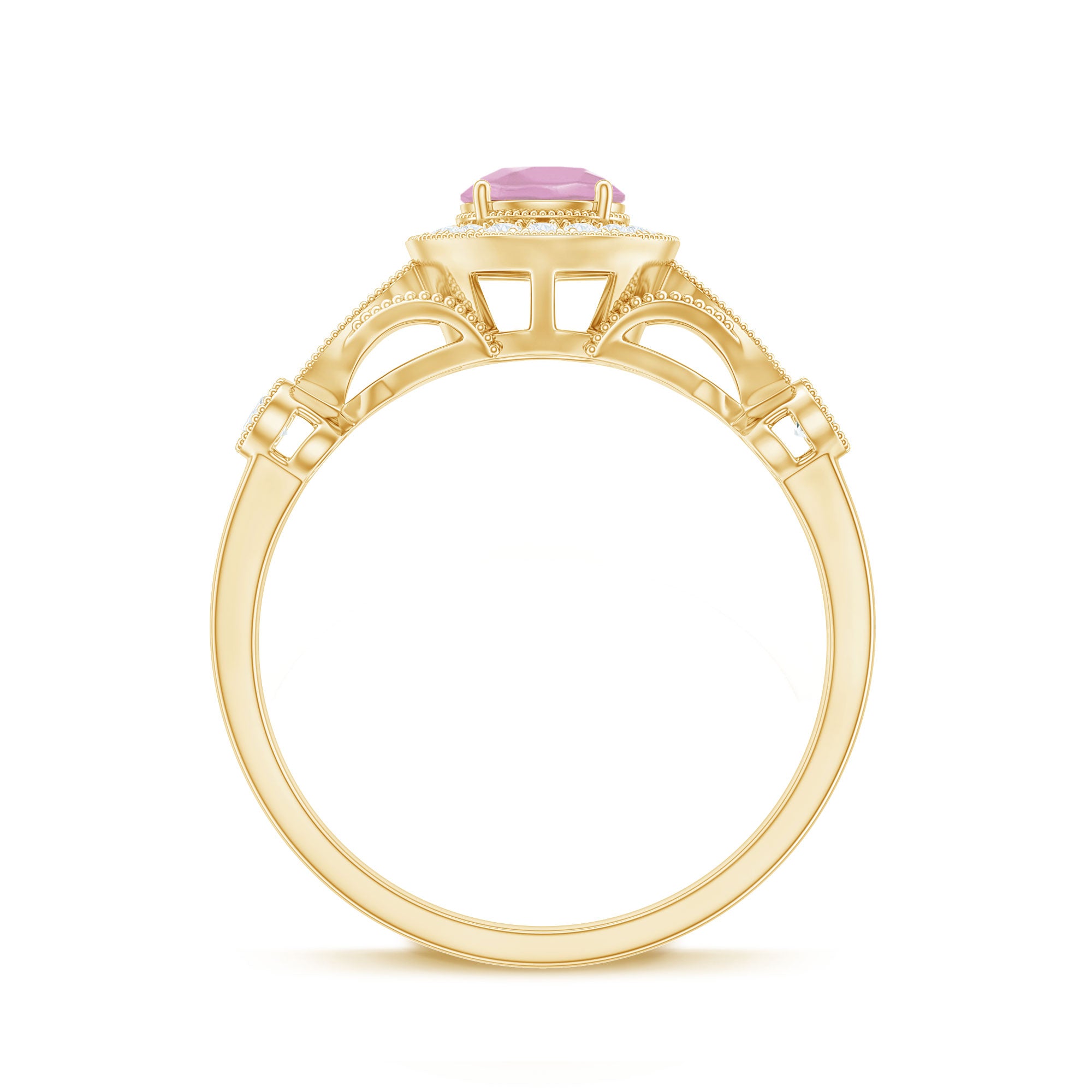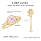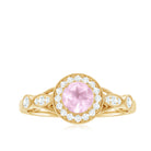 The Vintage Engagement Ring is adorned with a 5 MM Round Shape Rose Quartz in 4 Prong Setting mounted in Solid Gold and embellished with Round Diamond arranged in Halo on the Solitaire Ring. The Engagement Ring is also decorated with Milgrain for a Vintage look.