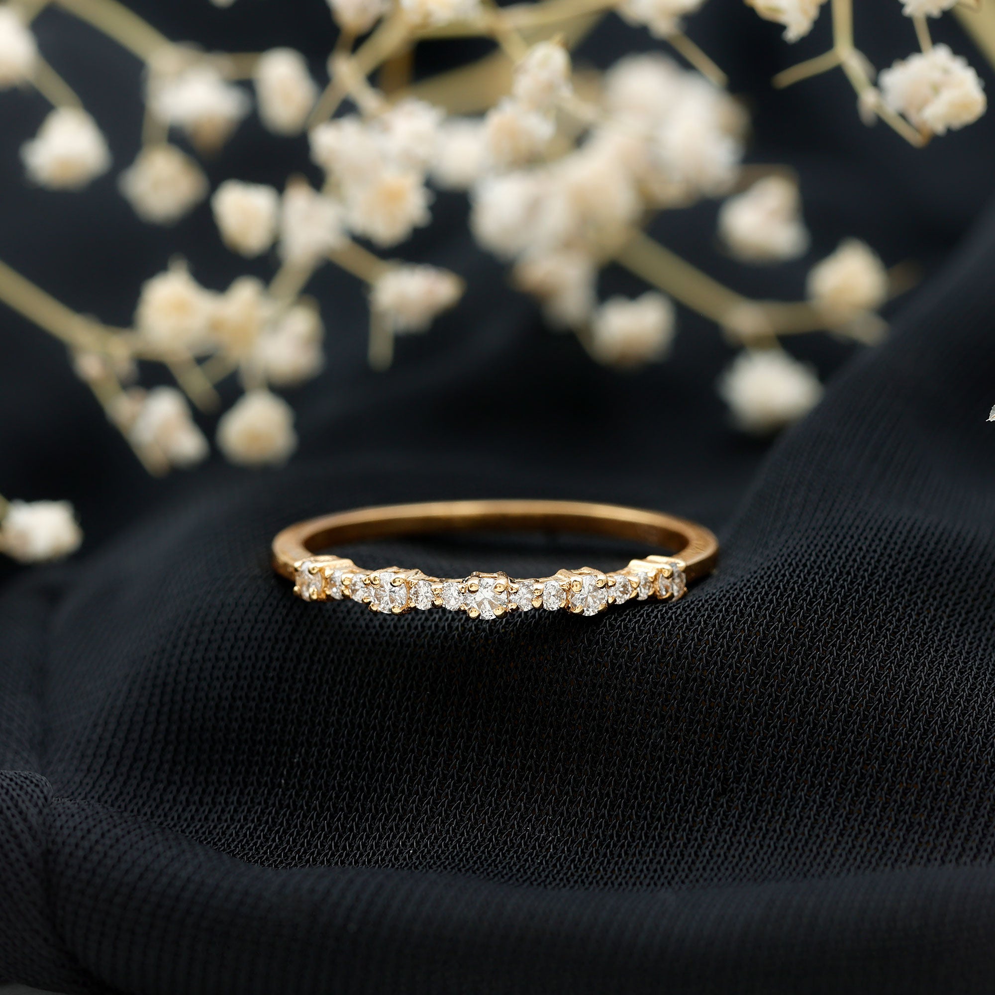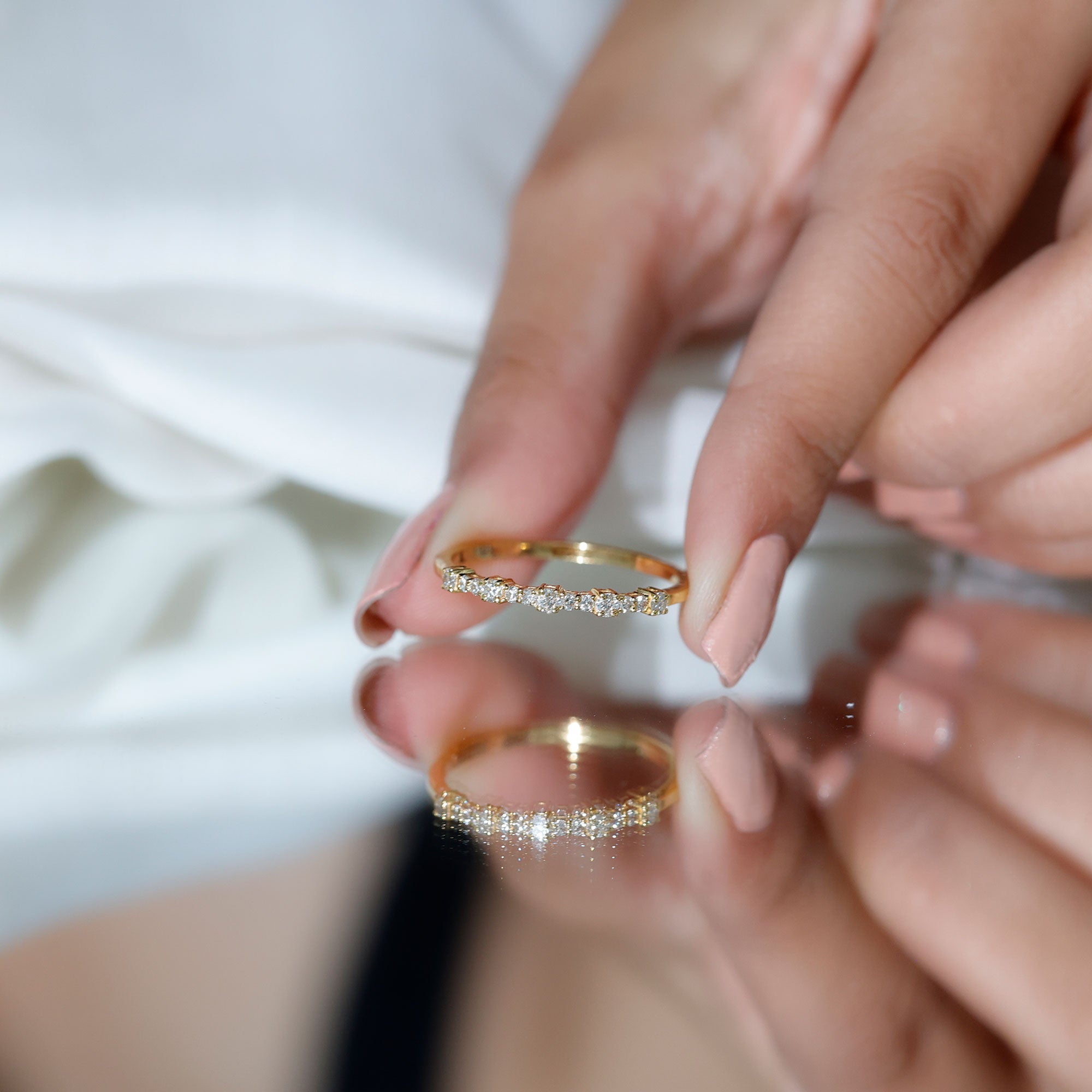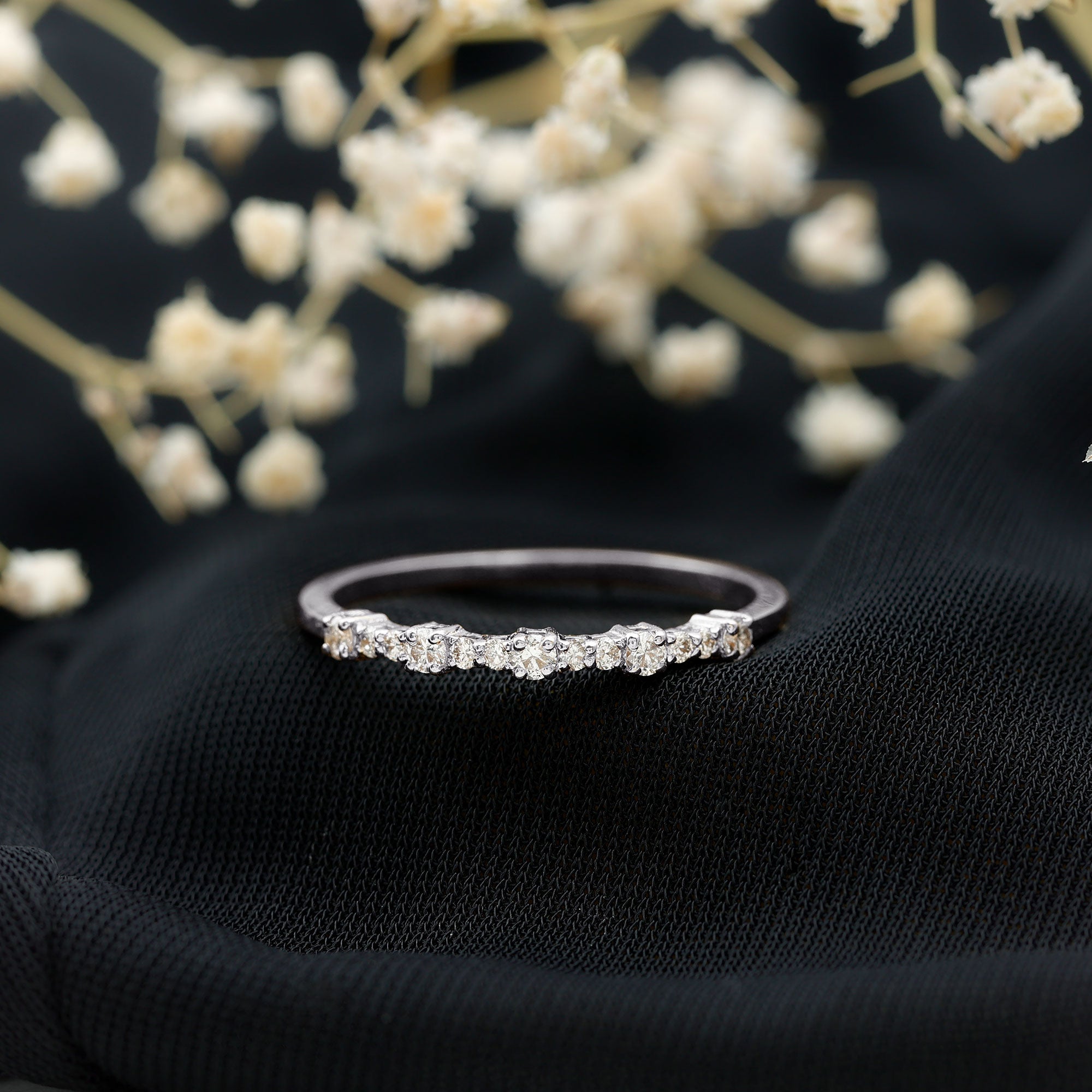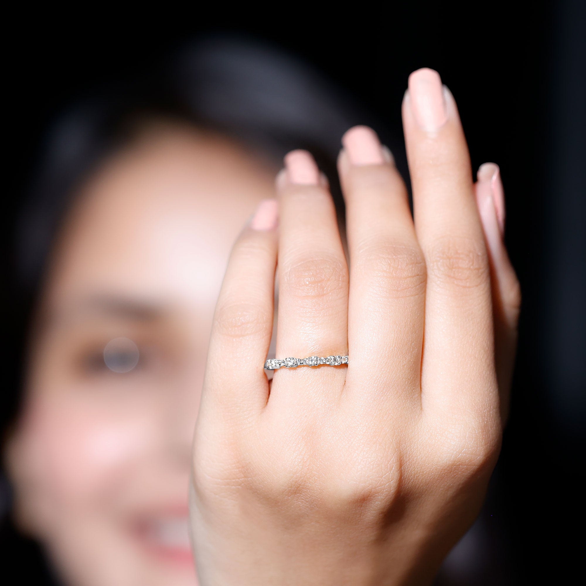 Check gemstone shapes: To create a uniform stack, gemstone shape must be considered. It's very important to play with proportions carefully. Like for your teardrop sapphire engagement ring, moissanite curved wedding rings can be good complementing rings. Opt shapes that fit well in the stack.