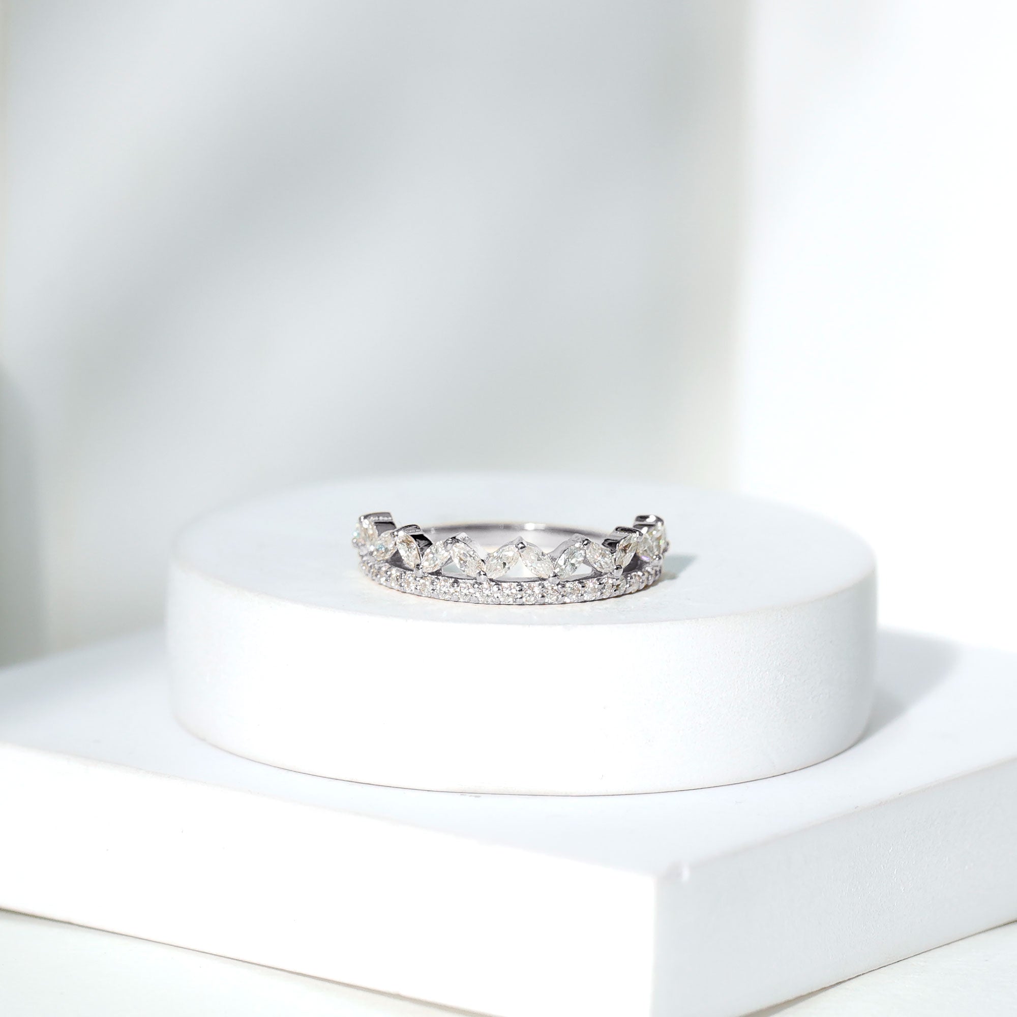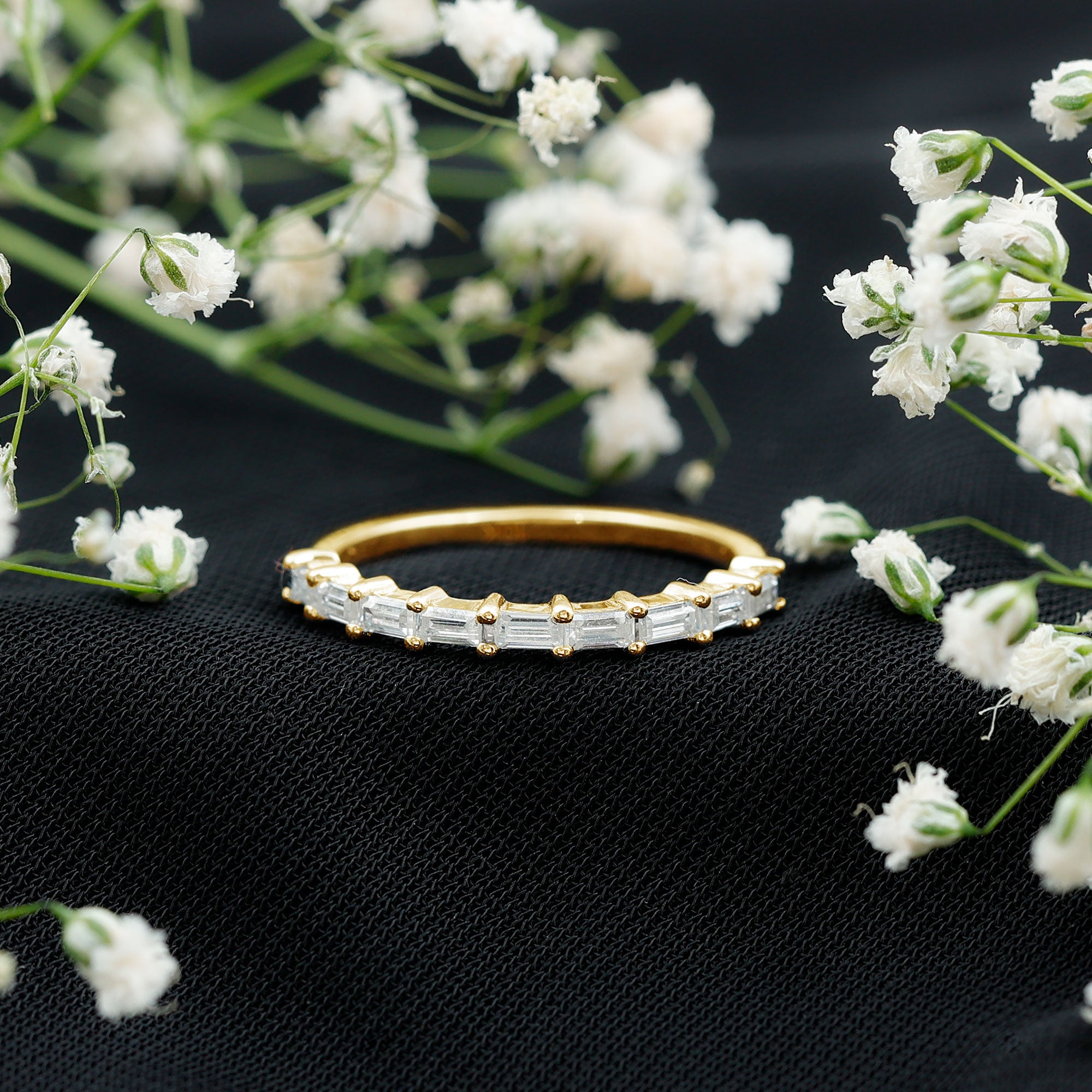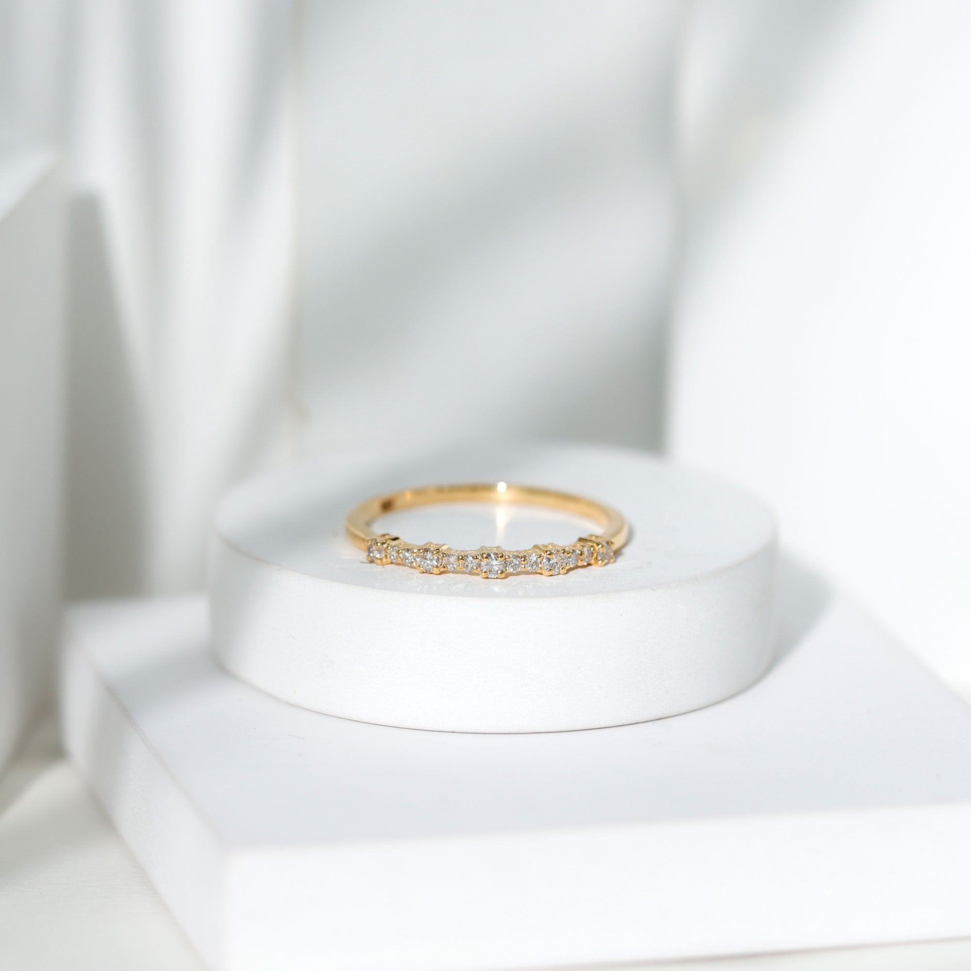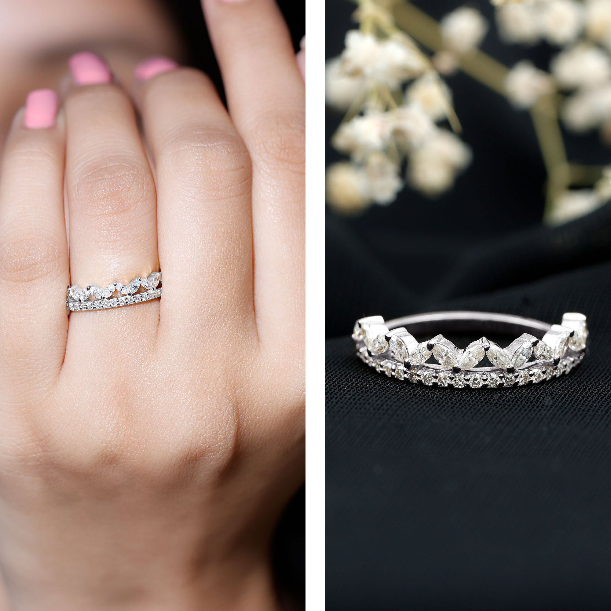 Check gemstone shapes: To create a uniform stack, gemstone shape must be considered. It's very important to play with proportions carefully. Like for your teardrop sapphire engagement ring, moissanite curved wedding rings can be good complementing rings. Opt shapes that fit well in the stack.