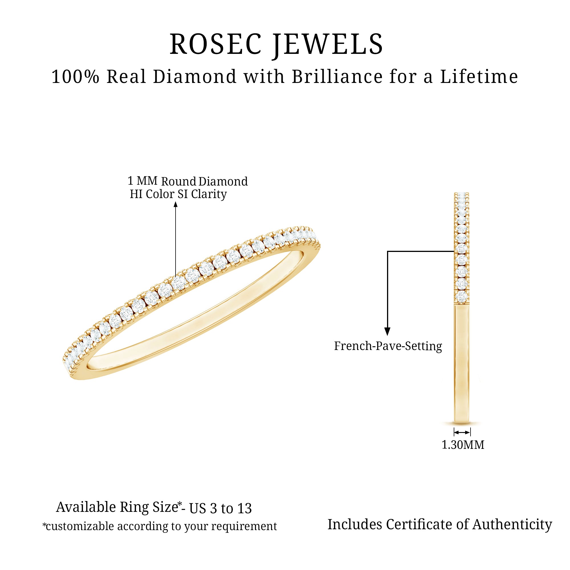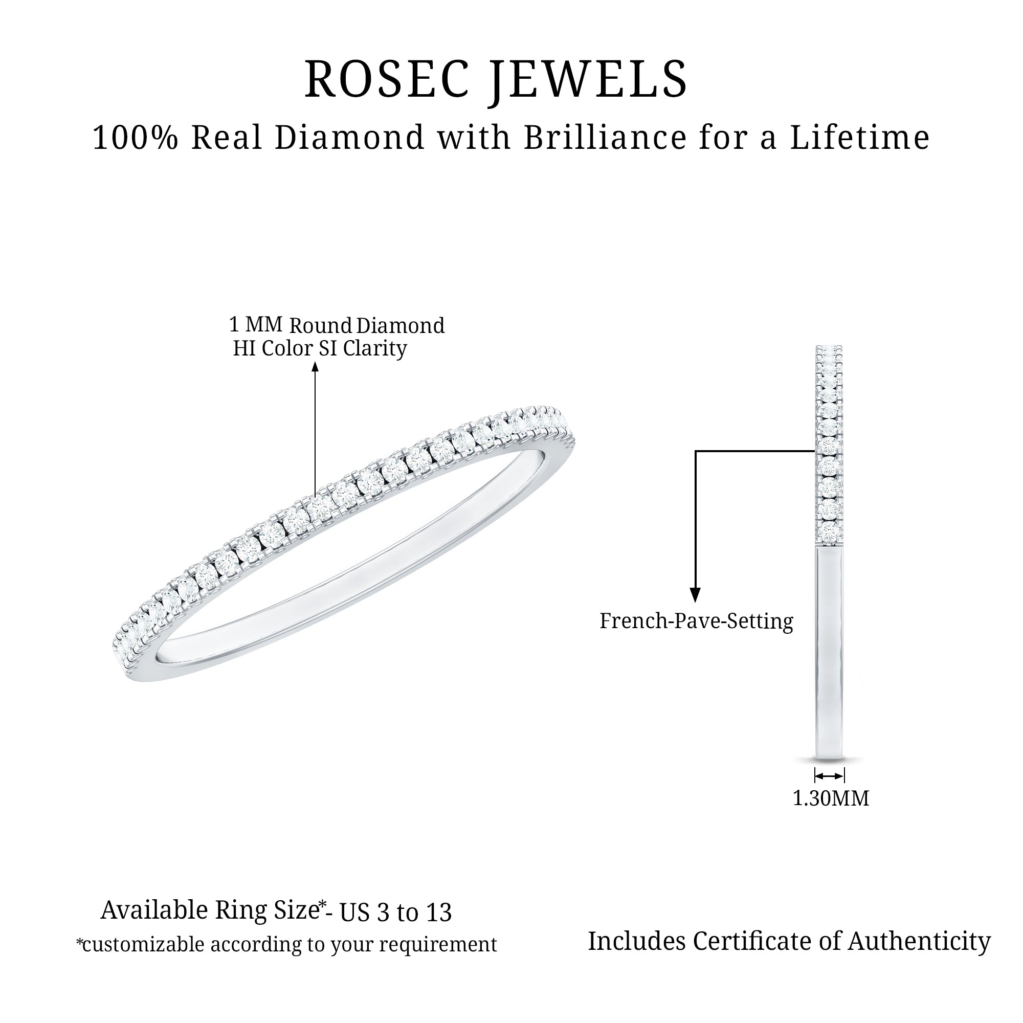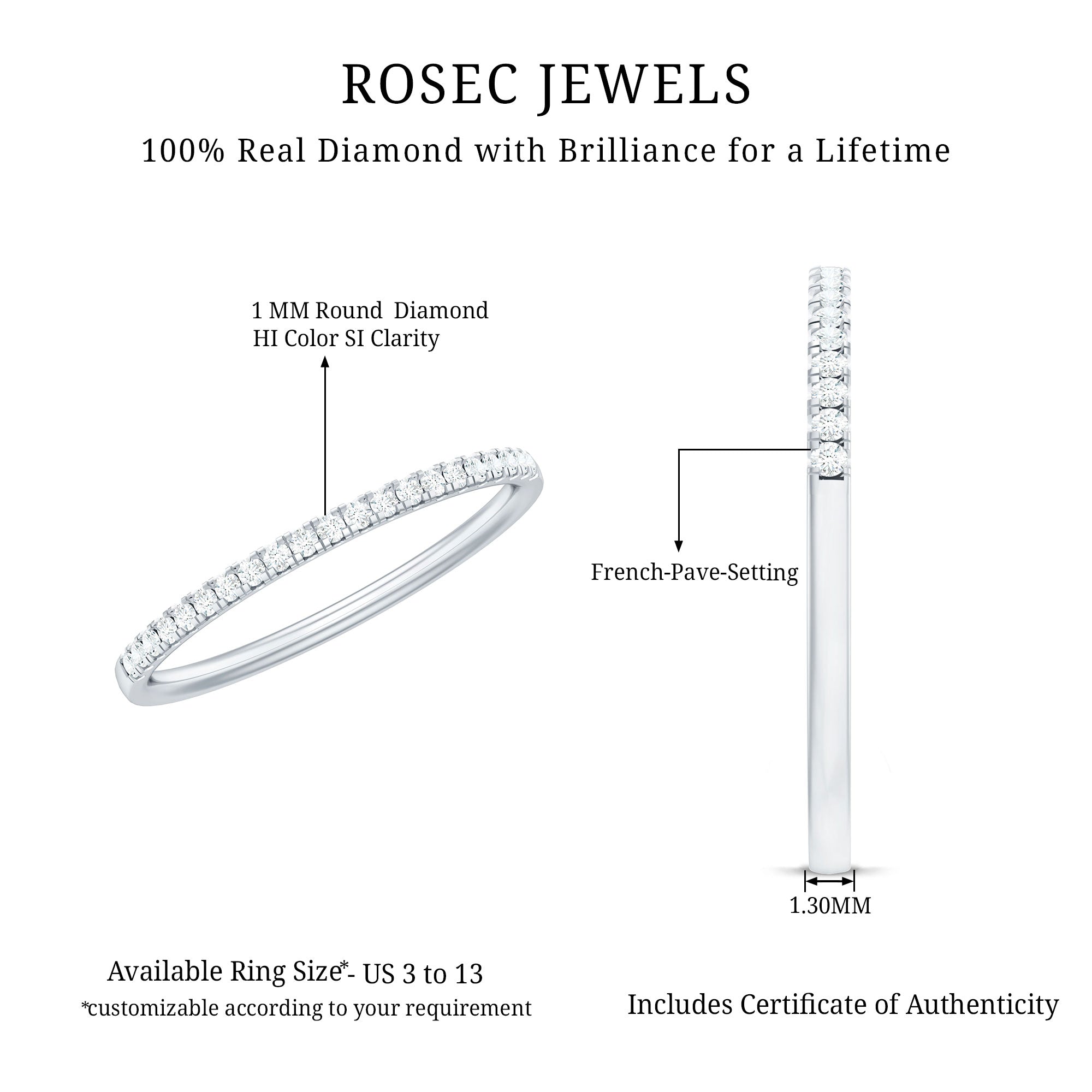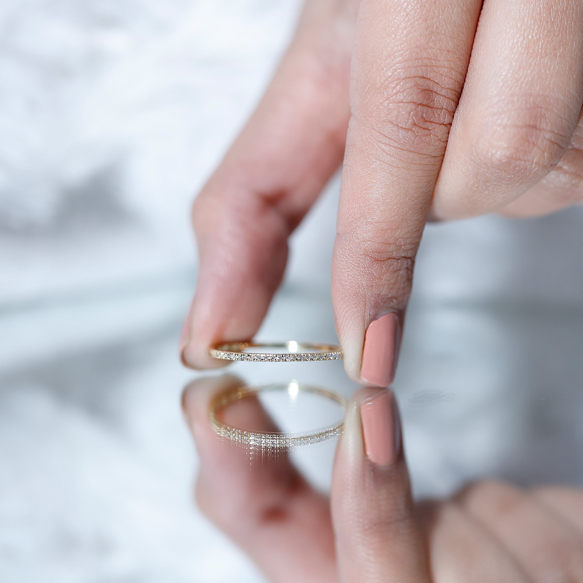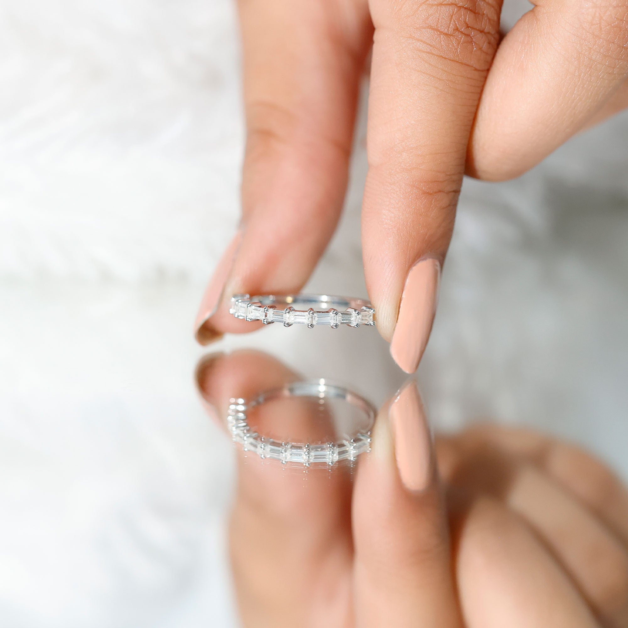 Mixed Color and Metal stacks: Different metals in different colors leave a different effect. Like a yellow gold diamond band, when stacked with a blue sapphire eternity silver band makes a totally different appeal. Rose gold is another option for adding warmth and a romantic touch to your stack.