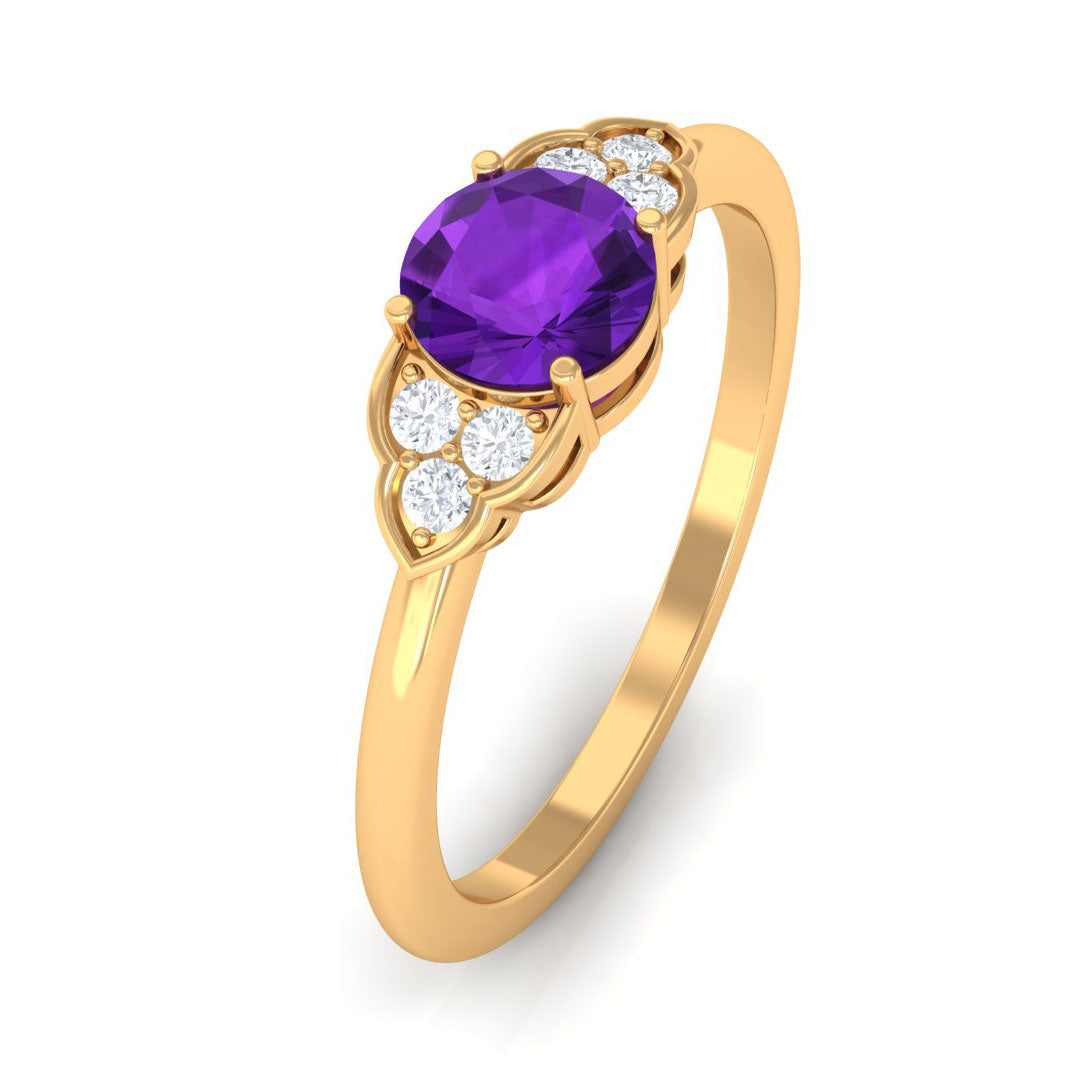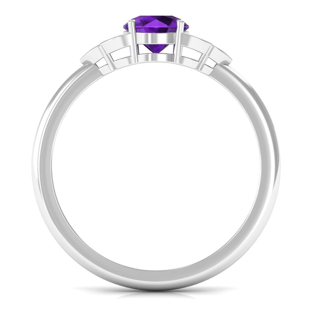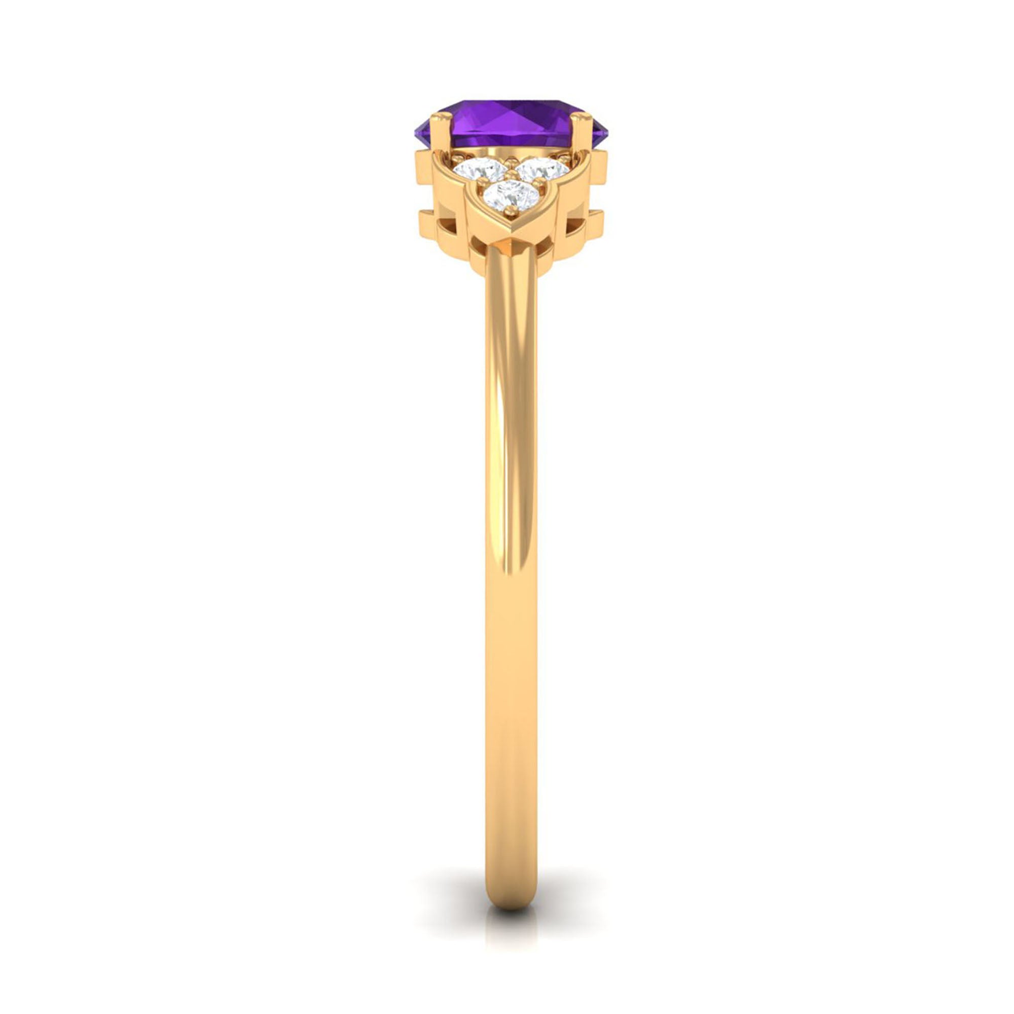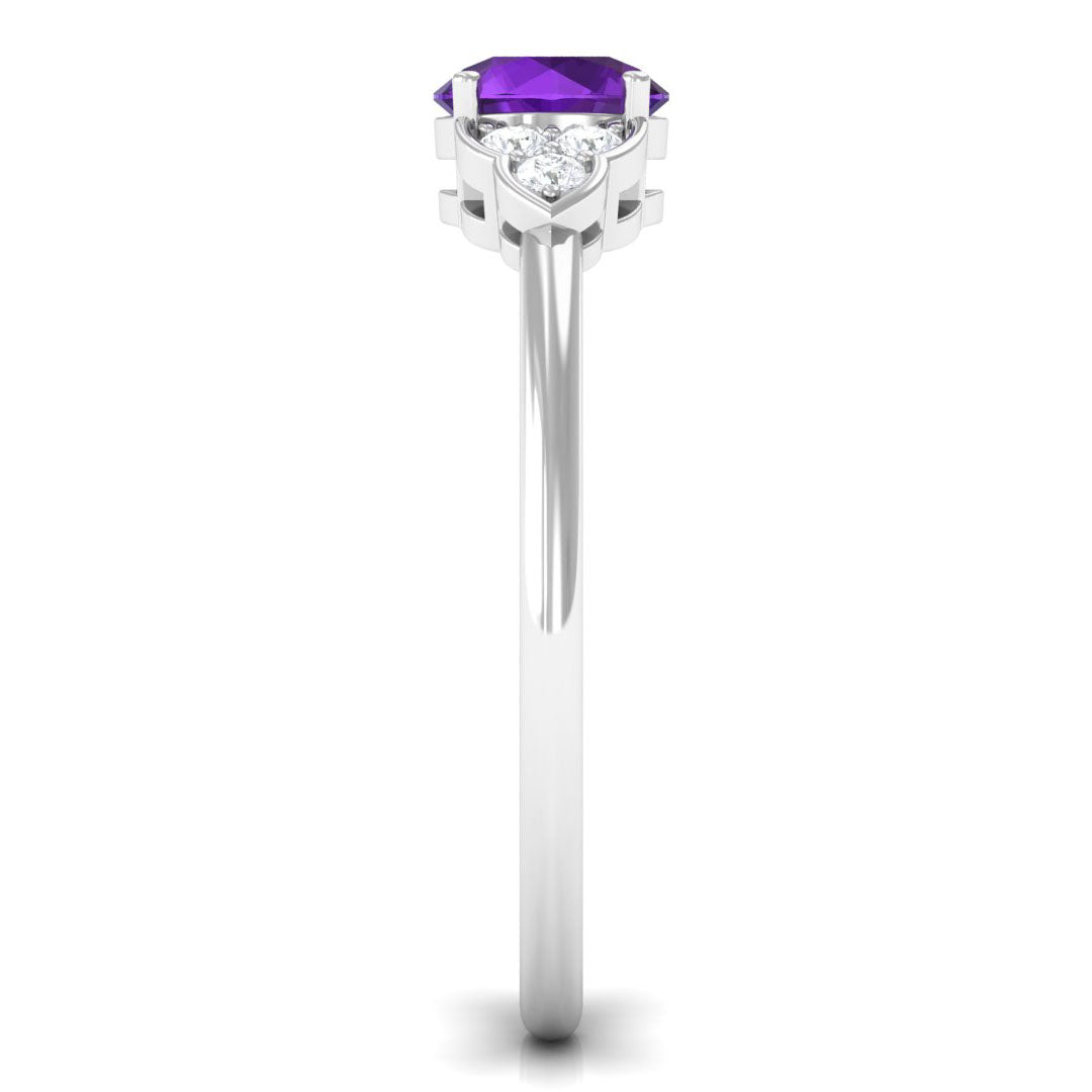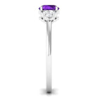 Ask her to spend a lifetime with you with an Amethyst Engagement Ring that represents faithful love, happiness, and pretty much everything that they write fairytales about. Boasting a pretty pop of purple, the Center Stone of 5 MM Round Shape Amethyst sits atop with a trio of Diamond accents flanking it on either side for a beautiful color contrast. All the gemstones in this Certified Amethyst Ring have been handpicked for their color and clarity, making them worthy of commemorating your love forever.