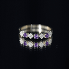 The stunning fusion of elegance and sophistication this Amethyst Eternity Ring is a sleek and beautiful one for your wedding, anniversary or while commemorating the February Birthdays. Featuring a row of vibrant, deep purple Amethysts that complement the Dazzling Round Diamond, to add a touch of sparkle and brilliance. This Amethyst Band Ring offers a timeless appeal with its sleek and modern design. The Half Eternity Ring has a glamorous and stunning full eternity band, that provides a graceful display of gemstones around the finger. The contrast between the Amethyst and Diamond creates a harmonious balance of the natural hue making this ring, perfect for stackable with other wedding bands or worn alone. This Amethyst and Diamond Ring is sure to captivate and enchant with its undeniable charm.