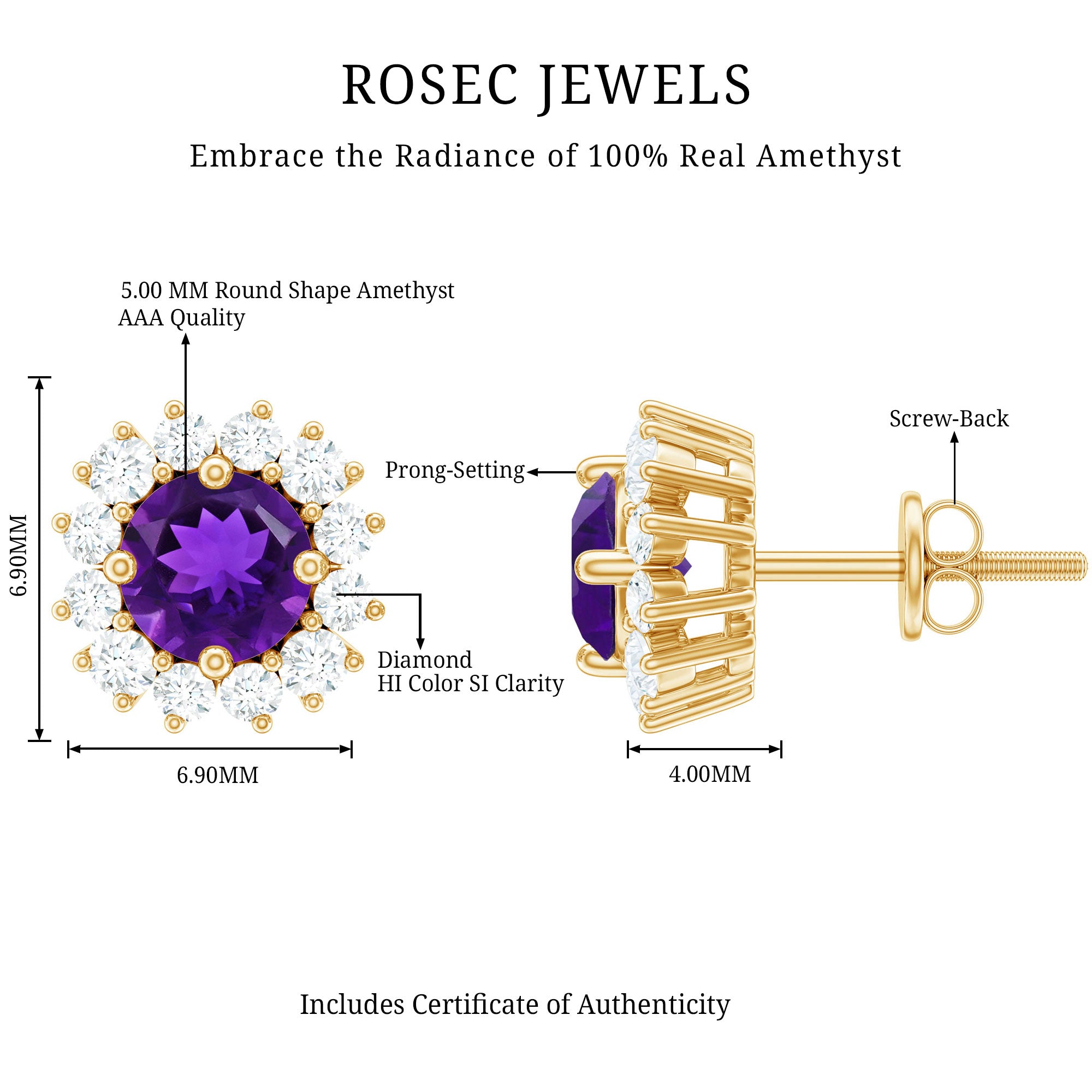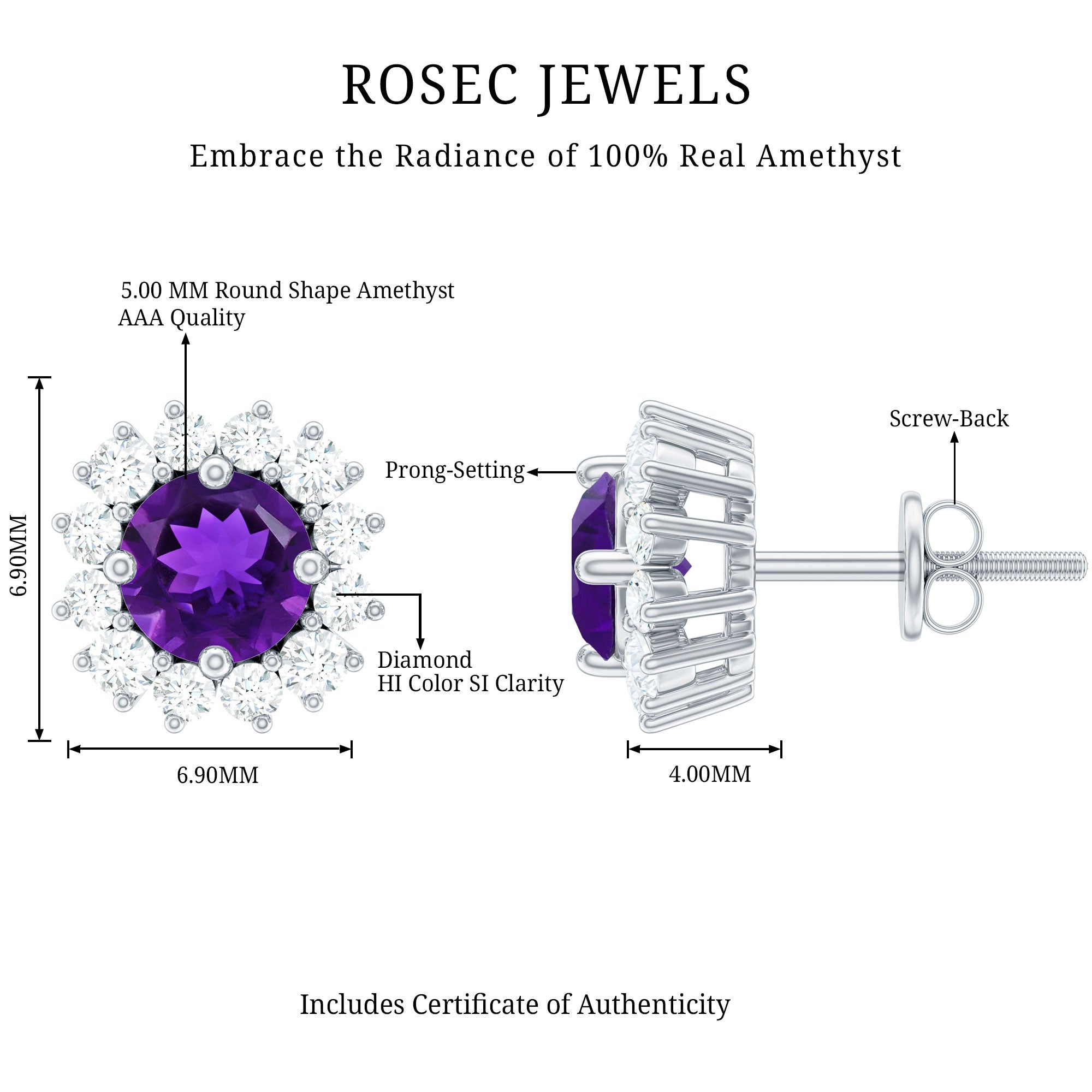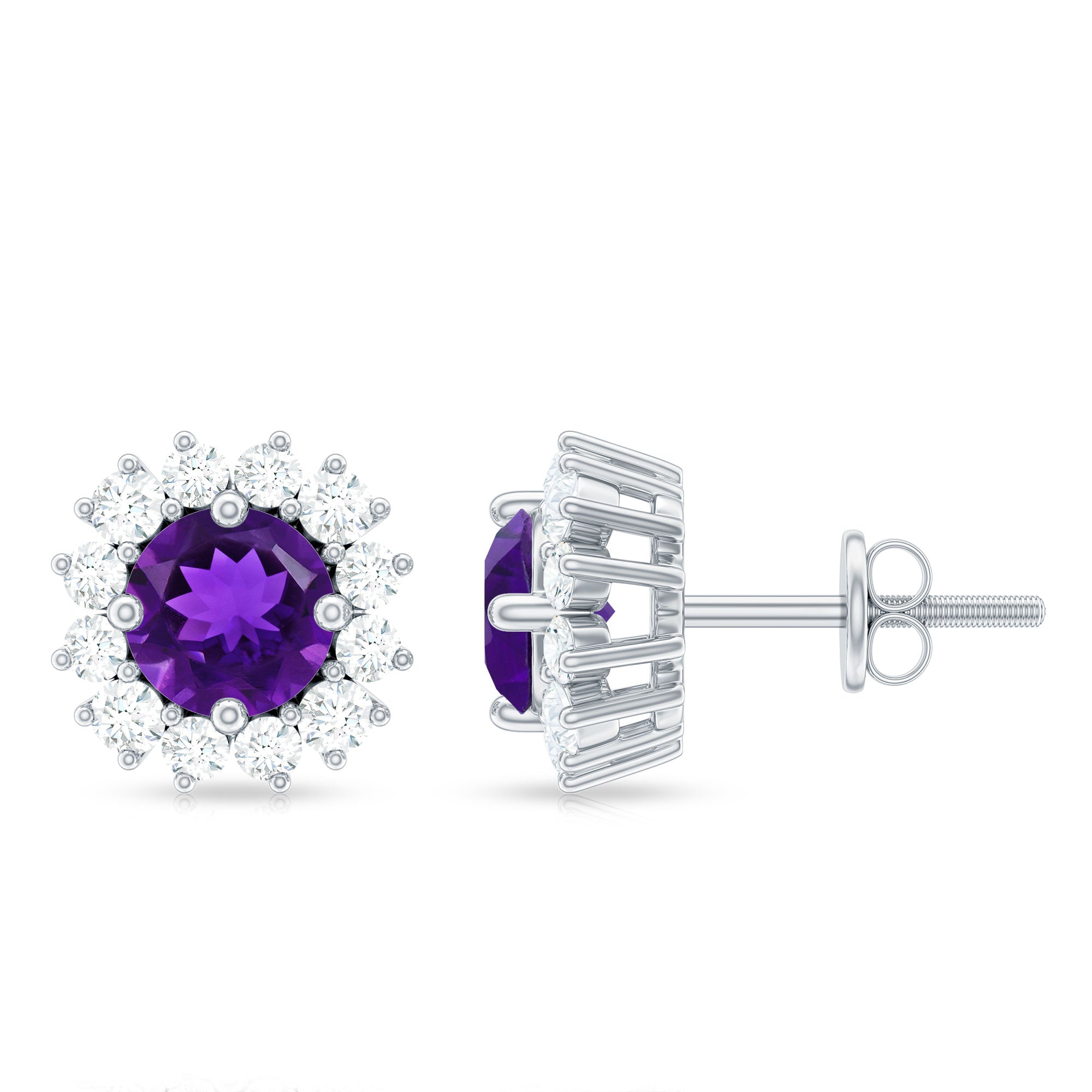 A perfect addition to your jewelry collection, these Amethyst Stud Earrings are a timeless expression of elegance and romance. Each earring features a vivid 5 mm Round Shape Amethyst gemstone, its rich purple hue radiating passion, creativity and sophistication, while a delicate Halo of sparkling Diamond stones surrounds the stone, enhancing its brilliance and adding a touch of celestial shimmer. These Amethyst Diamond Earrings are versatile enough to wear every day or elevate a special evening ensemble, effortlessly blending modern style with enduring charm. Secured with Screw Back Closure, these Amethyst Studs promise both comfort and confidence. Beautifully presented in a signature jewelry box, these Halo Stud Earrings make a thoughtful gift for birthdays, anniversaries or moments when you want to express love and admiration most elegantly. Let the combination of Amethyst and Diamond become your signature sparkle, capturing light, attention and hearts wherever you go.