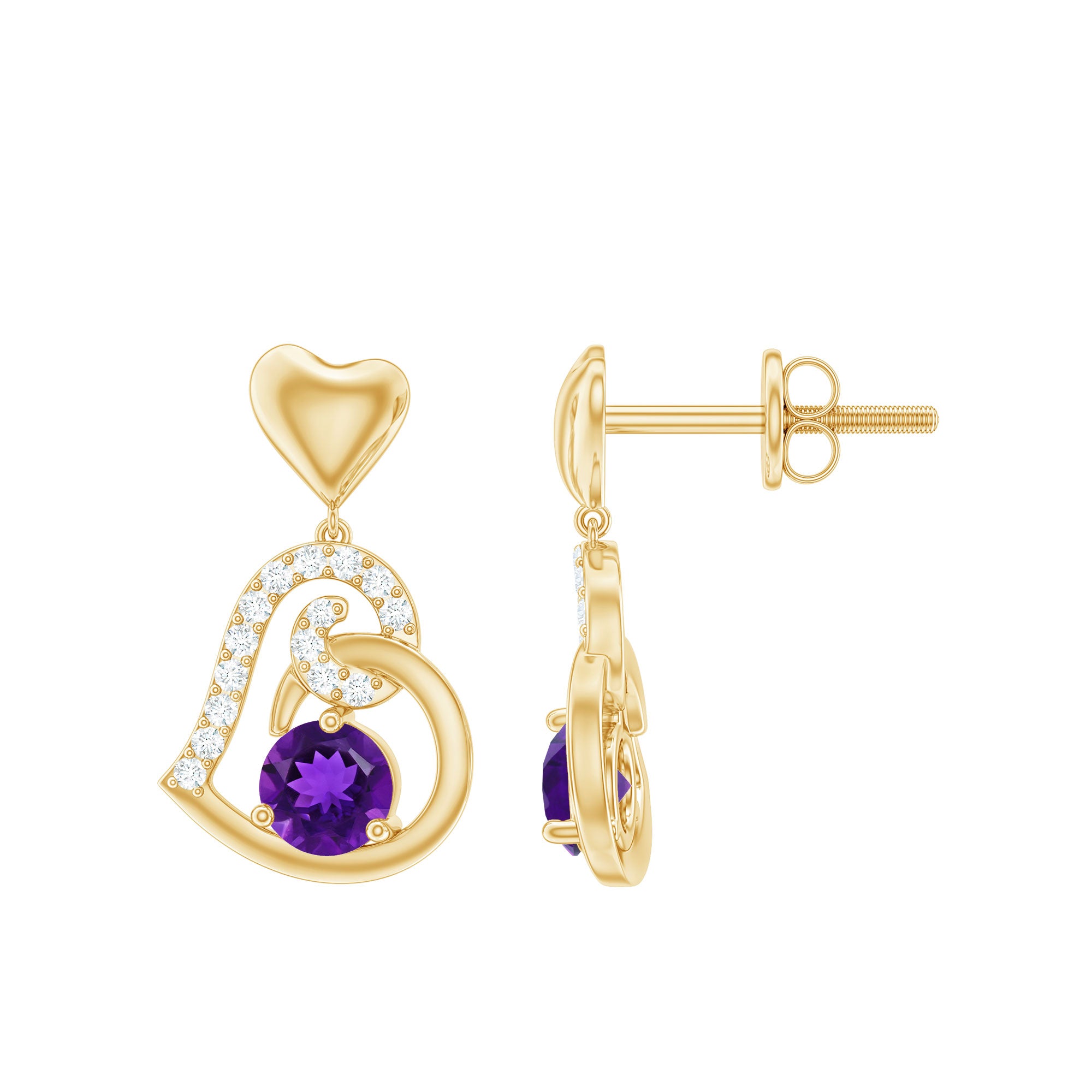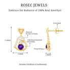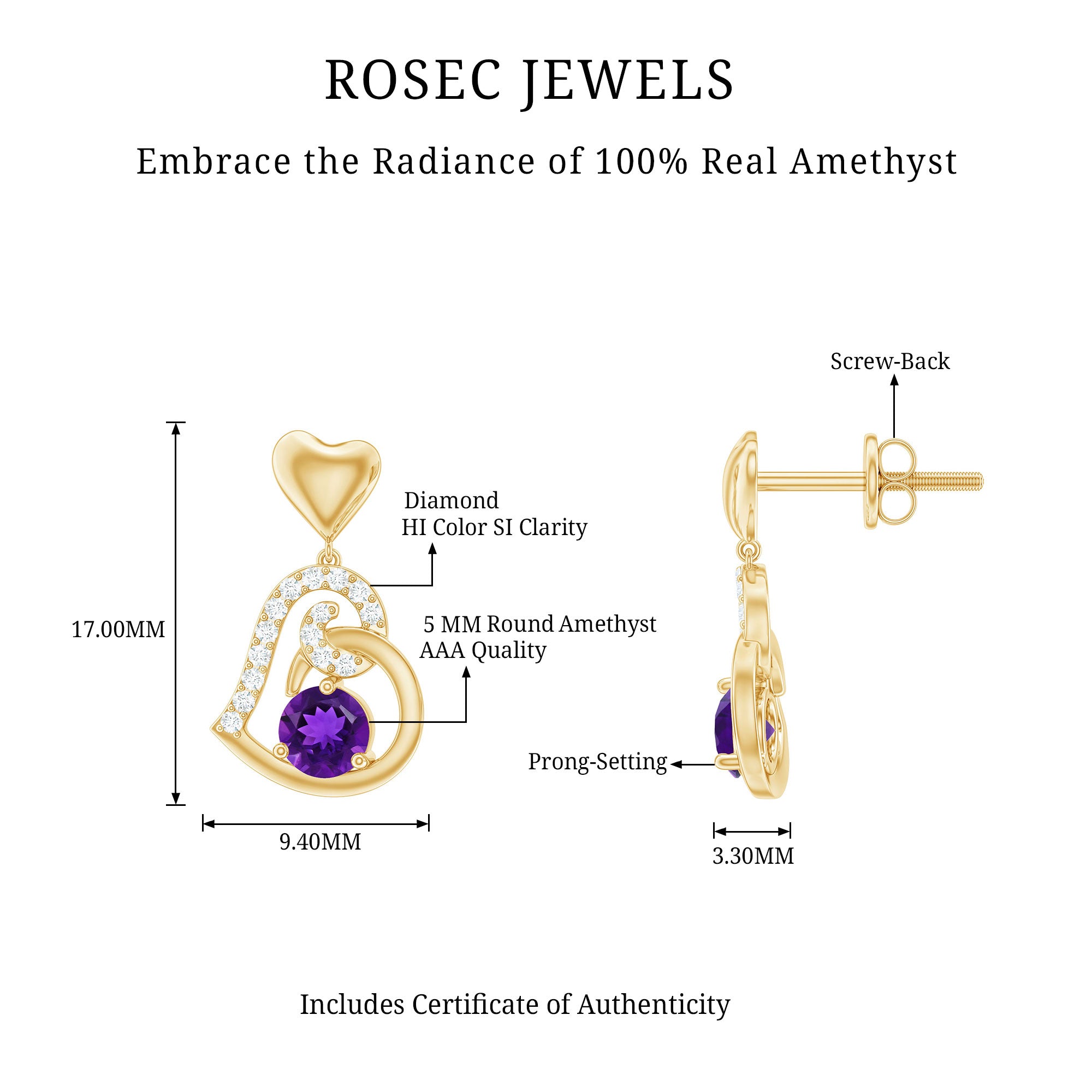 Present these Heart Drop Earrings as a sparkling testament to love, elegance and timeless beauty. Each earring features a 5 mm Round Shape Amethyst placed in an open heart frame, delicately lined with dazzling Diamond stones that catch the light with every movement. Dangling gracefully from a heart motif, these Amethyst Drop Earrings create a romantic cascade of shimmer, perfectly capturing the essence of affection and devotion. The rich purple hue of the Amethyst symbolizes passion and wisdom, while the sparkling Diamond stones add a touch of celestial brilliance, making these Amethyst Heart Earrings a captivating statement for any occasion. Crafted with a secure Screw Back Closure, they offer comfort without compromising style, allowing her to wear them all day or night with confidence. Beautifully presented in a signature jewelry box, these Amethyst Earrings for Women make an unforgettable gift for anniversaries, birthdays or simply as a heartfelt surprise. Romantic, sophisticated and endlessly versatile, these Amethyst Diamond Earrings are a celebration of love and a timeless treasure designed to make her heart flutter every time they catch the light.