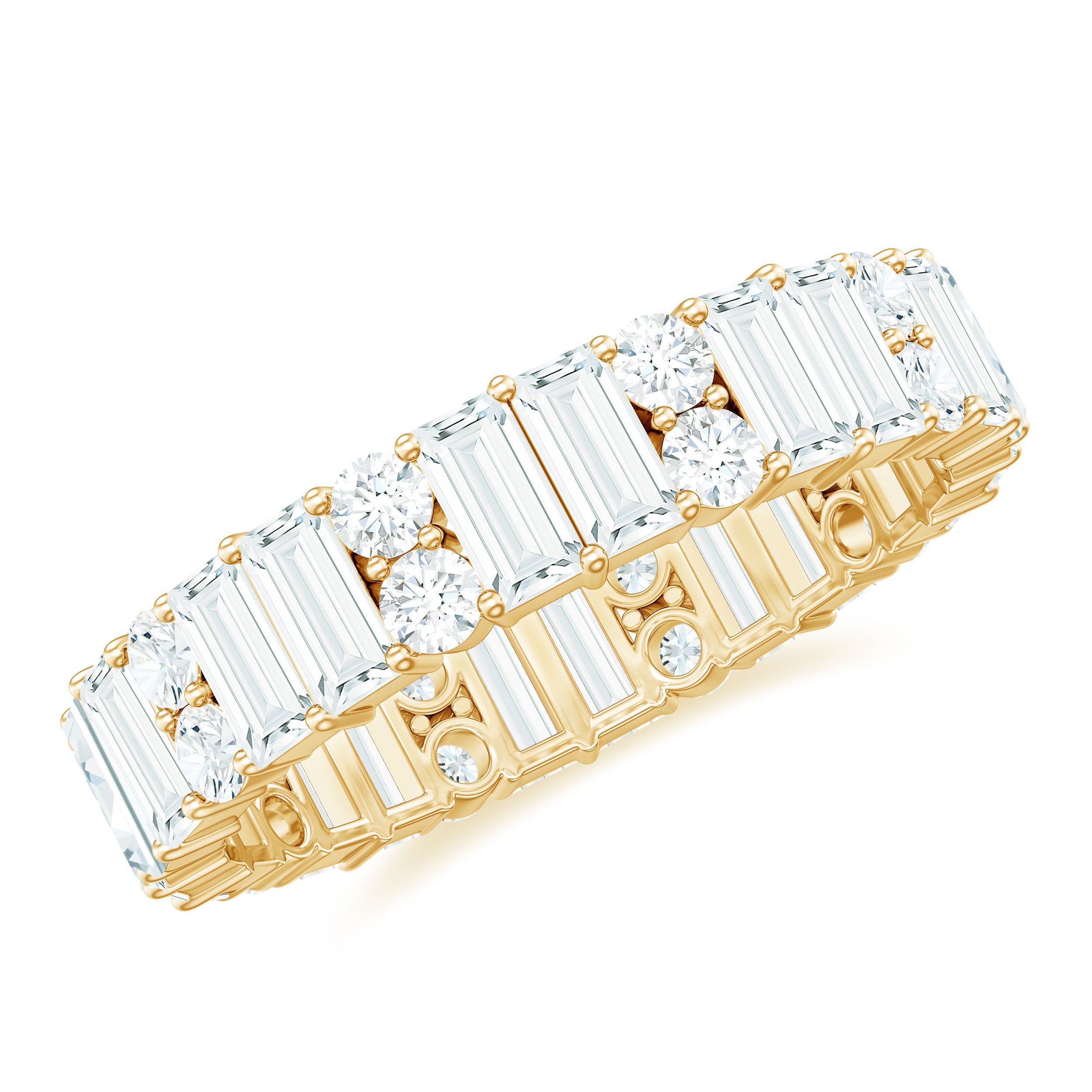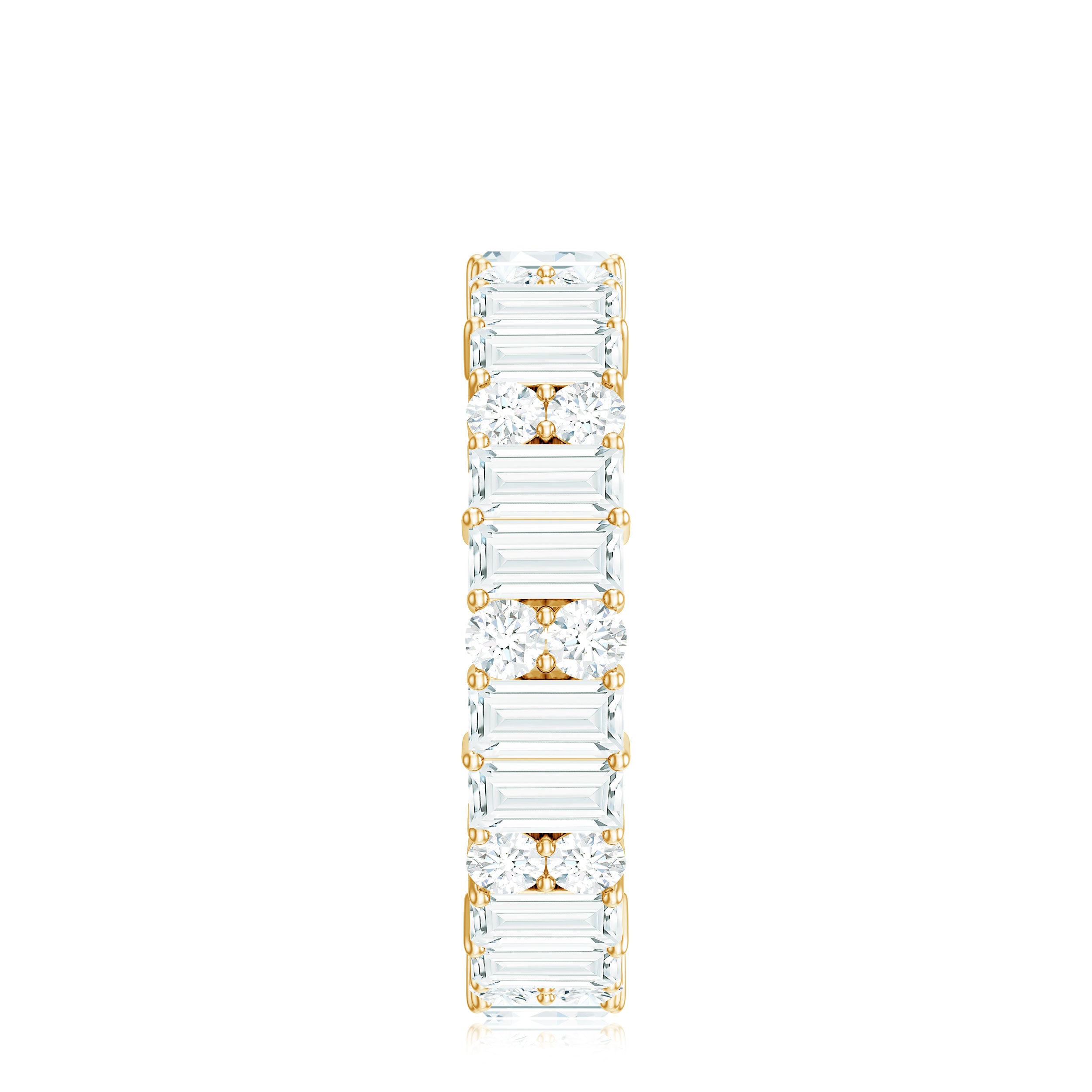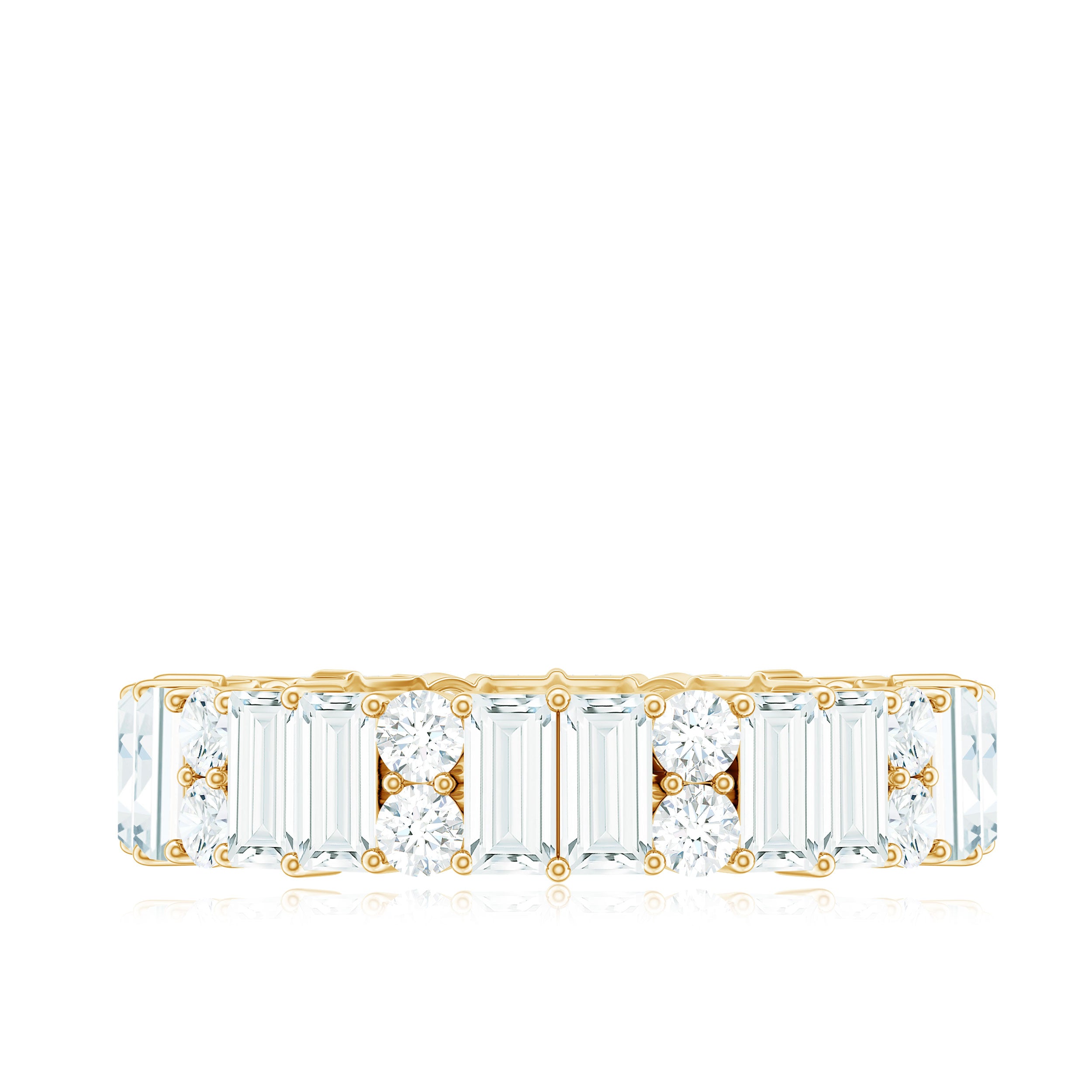 Unbroken, unending, unforgettable - this Moissanite Wedding Band is more than a symbol, it is a promise. A timeless expression of love without end, this Full Eternity Band is crafted with refined brilliance and enduring elegance. Featuring an exquisite arrangement of baguette and round cut moissanite stones, each gem is hand selected for its impeccable D color and VS1 clarity. The result is a radiant band that reflects not only light but the depth of your devotion. Set in a safe prong setting, the stones are positioned to capture light from every angle, ensuring a luminous display that captivates the eye. Its sophisticated design makes this Wedding Anniversary Band versatile enough to wear solo for a classic statement or stacked with an engagement ring or other bands for added dimension and drama. More than a piece of jewelry, this Moissanite Eternity Band serves as a lasting reminder of milestones, whether you are celebrating a wedding, anniversary, birthday, or a meaningful moment of self-love. Beautifully crafted and eternally significant, this ring transforms everyday wear into a celebration of what matters most.