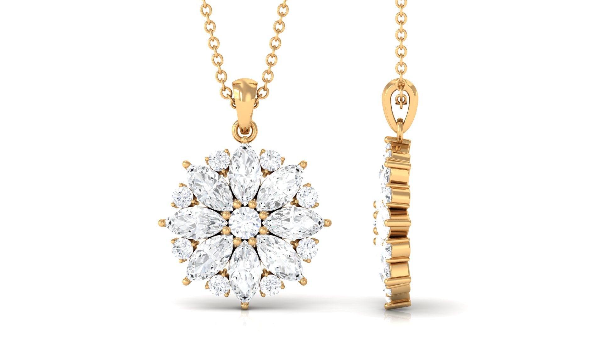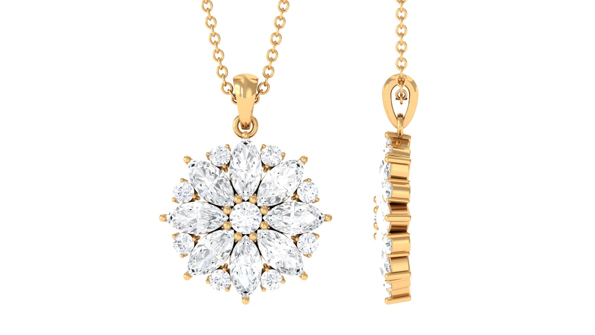 Enhance your look with a touch of timeless elegance by adorning yourself with this classic Moissanite Flower Pendant. Featuring a combination of Round and Marquise Cut Moissanite stones set in a secure prong setting, this pendant exudes sophistication and glamour. Crafted from solid gold and certified Moissanite, this statement pendant is a true reflection of your impeccable taste in jewelry. Celebrate your beauty and style with this exquisite Moissanite Pendant that is sure to make you stand out from the crowd.