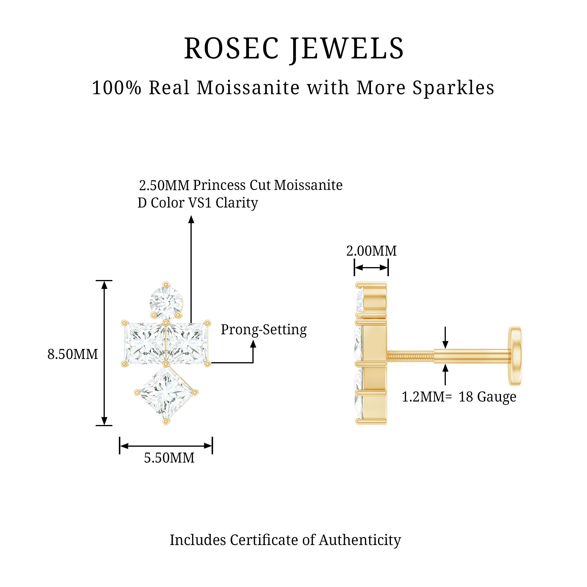 Make a statement with our stunning Cluster Helix Earring, adorned with Princess and Round Cut Moissanite in Prong Setting. This Moissanite Earring can be flaunted on your Rook, Conch, Tragus, Helix, or Cartilage piercings, adding a touch of elegance to your look. With a Flat Back Closure, this Helix Piercing stays securely in place. Each moissanite is carefully selected for its D color and VS1 clarity, giving the piece a radiant glow that enhances your natural elegance. The compact profile makes this Moissanite Cartilage Earring ideal for mixing and matching with other studs or hoops, allowing you to curate a personalized ear stack that reflects your style. Whether paired with casual outfits or styled for a night out, this ear piercing earring adds a sparkle. Perfect for those who value fine details and subtle elegance, this Cluster Earring adds a lovely touch of brilliance to any jewelry collection. To make the experience complete, the Moissanite Piercing Earring arrives in a premium jewelry box and includes a certificate of authenticity for added confidence and value.