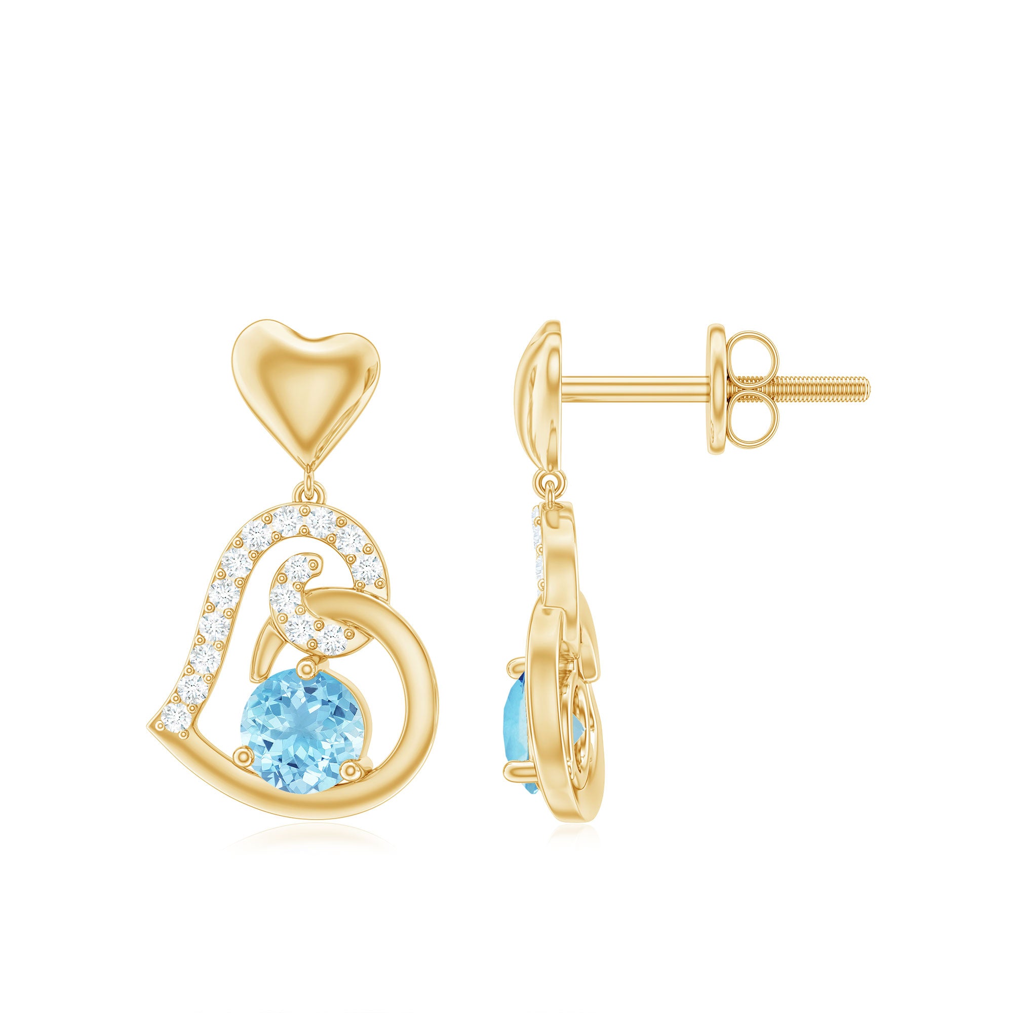 Representing everlasting love and devotion, these Heart Drop Earrings are a perfect blend of elegance, romance and sparkle. Each earring features a delicate Heart motif, from which dangles an Open Heart frame lined with shimmering Diamond stones, featuring a 4 mm Aquamarine at its center. The soft blue of the Aquamarine evokes serenity and devotion, while the Diamond stones catch the light with every movement, creating a captivating sparkle that draws the eye and stirs the heart. Secured with Screw Back Closure, these Aquamarine Diamond Earrings offer comfort and confidence for all-day wear, whether paired with a romantic evening gown or a chic daytime outfit. The graceful heart design symbolizes affection, commitment and the beauty of heartfelt connections, making them an ideal gift for a loved one or a treasured addition to your own jewelry collection. Presented in a signature jewelry box, these Aquamarine Drop Earrings are ready to delight and impress, transforming any moment into something truly special.