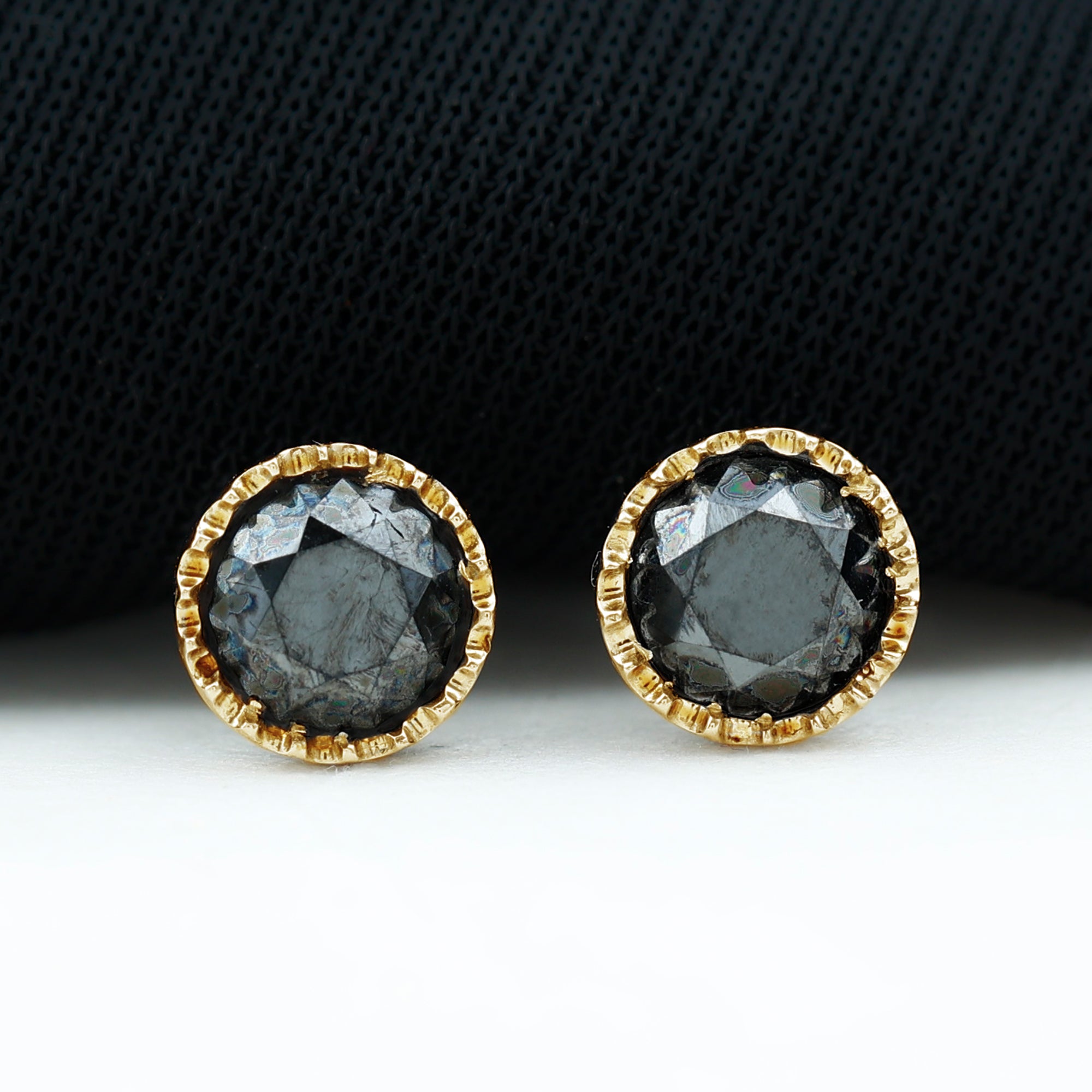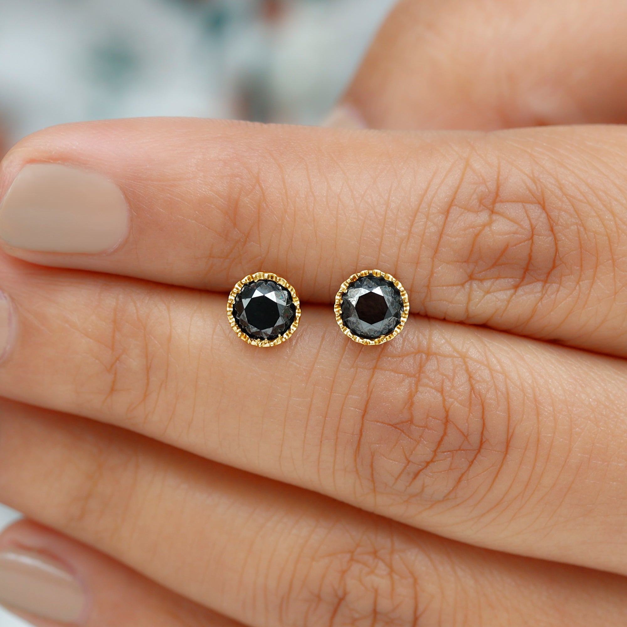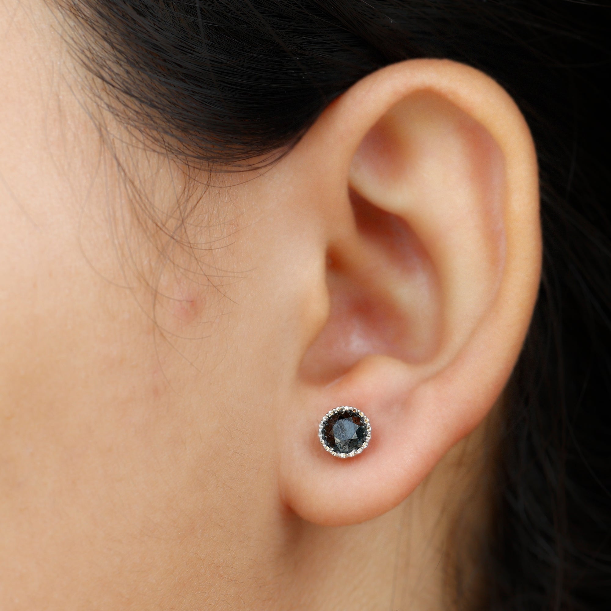 Round Black Diamond Gold Solitaire Stud Earring in Bezel Setting