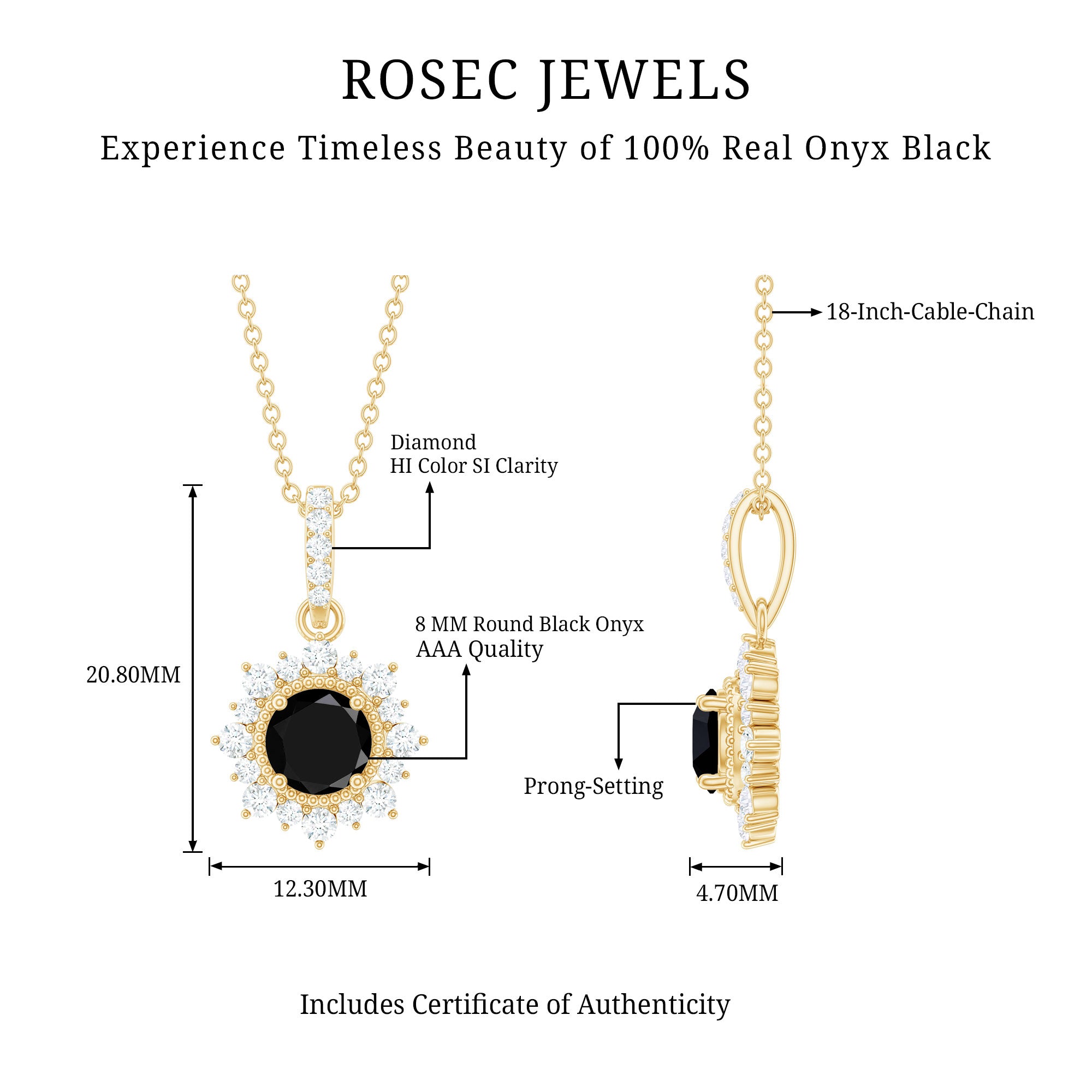 If youre searching for the perfect jewelry to wear on an evening date with your partner, look no further than this Black Onyx Pendant. Featuring a 7 MM Round Shape Black Onyx in a Prong Setting, with Gold Beaded Details and a Round Diamond Halo, this pendant necklace is simply stunning. The subtle yet elegant design will garner compliments when you wear it.