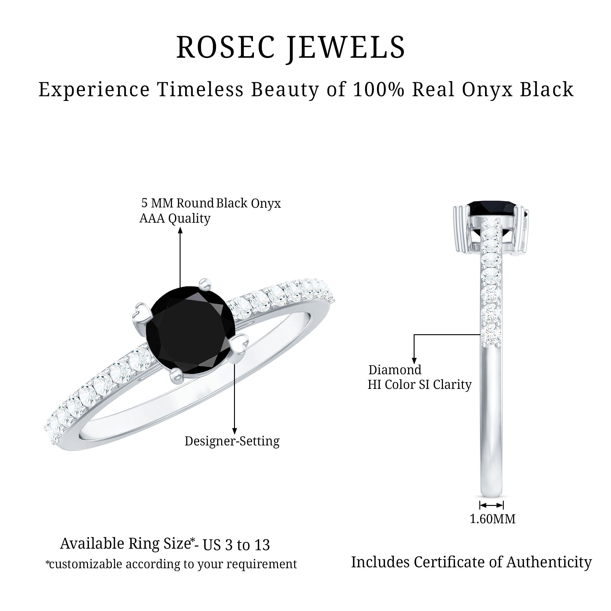 Let your love shine through the beauty of clean design with this charming Black Onyx Promise Ring. At the center of this meaningful piece is a 5 MM round cut Black Onyx of AAA quality. Set securely in designer setting, the black onyx captures attention while keeping the style understated and elegant. The band is detailed with sparkling round cut diamonds, each selected for their HI-SI quality, offering a gentle shine that complements the bold center stone. The mix of black onyx and bright diamonds gives the Solitaire Promise Ring a modern and graceful look that is easy to wear every day. Thought to bring strength and protection, this Black Onyx and Diamond Ring is a thoughtful gift for your loved one. Whether it is for a promise, birthday, or simply to show someone they are loved, this Black and White Ring makes the message clear, your bond is strong and lasting. Lightweight, durable, and crafted with precision, this December Birthstone Ring offers lasting comfort and style. It comes beautifully packaged in an elegant jewelry box and is available in US sizes from 3 to 13. Romantic, elegant, and brimming with charm, this Onyx Solitaire Ring tells a love story wrapped around your hand.