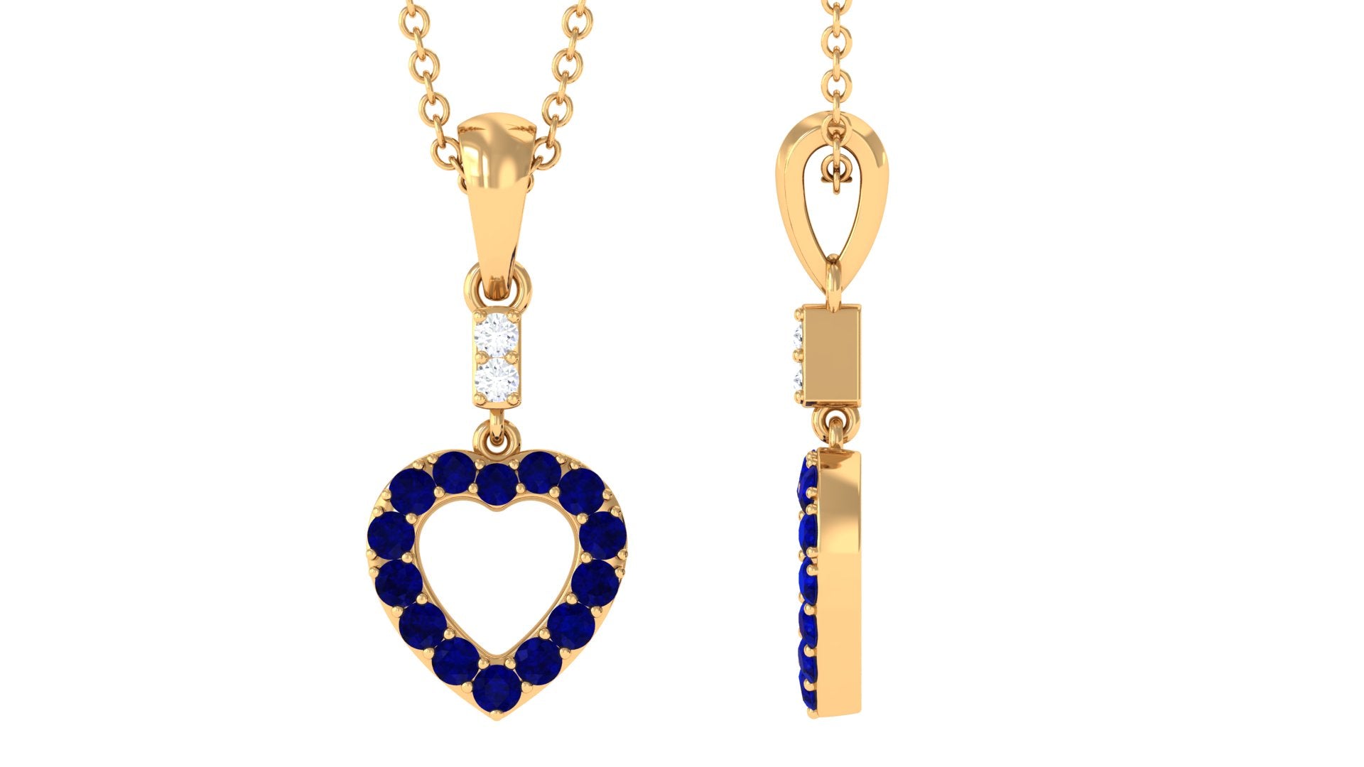 This elegant heart pendant features an open heart design adorned with round blue sapphire and accented with sparkling Moissanites. The contrast between the deep blue of the sapphire and the brilliance of the Moissanite creates a stunning visual effect, while the delicate drop design adds movement and grace to the piece. Perfect for adding a touch of sophistication to any outfit, this pendant is a true expression of refined taste and style.