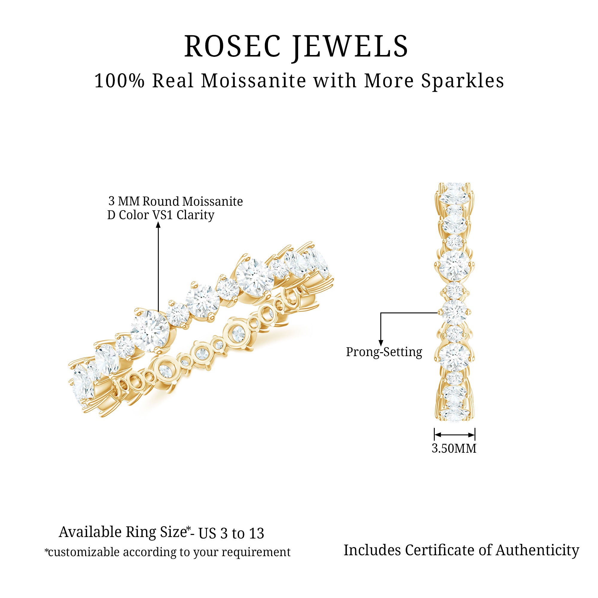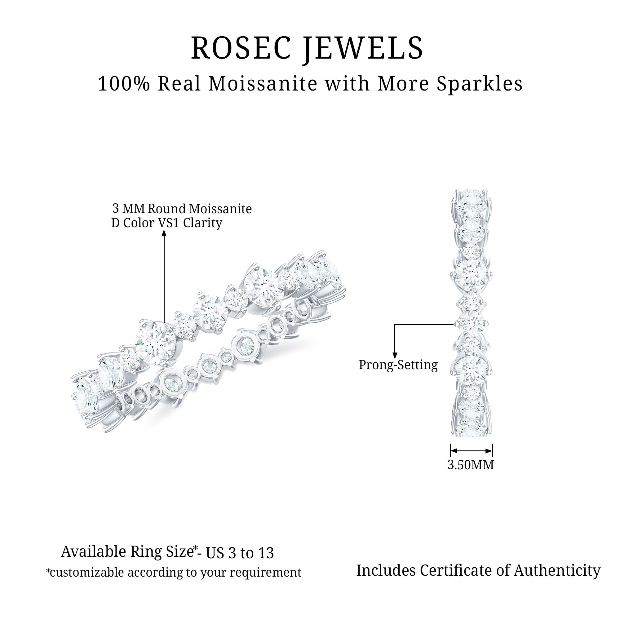 This beautiful Moissanite Eternity Ring perfectly combines elegance with simplicity. It is crafted for the woman who desires a touch of sparkle in her daily accessories. This Full Eternity Ring features various sizes of round cut moissanite stones, all arranged alternately in a secure prong setting to create a modern uneven pattern. You can wear this Moissanite Stackable Ring alone for a chic and sophisticated look, or stack it with another ring to create a distinctive style. The moissanite stones exhibit D Color and VS1 Clarity, providing you with the same brilliance and durability as mined diamonds, but at a more affordable price. Whether you are celebrating a wedding, an anniversary, or simply attending a formal event or casual dinner, this Moissanite Anniversary Ring delivers a perfect blend of simplicity and timeless elegance. This Moissanite Wedding Band includes a certificate of authenticity and a signature jewelry box, allowing you to keep your ring safe when not in use. Additionally, with customization options available, you can make this Eternity Wedding Band truly unique.
