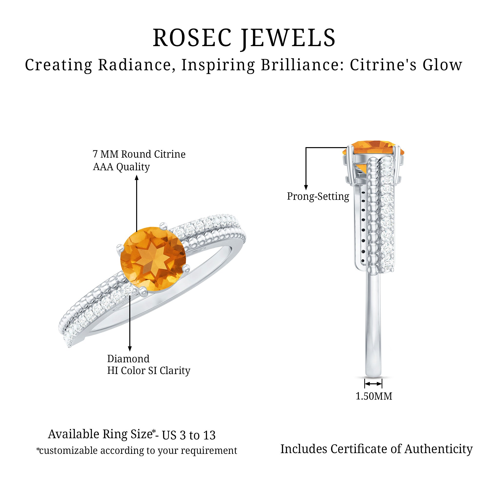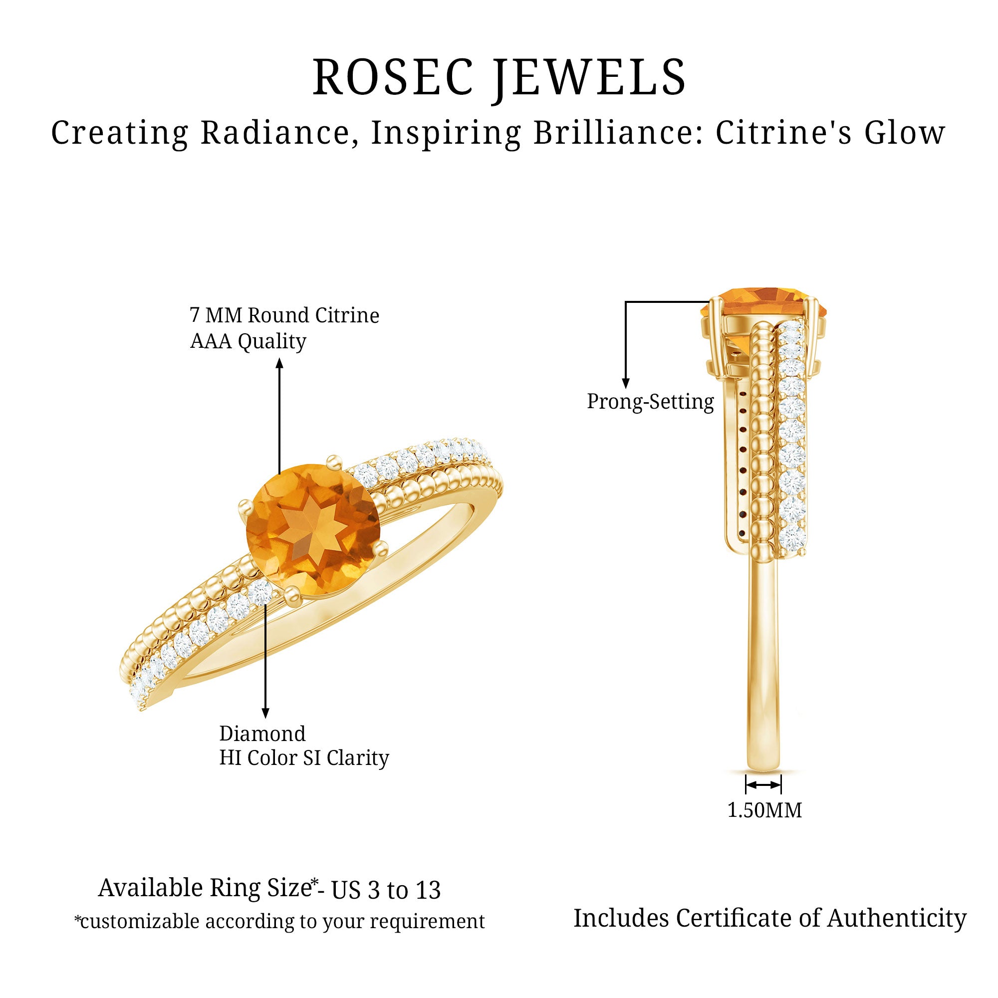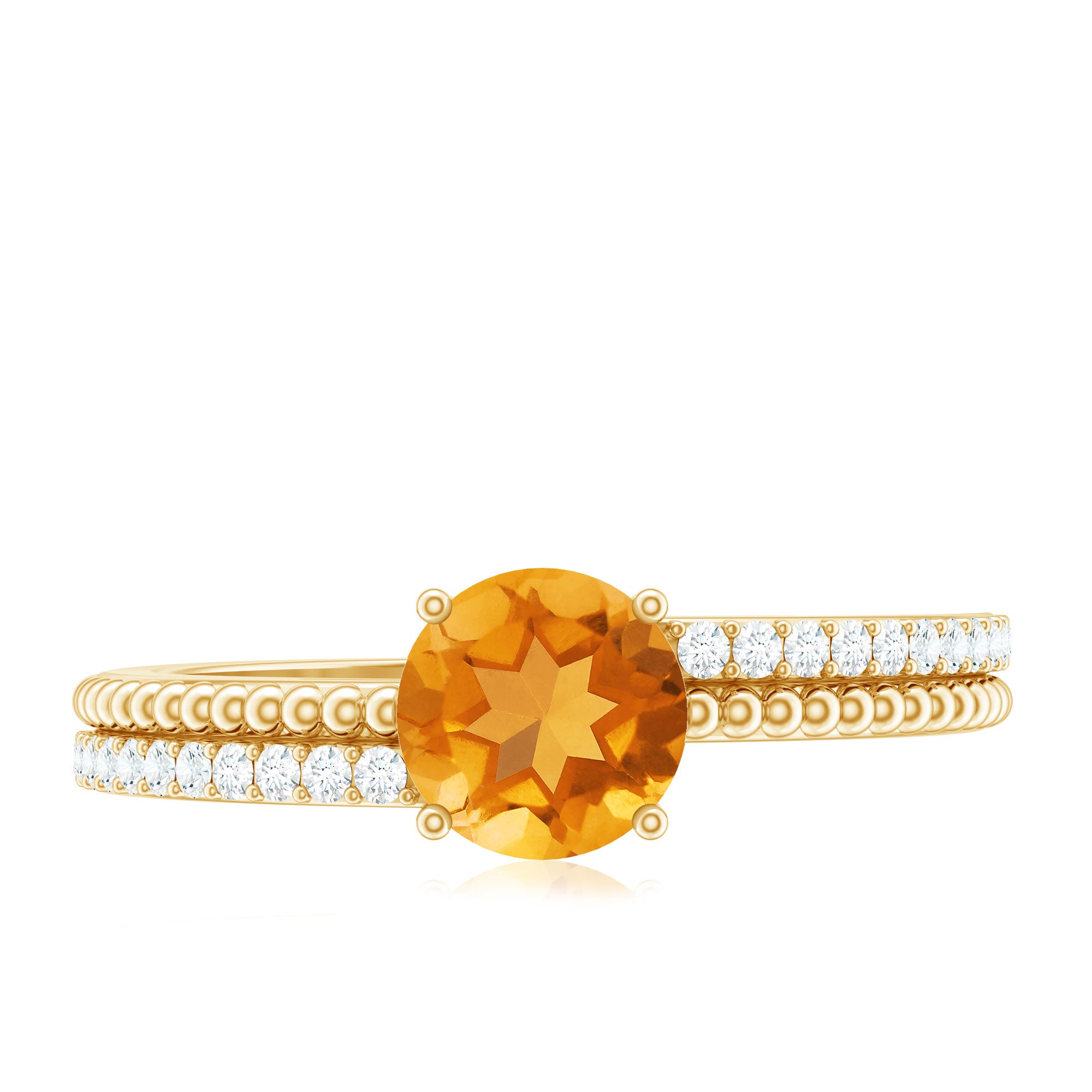 Turn heads with this Solitaire Engagement Ring, a piece that radiates elegance, charm and heartfelt romance. At its center, a brilliant citrine gemstone glows with a warm, golden hue, symbolizing the bright future you will share together. Flanked by sparkling Diamond Side Stones, the center gem is beautifully framed, adding just the right touch of sparkle to highlight its natural beauty. The delicate Beaded work along the band adds texture and a vintage inspired elegance, making every angle of the ring captivating and unique. Designed for someone who loves classic sophistication with thoughtful details, this Citrine Engagement Ring feels personal, timeless and full of meaning. Whether marking a proposal, celebrating a milestone or expressing a promise of forever, this Citrine Diamond Ring is a symbol of love that will be cherished every day. This Yellow Citrine Ring comes in a signature jewelry box and is available in various ring sizes, ensuring a perfect fit for your special moment.