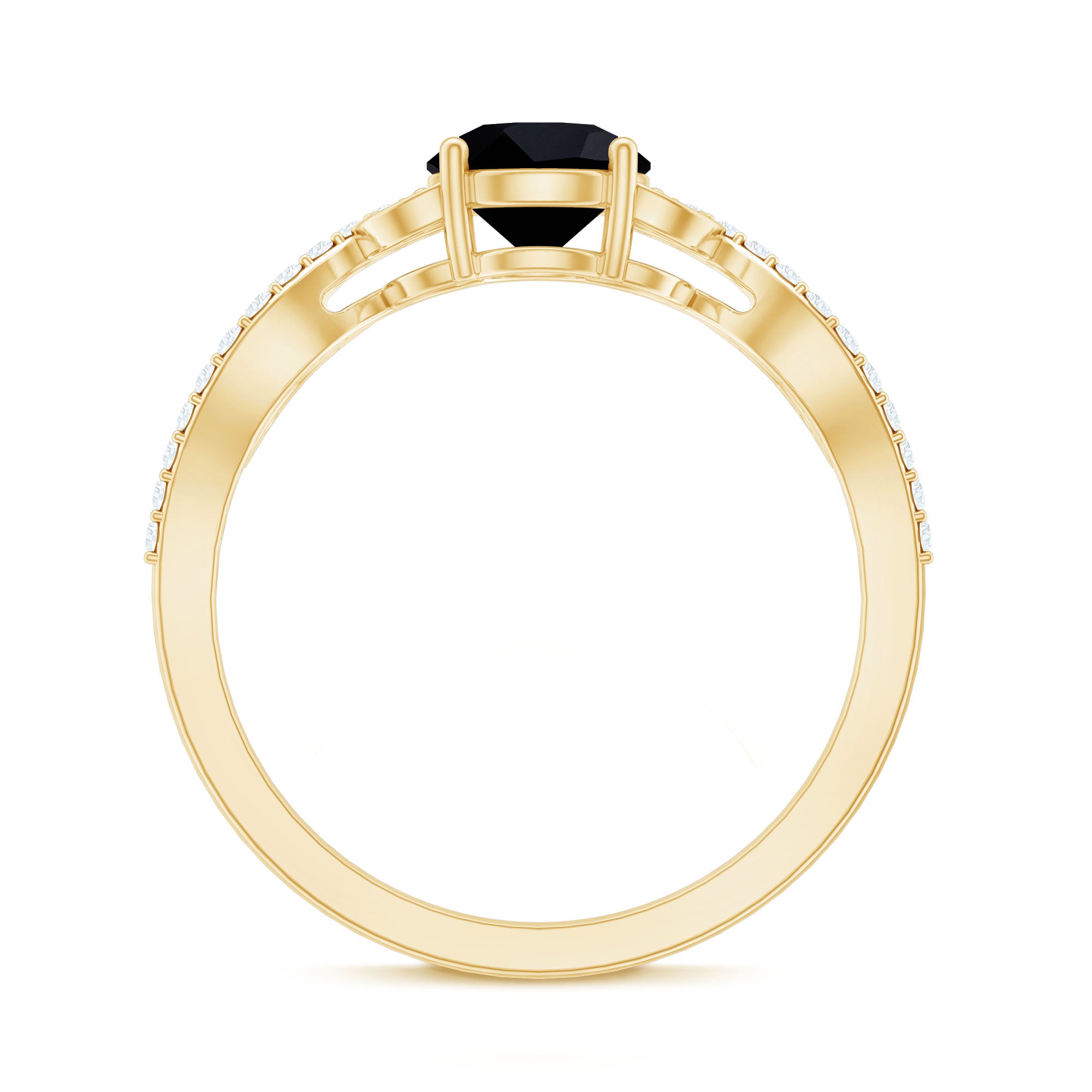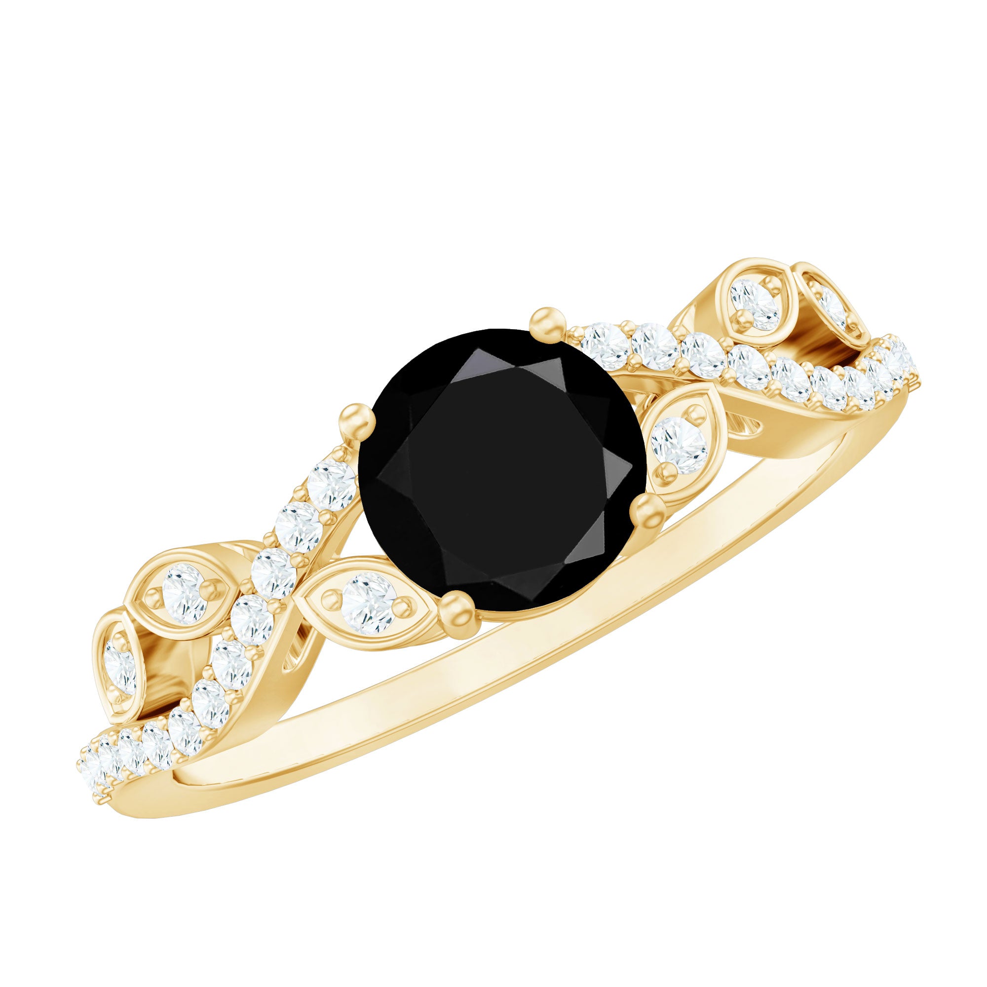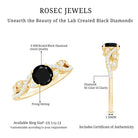 This stunning Created Black Diamond Engagement Ring features a striking round created Black Diamond as the center stone, and a unique leaf pattern made of sparkling Diamond stones on the shank. The intricate design is set on a sleek and elegant gold shank, making this Designer ring a truly one-of-a-kind piece of jewelry. Perfect for expressing love and commitment, this ring is sure to be cherished for years to come.