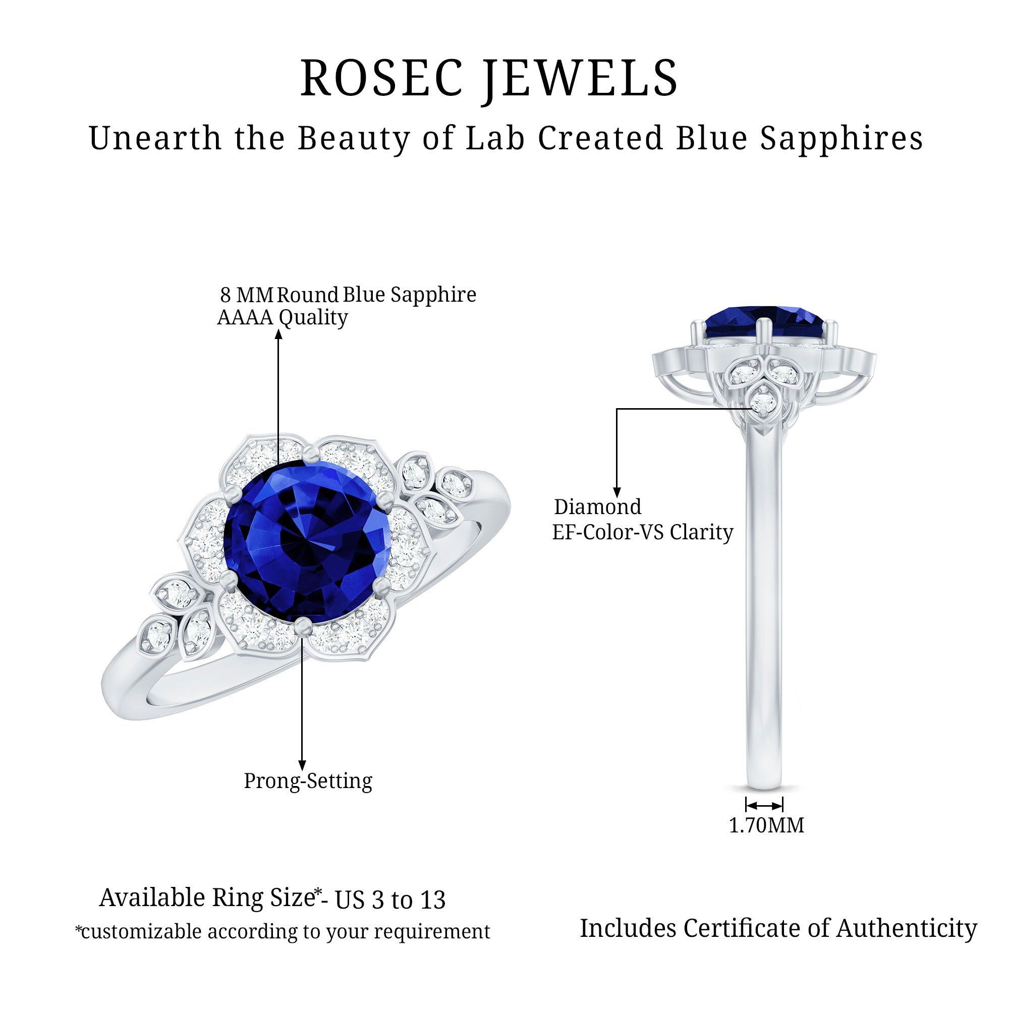 This Flower Engagement Ring is like a nature-inspired work of art. In the middle, theres a vibrant 8 mm round shaped blue sapphire (lab grown), surrounded by a dainty halo of lab-grown diamonds that looks like a blooming flower. More stones on the sides add to the floral design, mirroring the details of a full garden. This Blue Sapphire and Diamond Ring is more than just jewelry; it symbolizes commitment, with each part blending together like flower petals a lasting symbol of love and natural beauty.