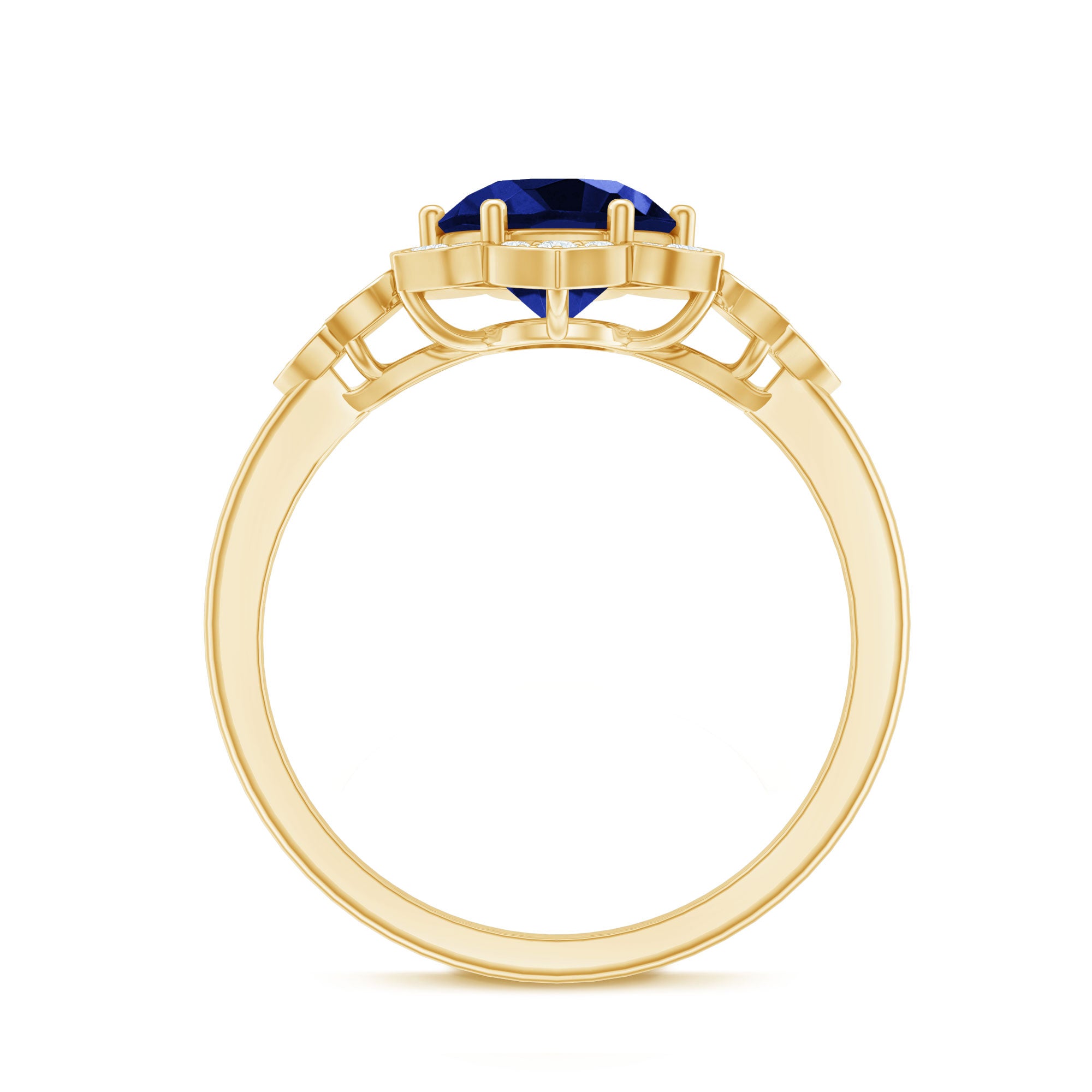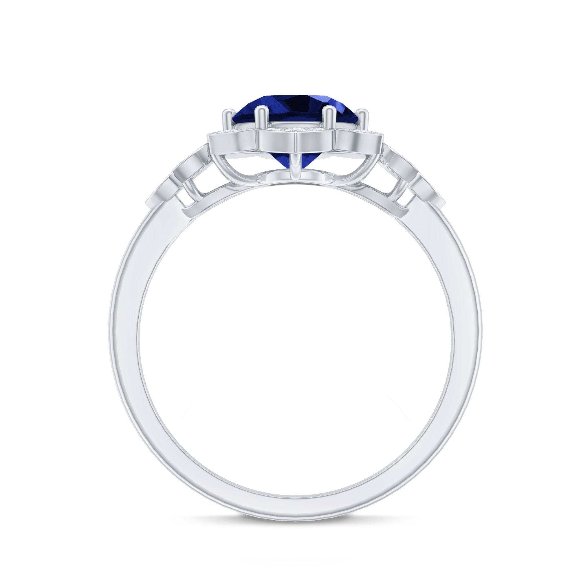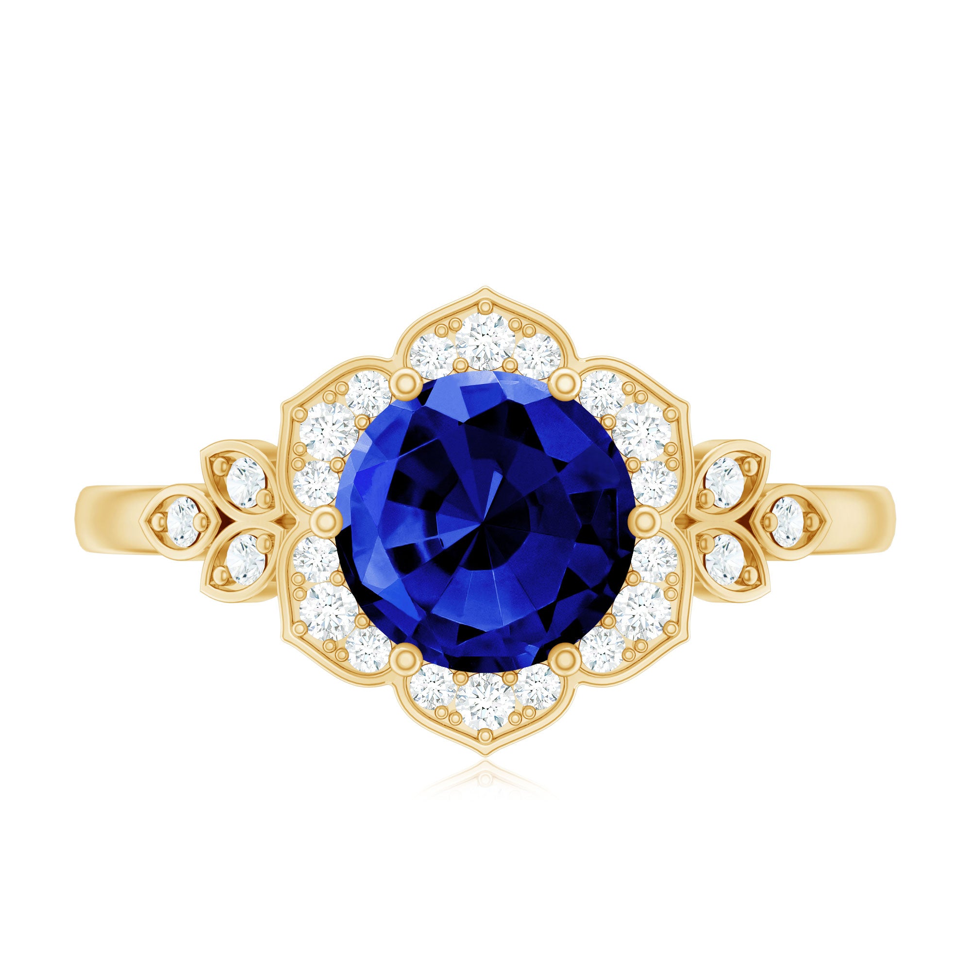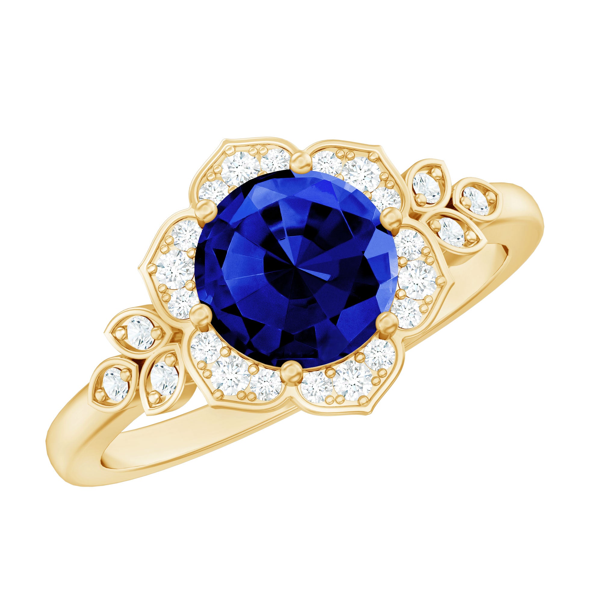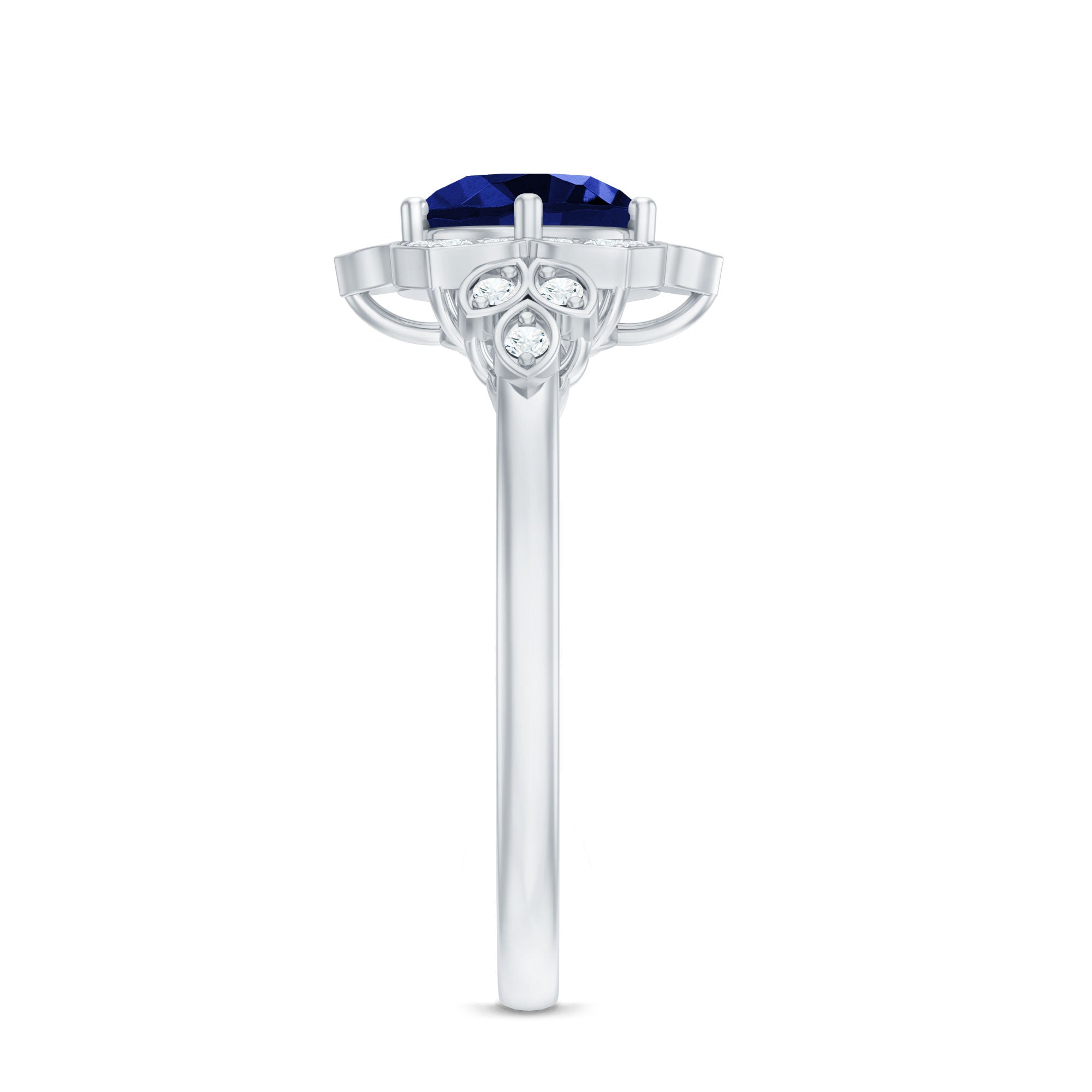 Round Created Blue Sapphire Flower Engagement Ring with Diamond