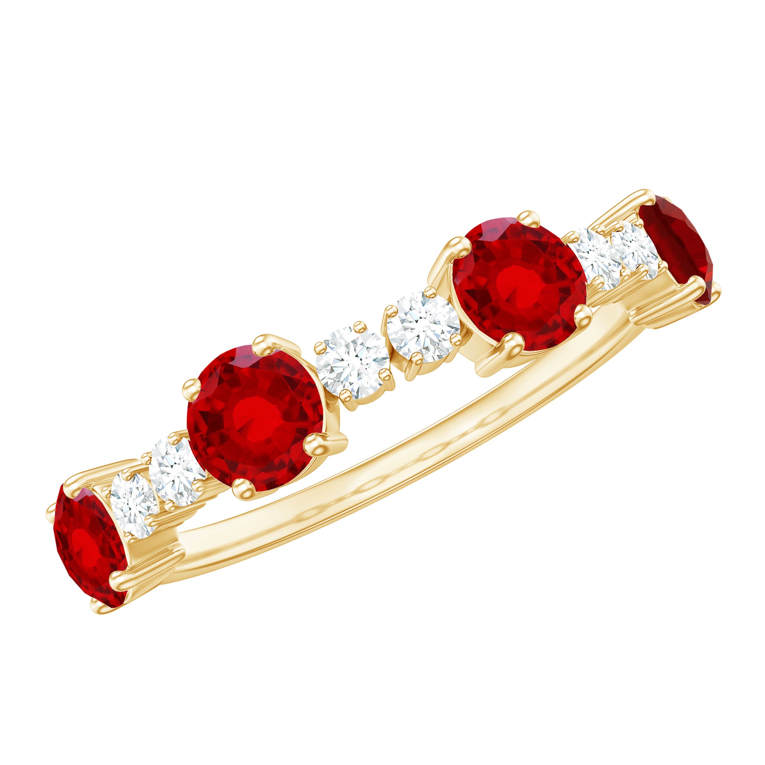 This is a stunning half eternity ring featuring round created ruby and Diamond stones that alternate along the band. The classic band ring is crafted in beautiful gold, giving it a luxurious and sophisticated look. The created ruby and Diamond are expertly set in the prong setting, adding a pop of color and sparkle. Whether youre looking for a special gift, or simply a new piece of jewelry to add to your collection, this round created ruby eternity ring in gold is a gorgeous choice.