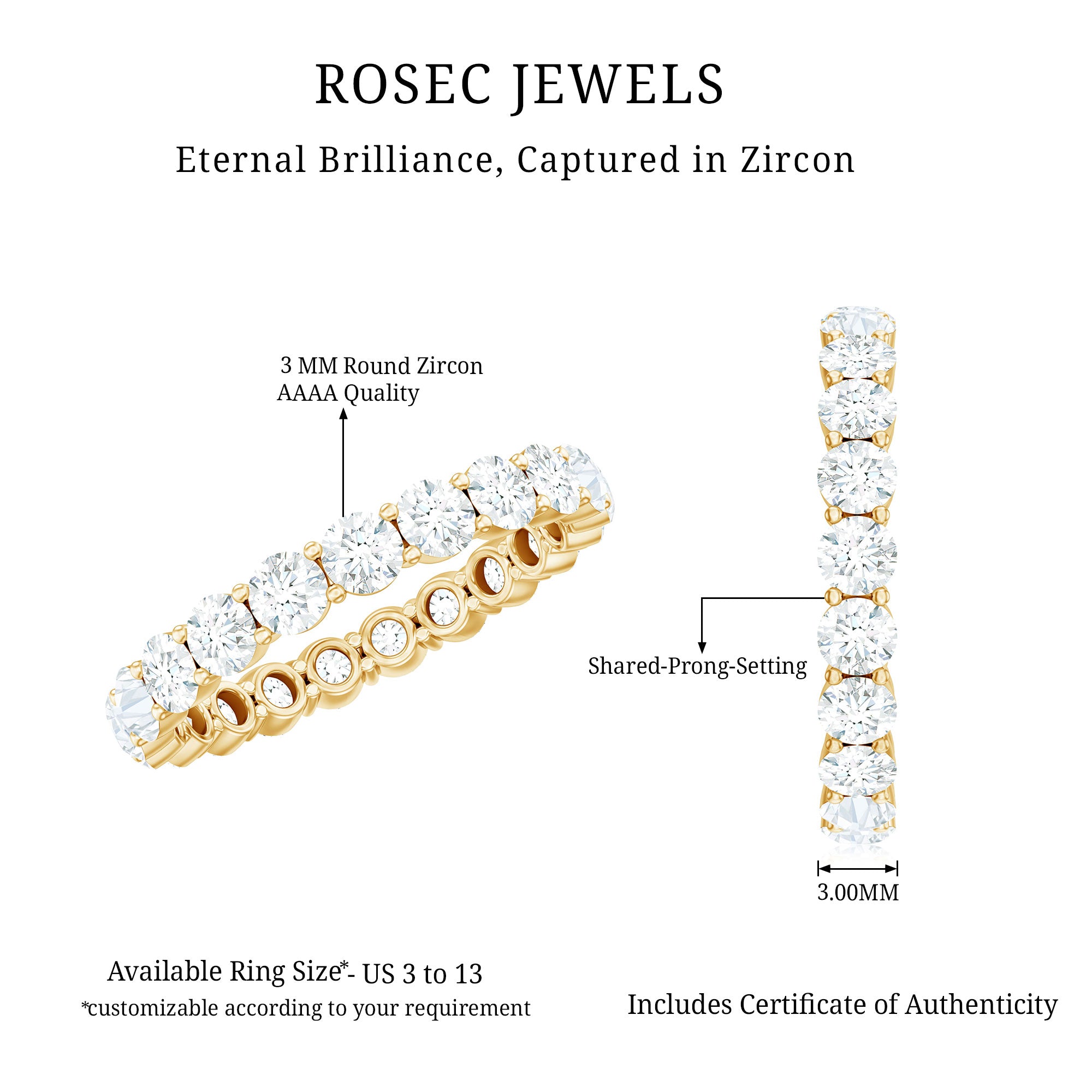 This exquisite full eternity band ring is set with round cubic zirconia stones arranged in a continuous line around the entire ring. The stones are held in place by a prong setting and the ring is crafted in a precious gold metal. The sparkling cubic zirconia stones and the warm, the gold creates a ring that is both stylish and timeless. Its classic design and high-quality materials make it a piece that youll treasure for years to come.